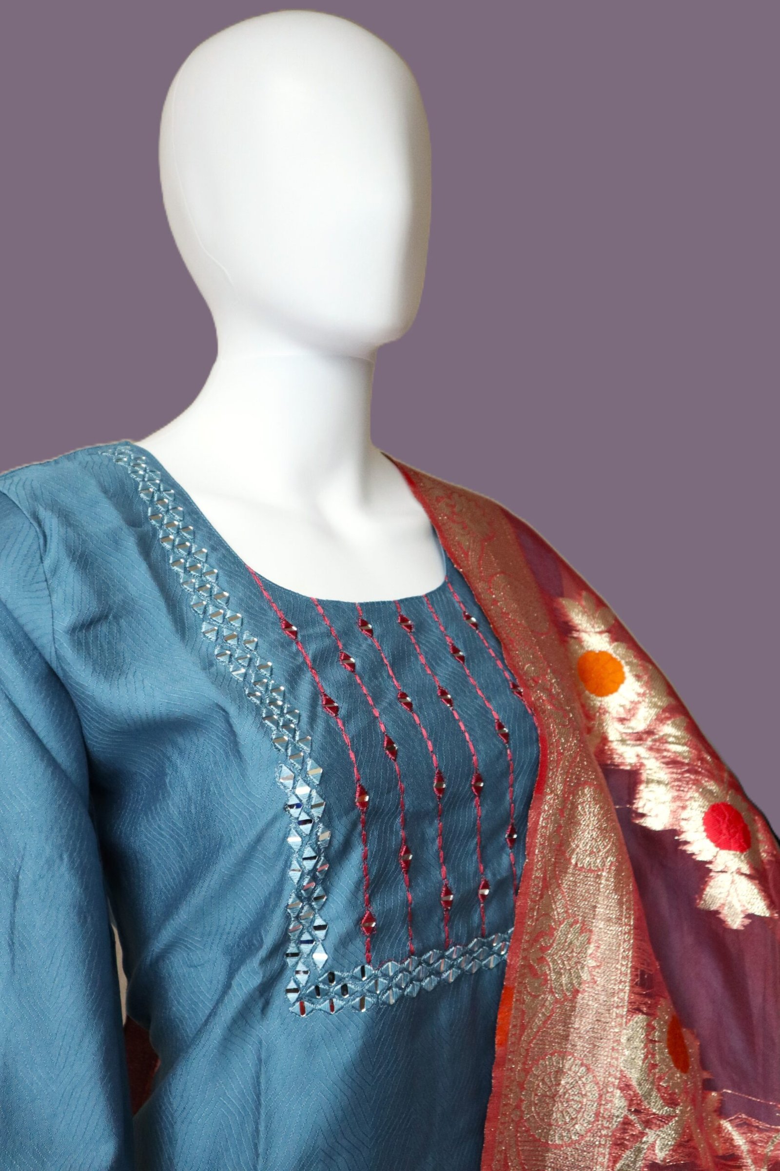• Color: Blue Kurta, Maroon Pants, Multicolor Dupatta