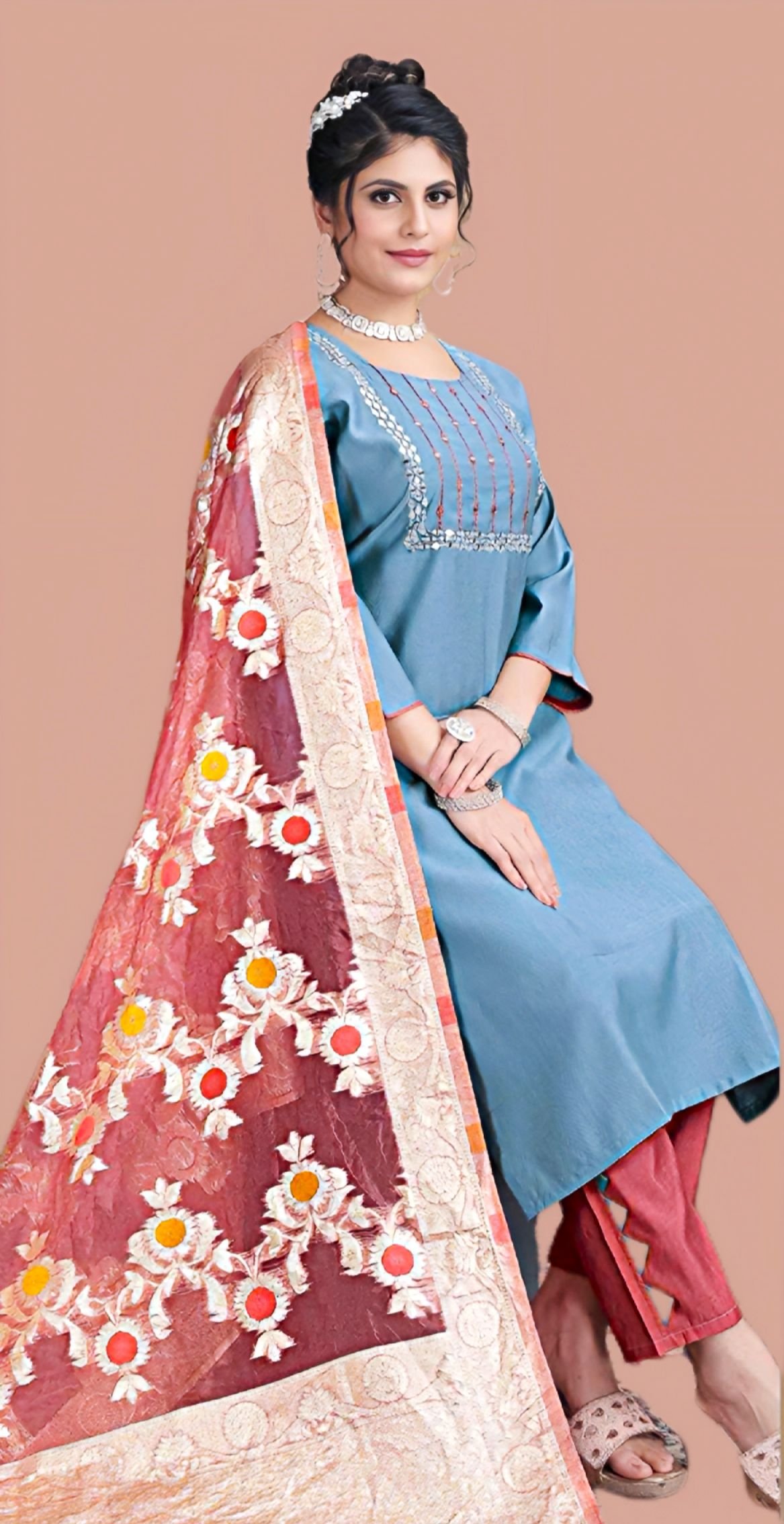 Step into timeless elegance with our blue Roman silk 3-piece suit set, beautifully paired with a vibrant embroidered dupatta. This ensemble features a sleek blue straight-cut kurta adorned with subtle mirror and thread detailing on the yoke, complemented by contrasting maroon straight pants with chic side accents. The highlight is the luxurious banarasi-style dupatta, embellished with intricate floral embroidery in gold and orange hues, adding a regal touch.