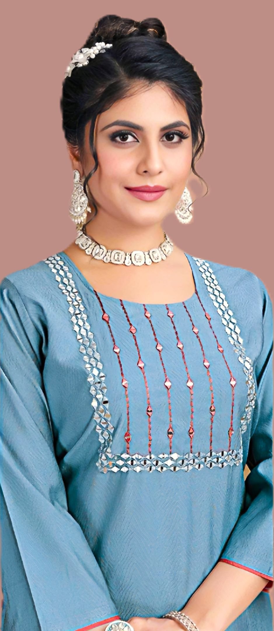 ✅ Detailed thread & mirror work on the neckline