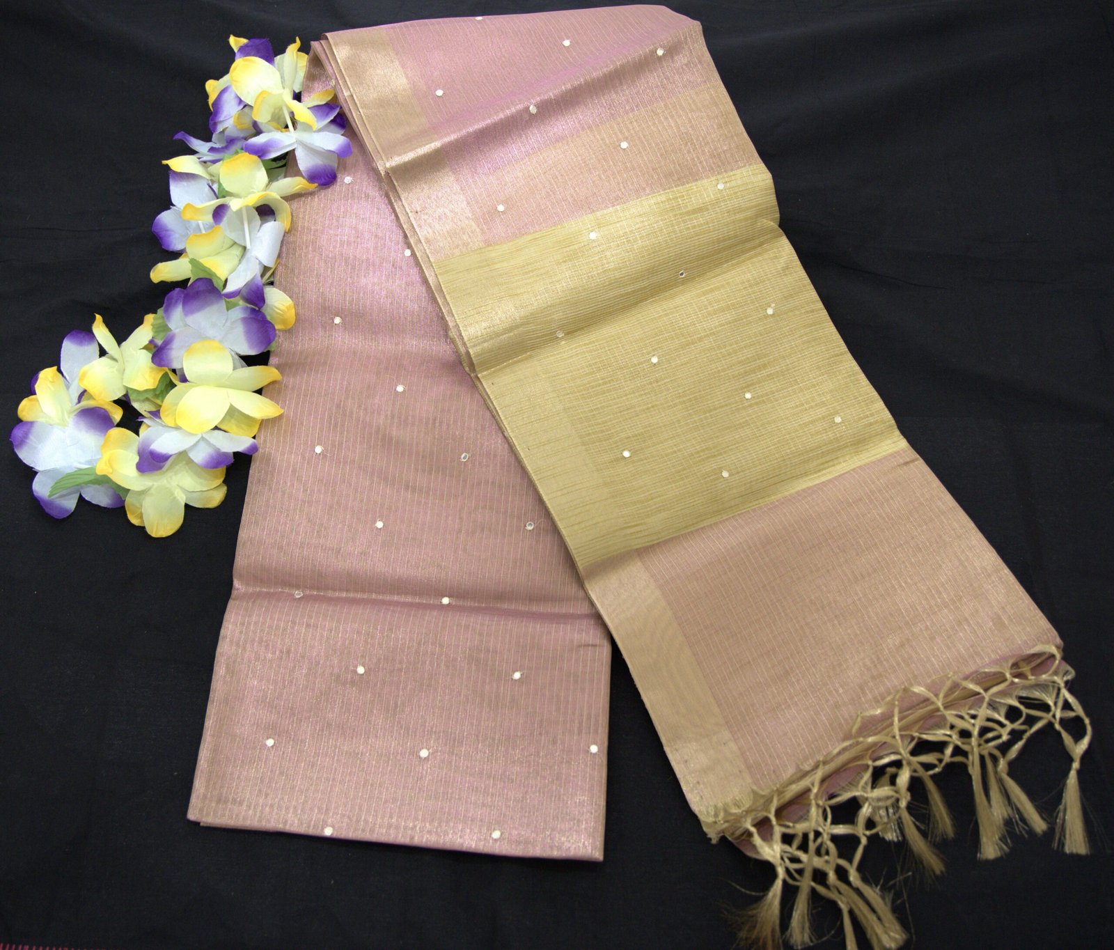 Step into understated elegance with this graceful blush pink soft tissue silk saree, perfect for festive occasions and sophisticated gatherings. Crafted from premium-quality soft tissue silk, this saree features a delicate shimmer that catches the light effortlessly, lending a regal charm to your appearance.