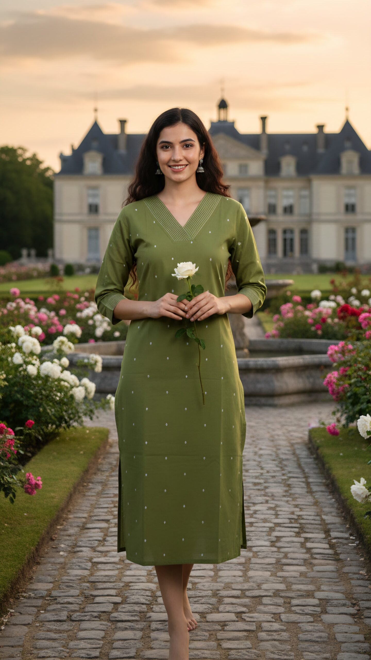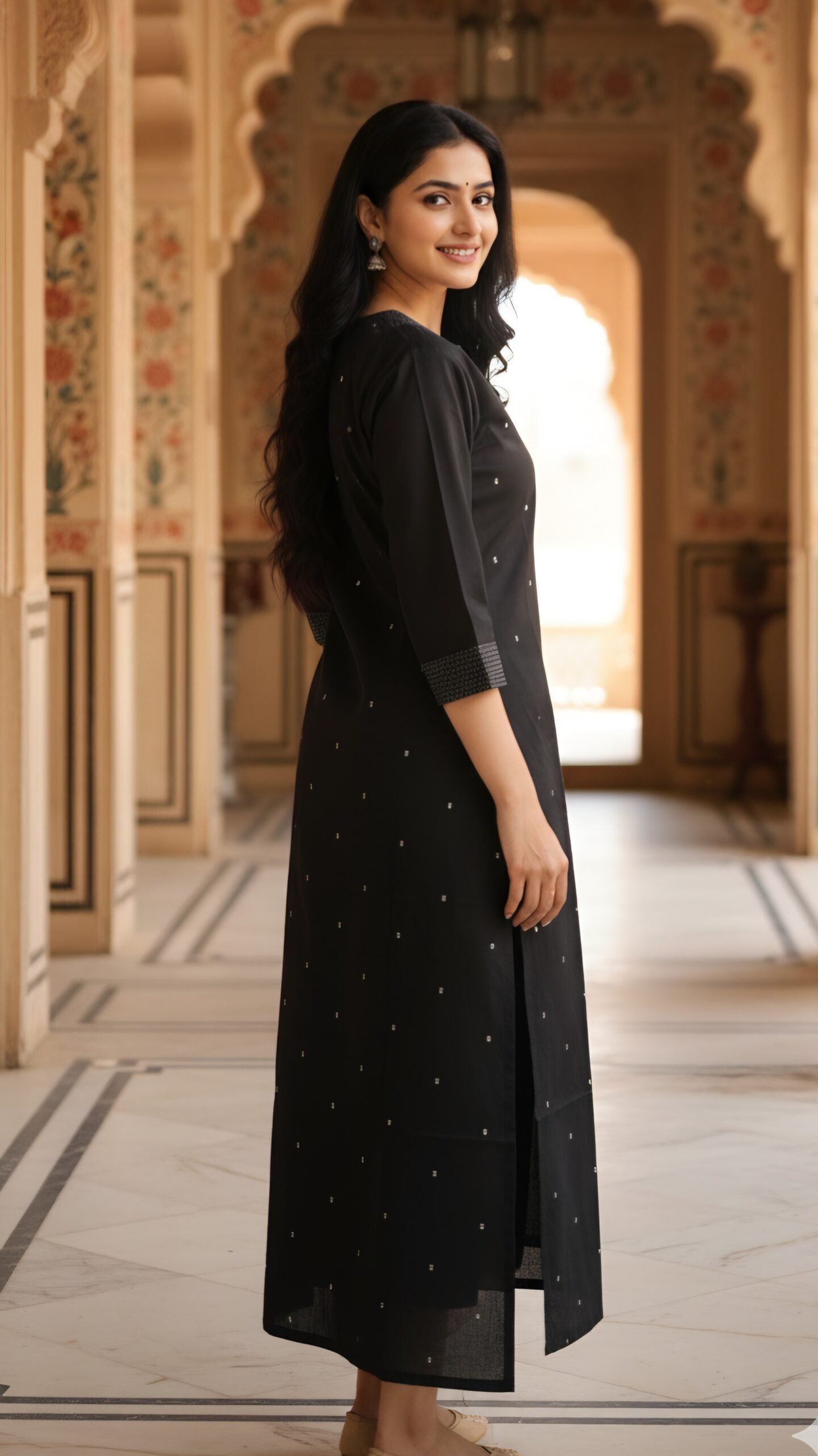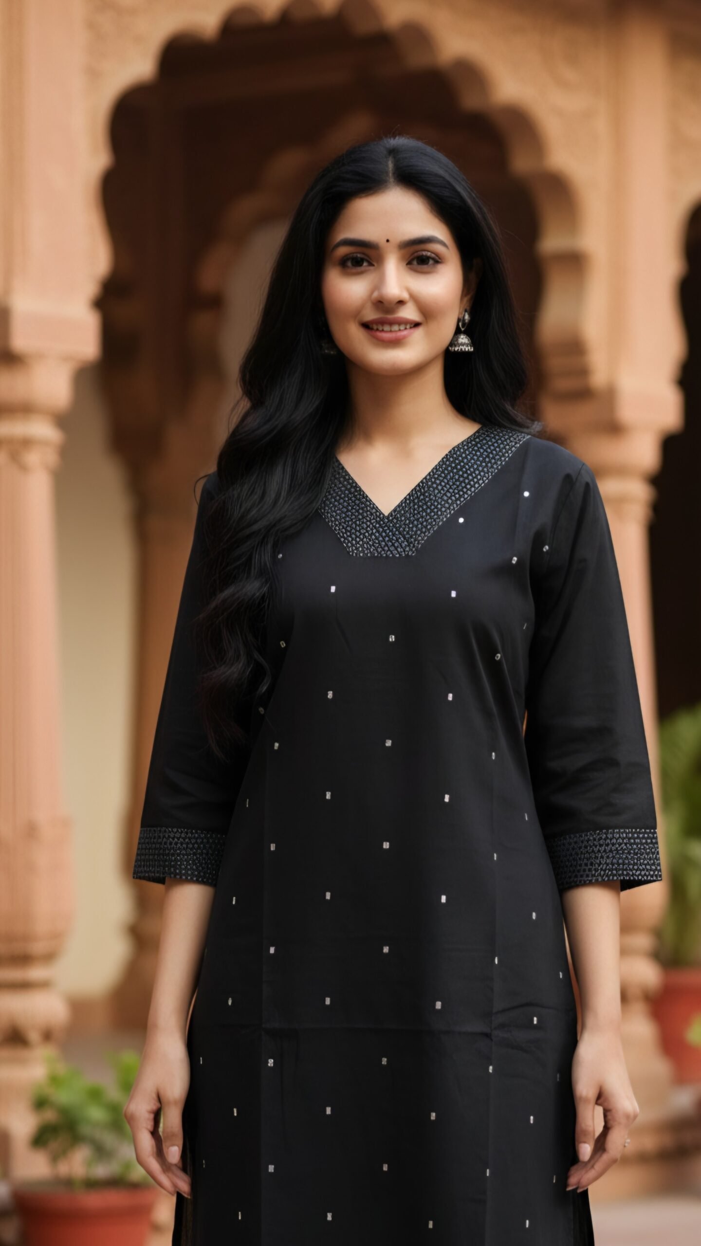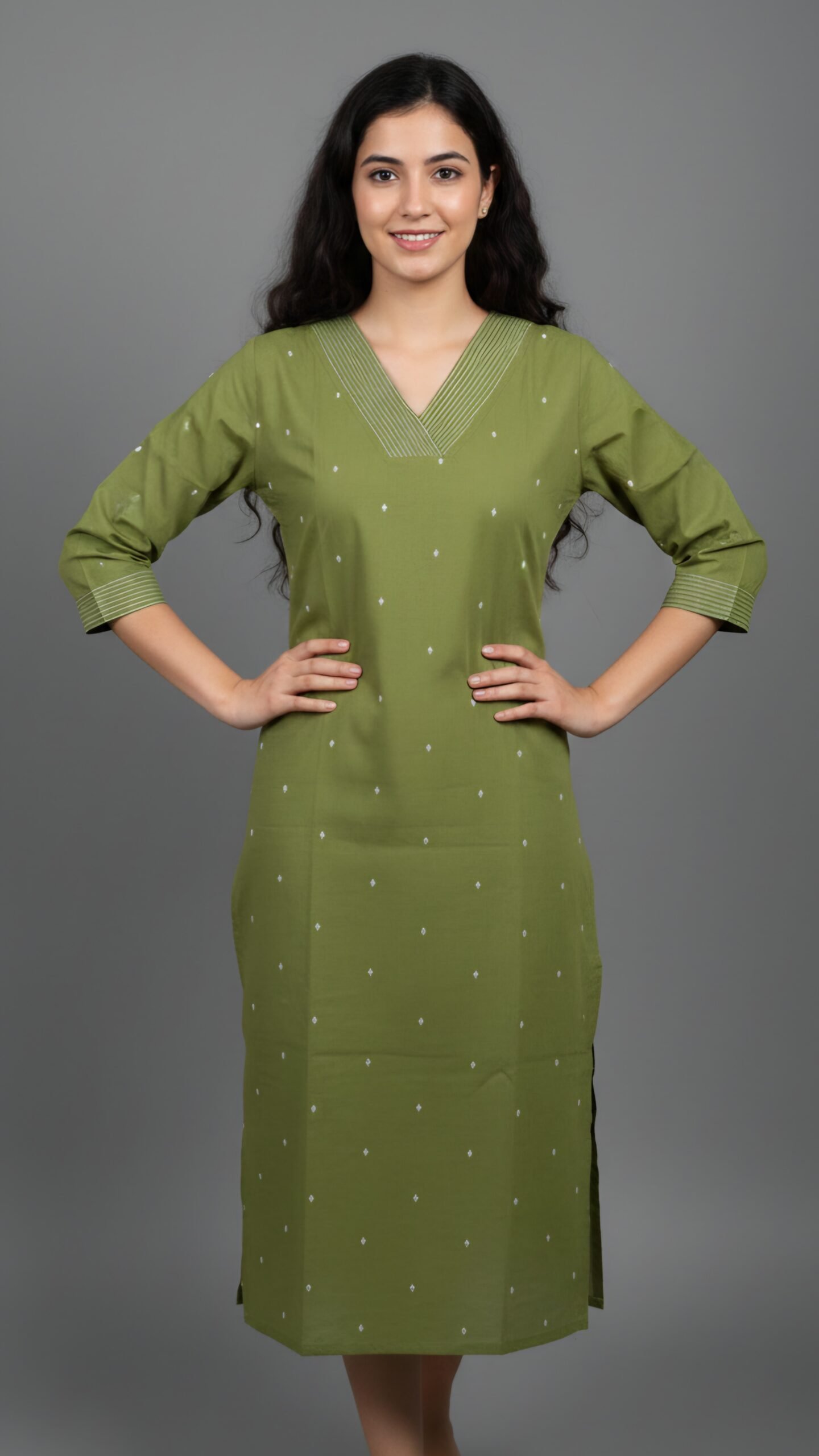 Featuring a stylish V-neckline with delicate pintuck detailing, subtle minimal thread embellishments, and three-quarter sleeves, this kurti is perfect for office wear, casual outings, festive gatherings, or daily wear. The straight-cut silhouette with side slits ensures a flattering fit for all body types.