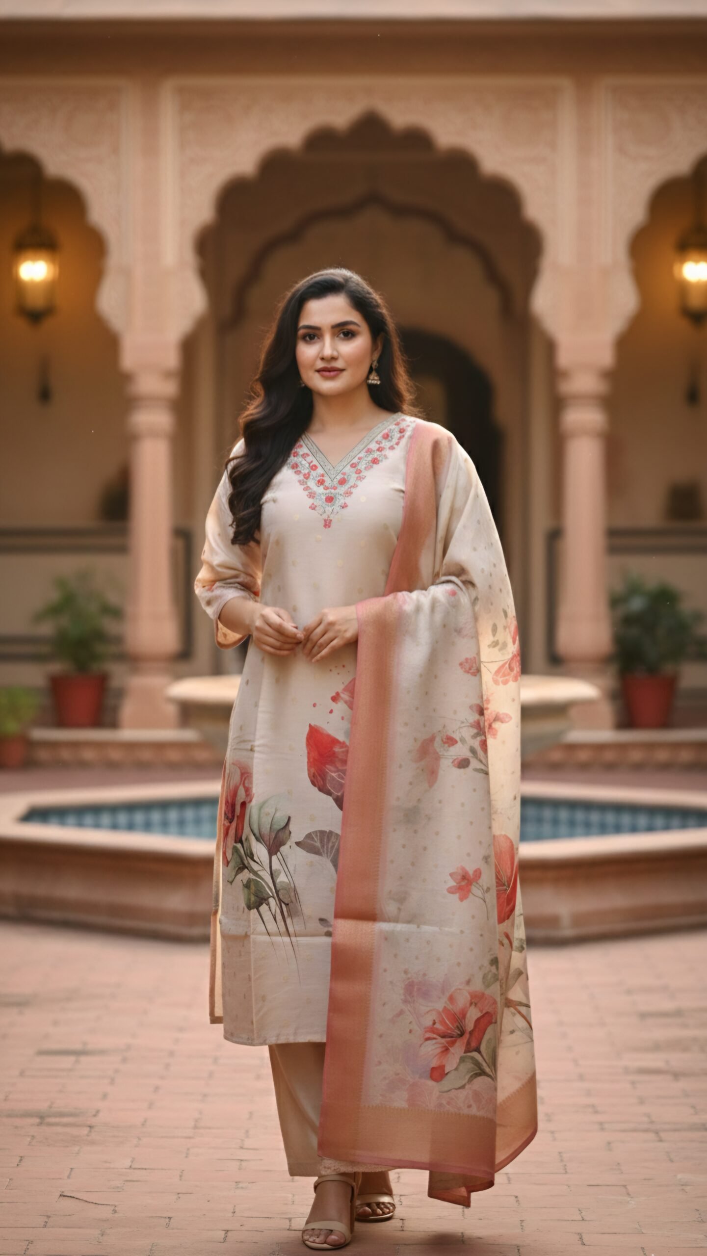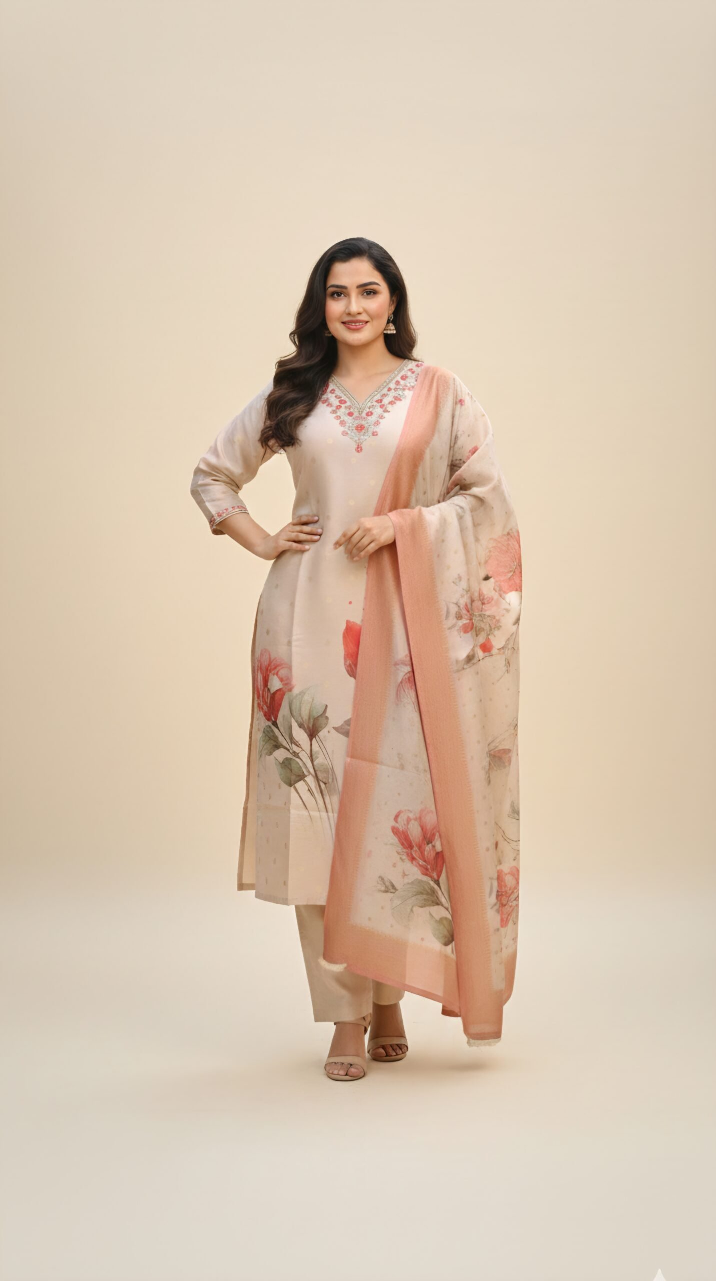 Step into effortless elegance with this beautifully crafted Shimmer Digital Print 3-Piece Set, designed for women who appreciate subtle luxury and timeless ethnic fashion. Featuring a soft cream base enhanced with delicate floral digital prints, this ensemble brings together grace, sophistication, and modern style.