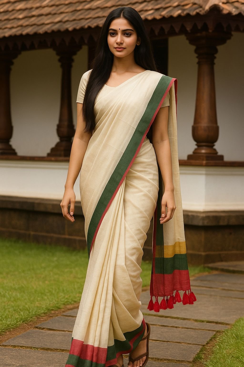 Step into timeless elegance with this premium Mul Mul Cotton Saree, crafted to embody grace and comfort. Woven from ultra-soft and breathable mul mul cotton, this saree features a soothing ivory cream base adorned with a vibrant tricolor border of red, green, and golden yellow. Accentuated with eye-catching red tassels on the pallu, this saree is a perfect fusion of tradition and minimalistic style.