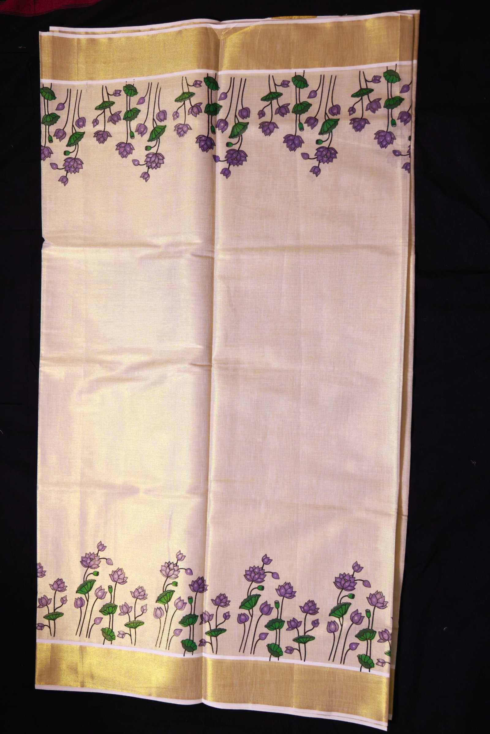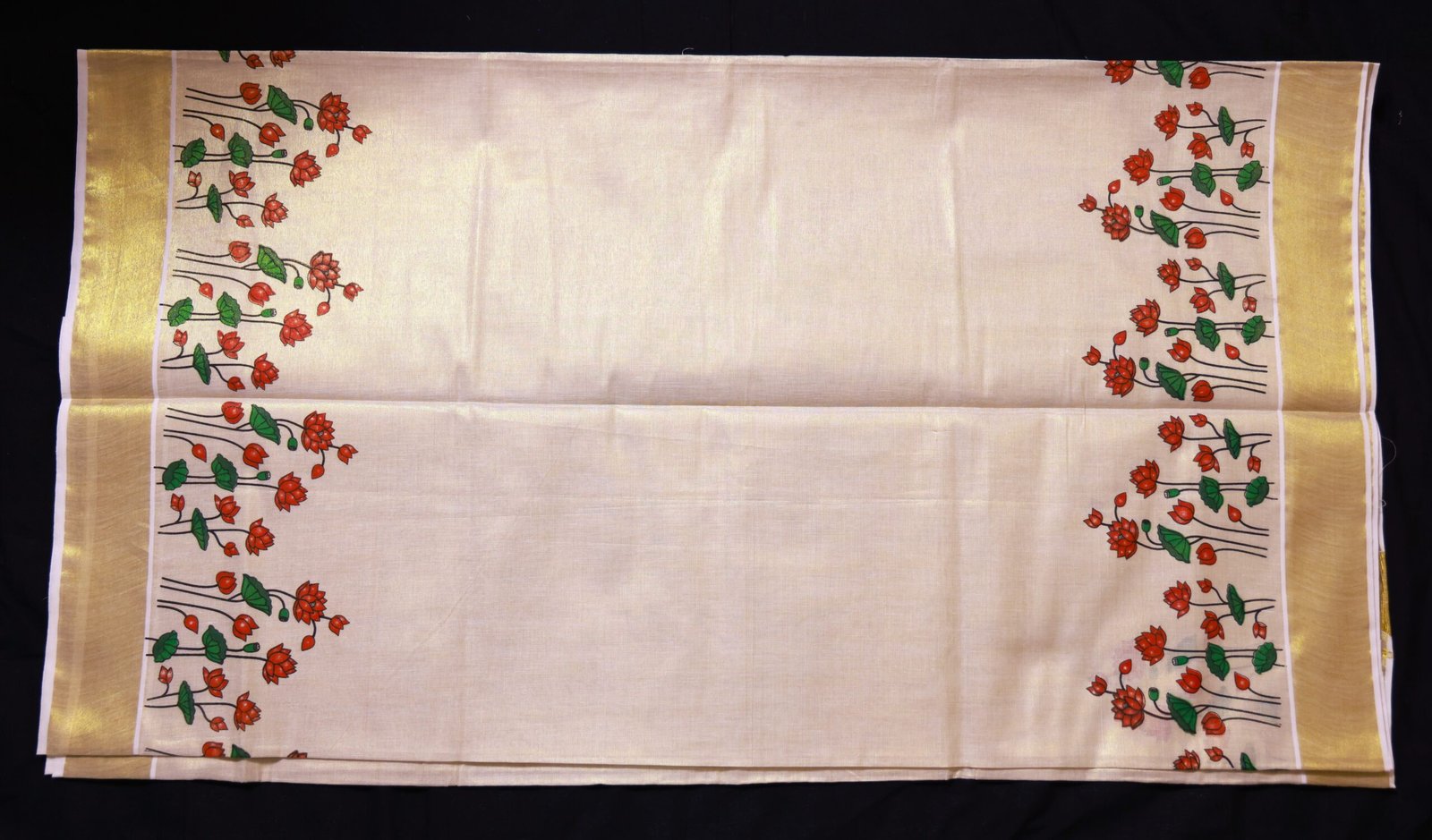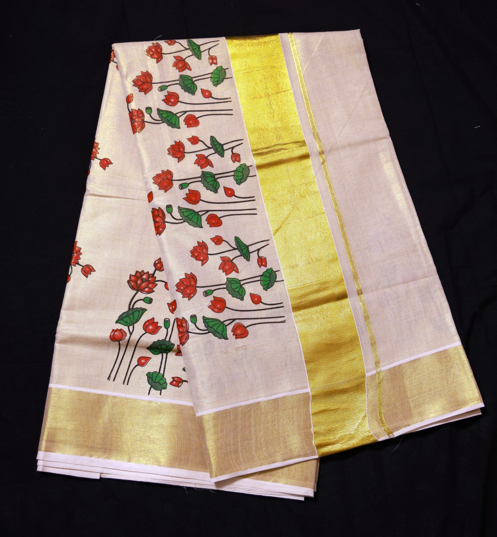 Embrace timeless elegance with our Lotus Print Tissue Saree, a perfect blend of tradition and sophistication. Crafted from premium tissue fabric, this saree features a graceful beige base adorned with vibrant red lotus motifs and lush green leaves, symbolizing purity and beauty. The golden zari border and pallu add a luxurious sheen, making it ideal for festive celebrations, weddings, and cultural gatherings.