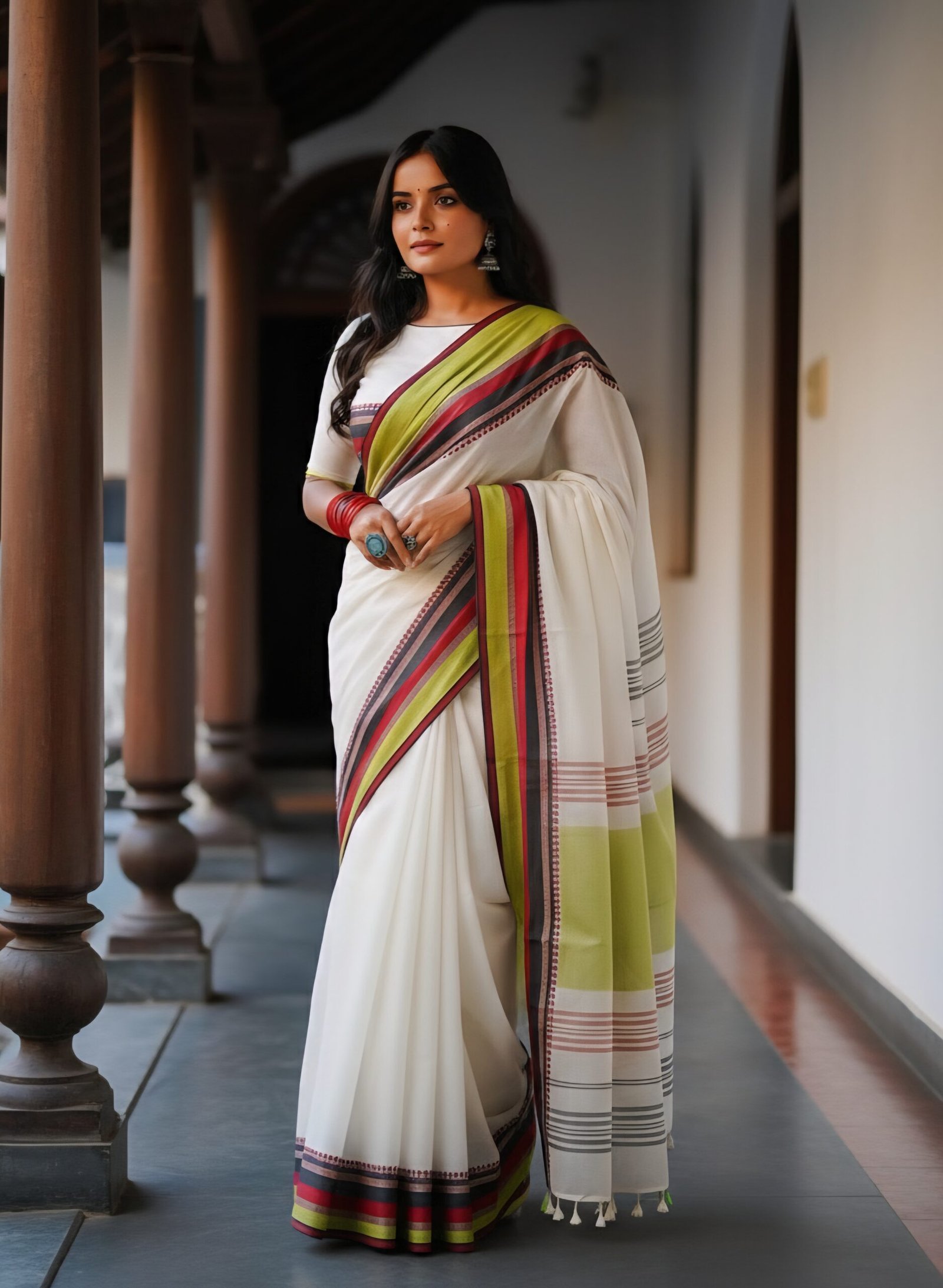 The first design features an elegant off-white cotton saree highlighted with vibrant green and maroon borders, exuding a fresh and classy appeal. The fine handwoven cotton fabric ensures breathable comfort and effortless draping, while the subtle tassel detailing adds a touch of sophistication.