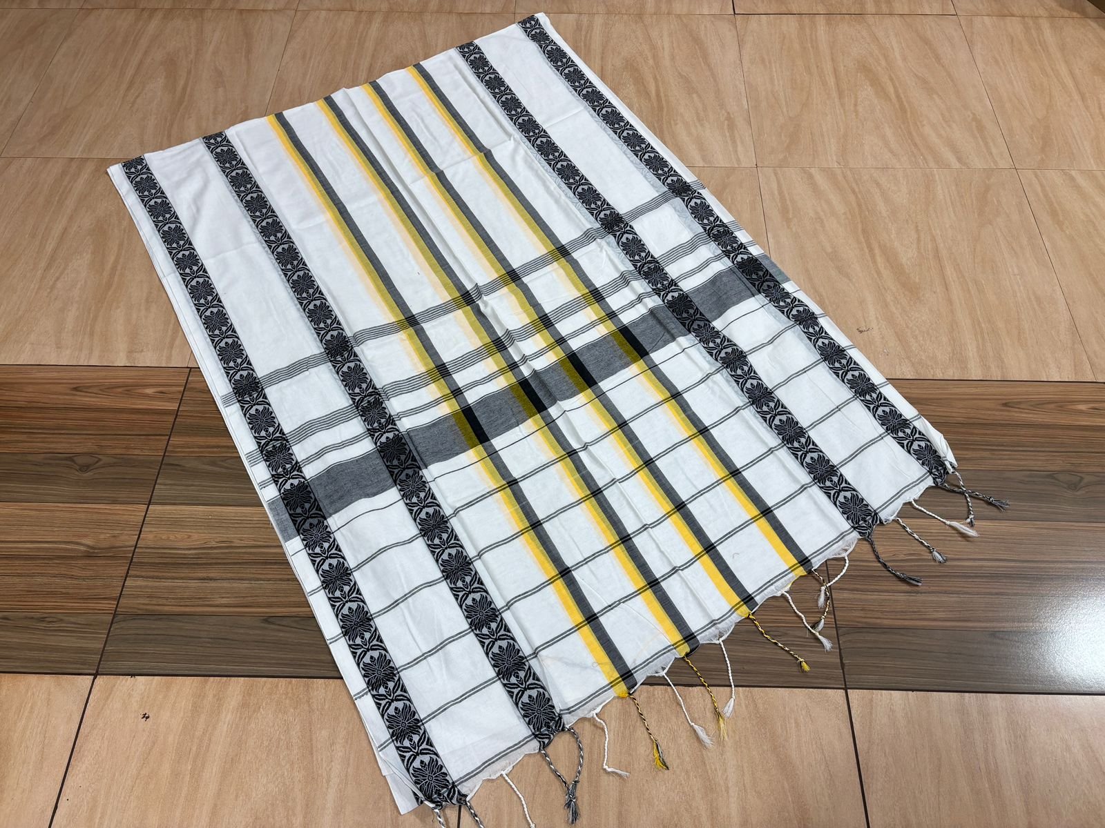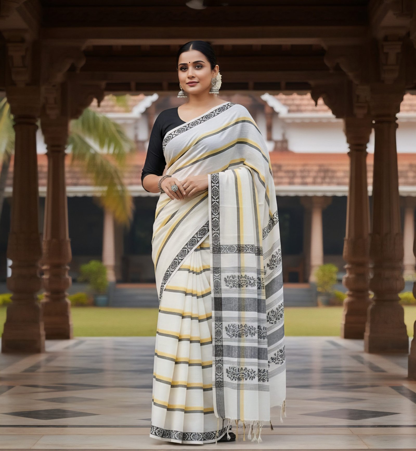 The second masterpiece showcases a white and grey handloom cotton saree adorned with golden stripes and intricate woven motifs along the border. Its refined aesthetic and soft texture make it the perfect choice for traditional functions, office wear, or cultural events.