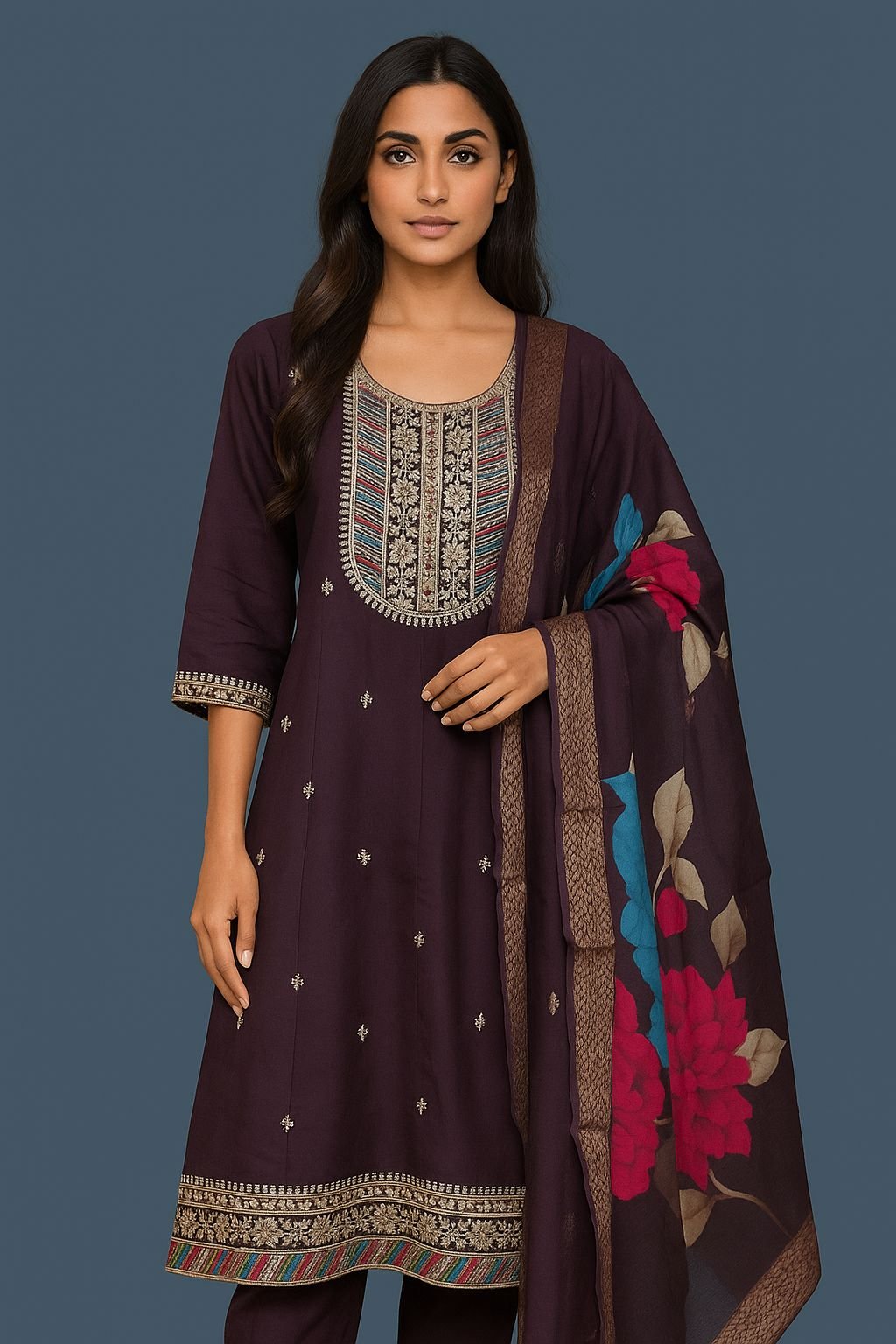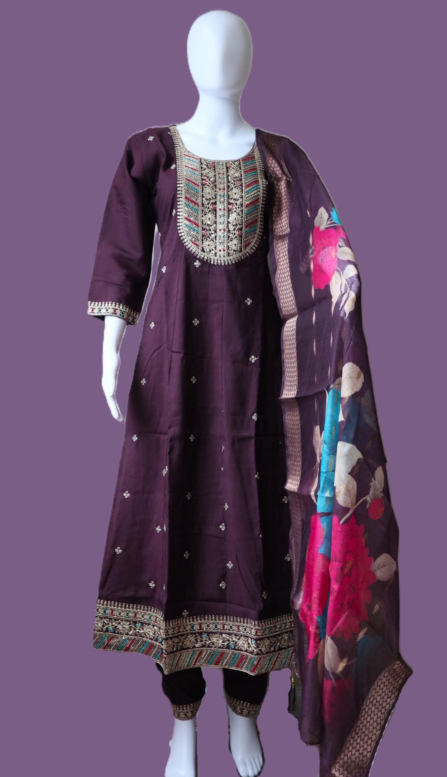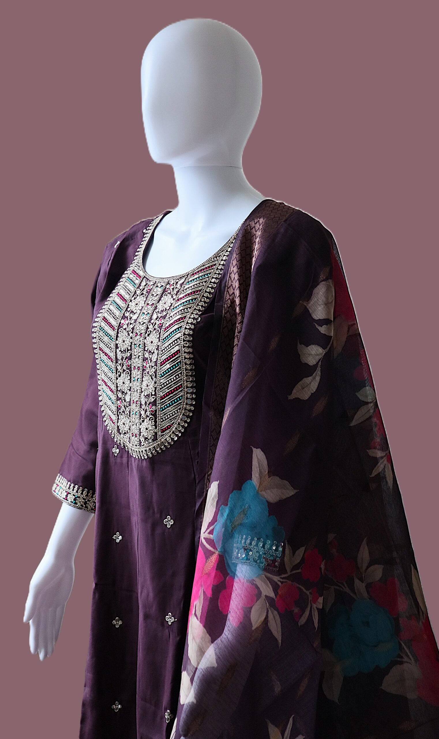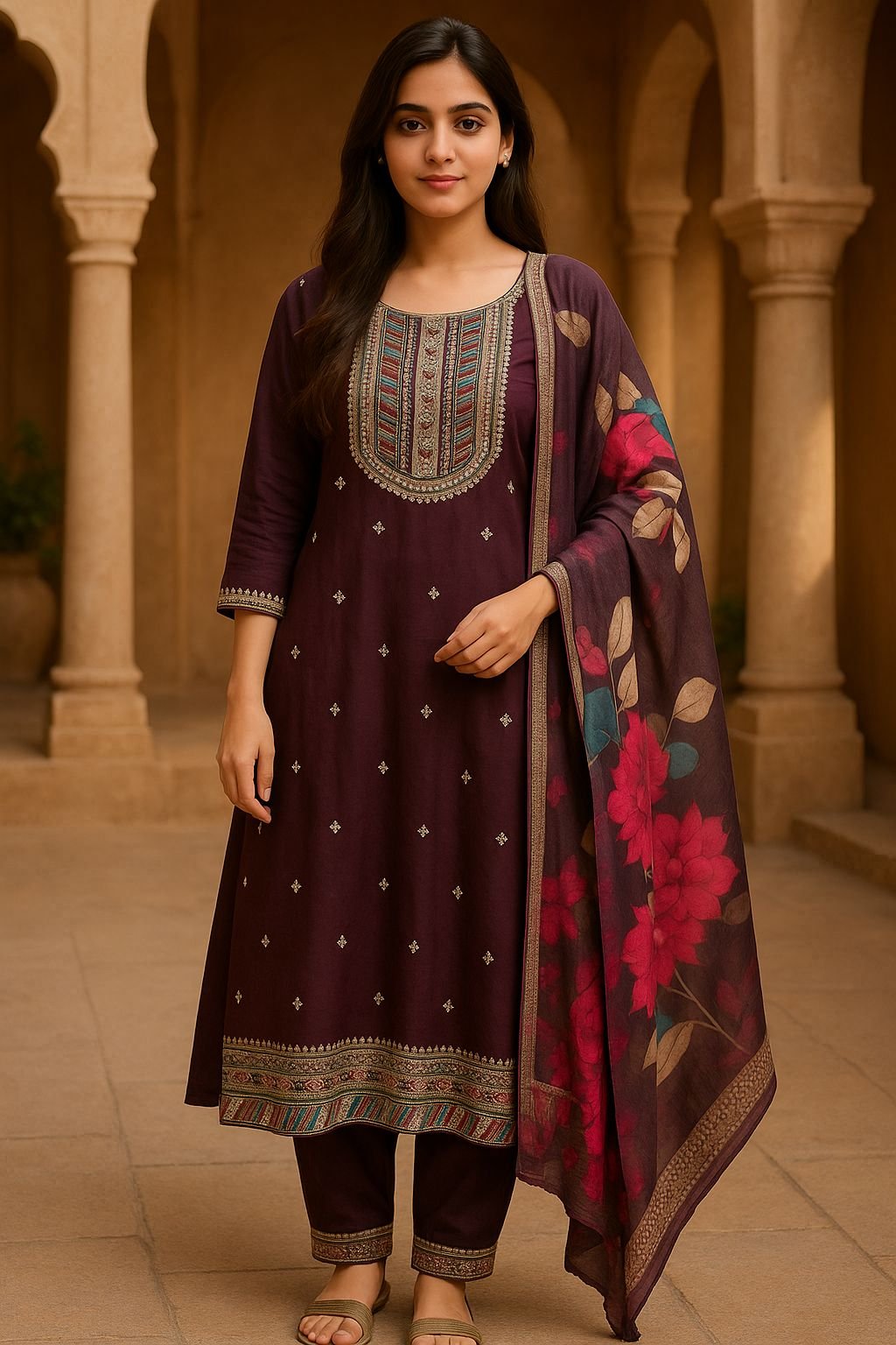 Embrace understated luxury with this stunning plum-colored suit set, a perfect blend of tradition and contemporary elegance. Crafted from premium fabric, this 3-piece ensemble features exquisite embroidery and a vibrant dupatta that adds a delightful pop of color.