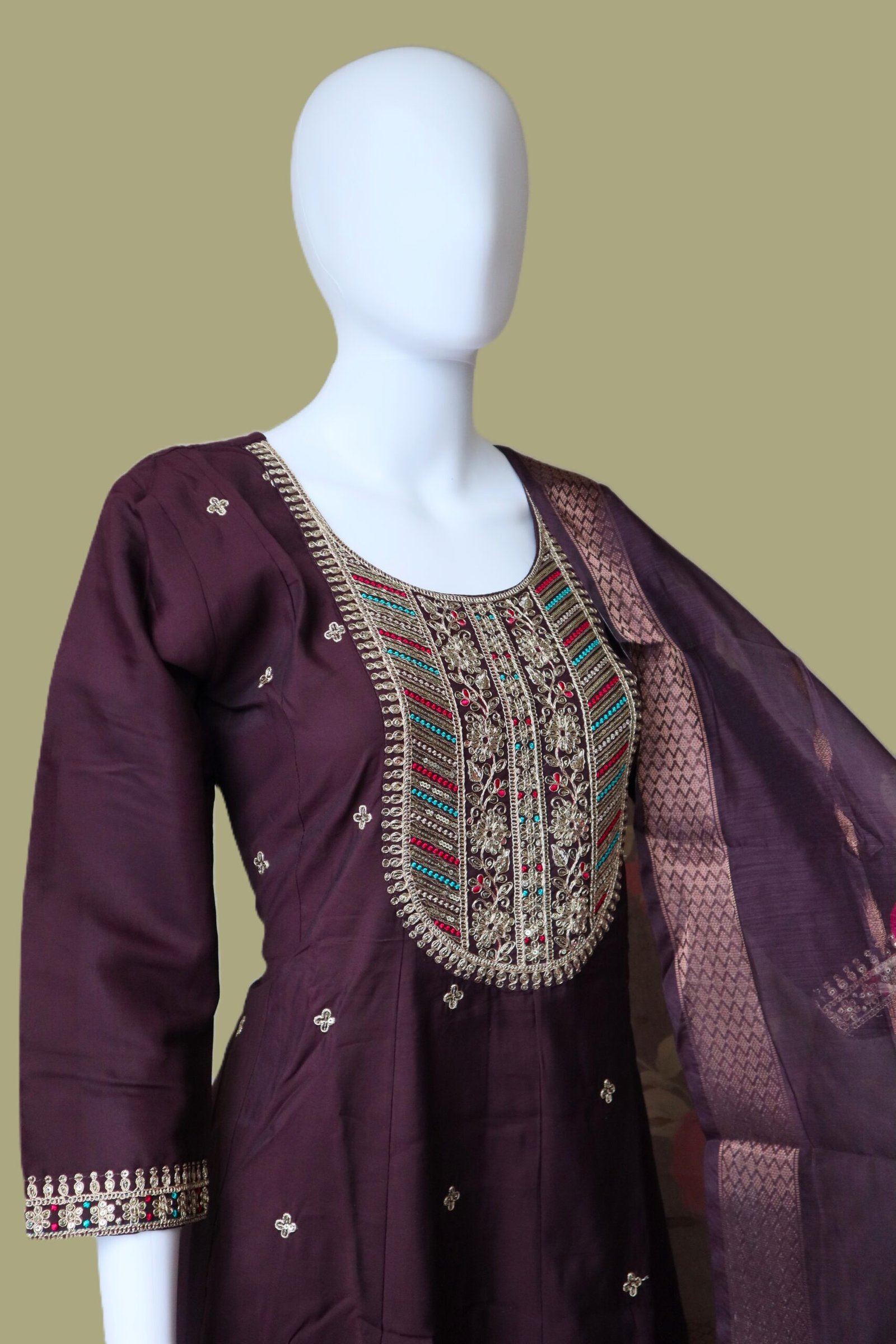 Rich plum hue adorned with intricate Zari and thread embroidery on the neckline, cuffs, and hem.