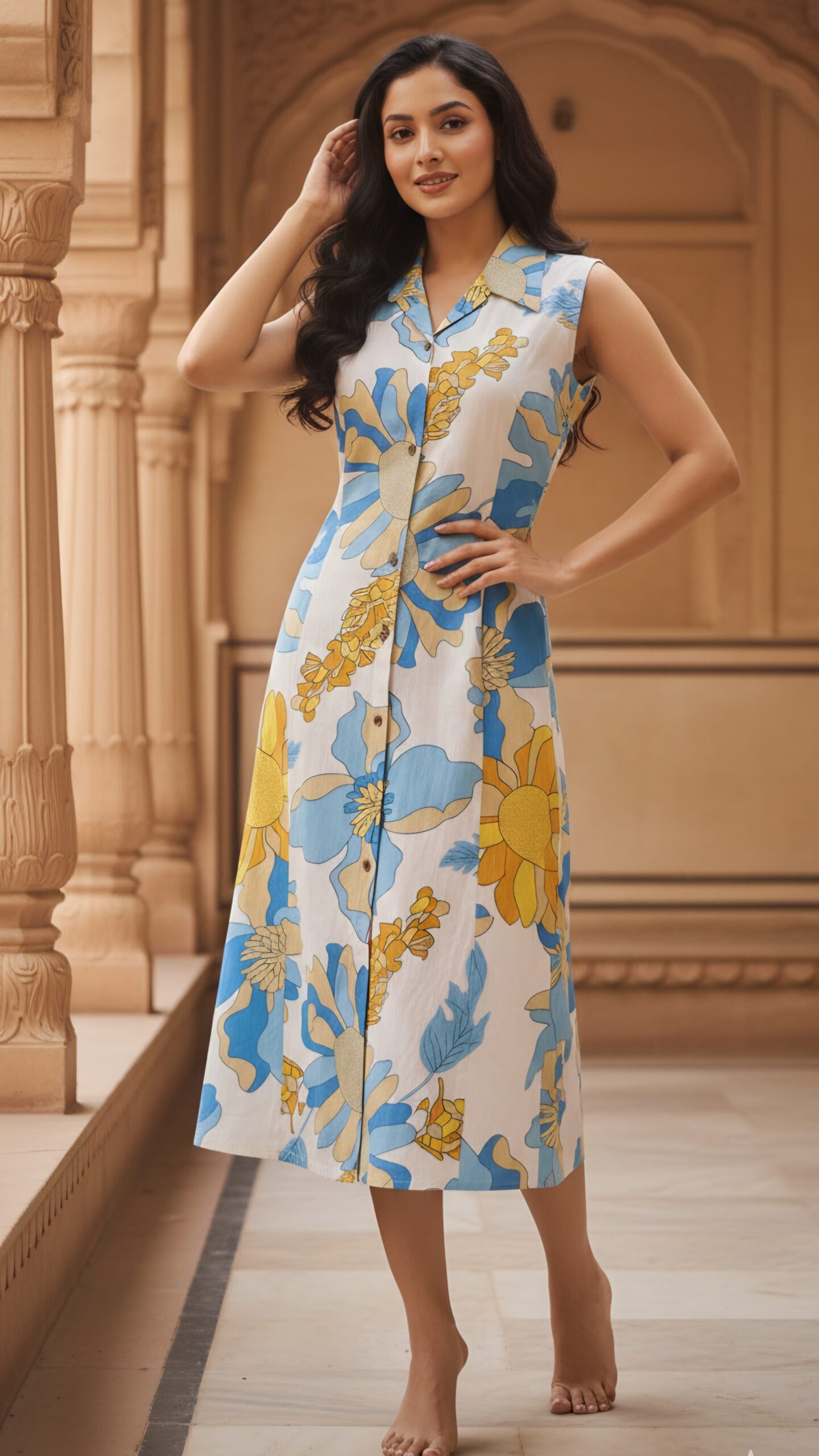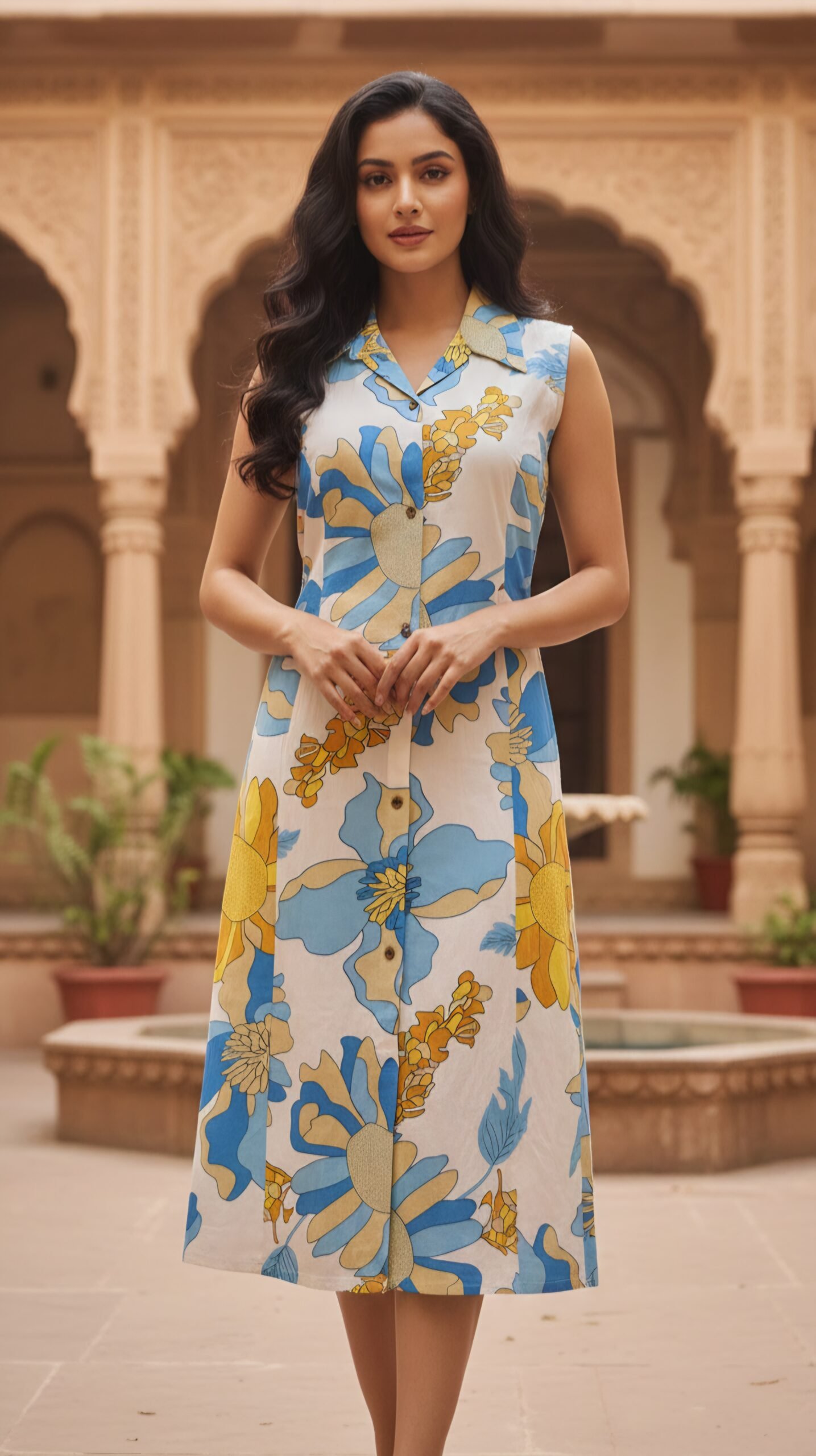 The charming A-line/Frock style silhouette flares gently from the waist, providing a comfortable and flattering fit for all body types. It features a smart collar neck and a chic button-down placket detailing on the bodice. The vibrant, retro-inspired floral pattern in soothing shades of blue and yellow adds a cheerful, youthful appeal.