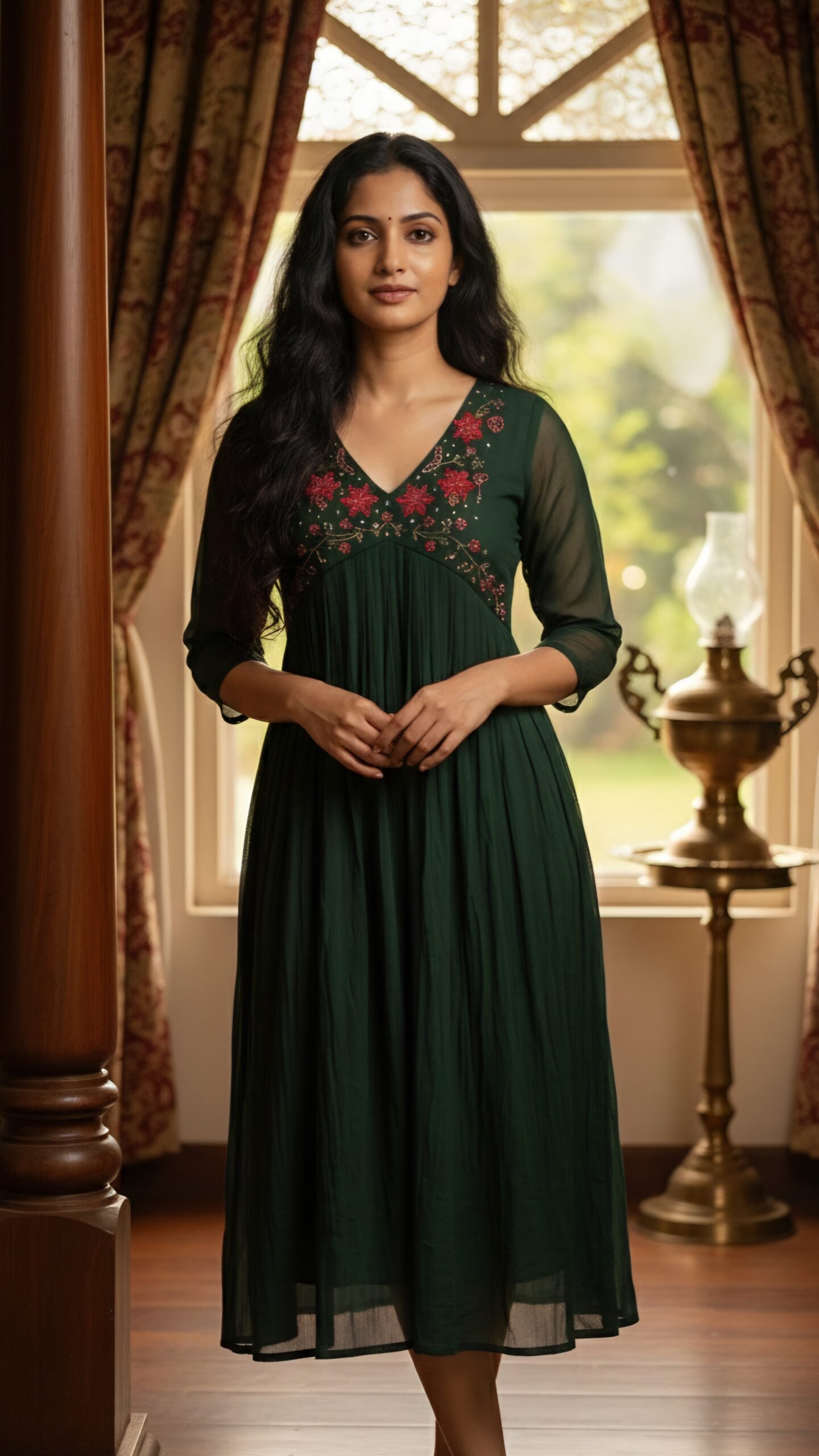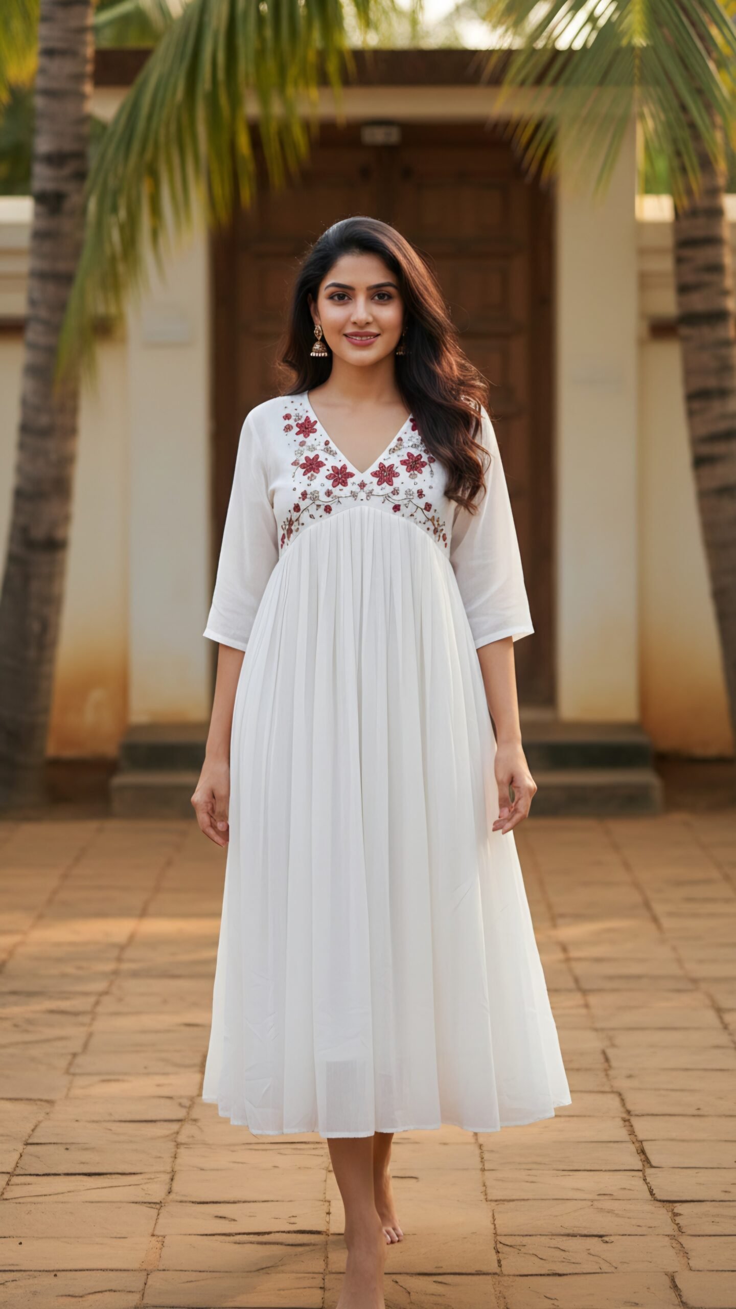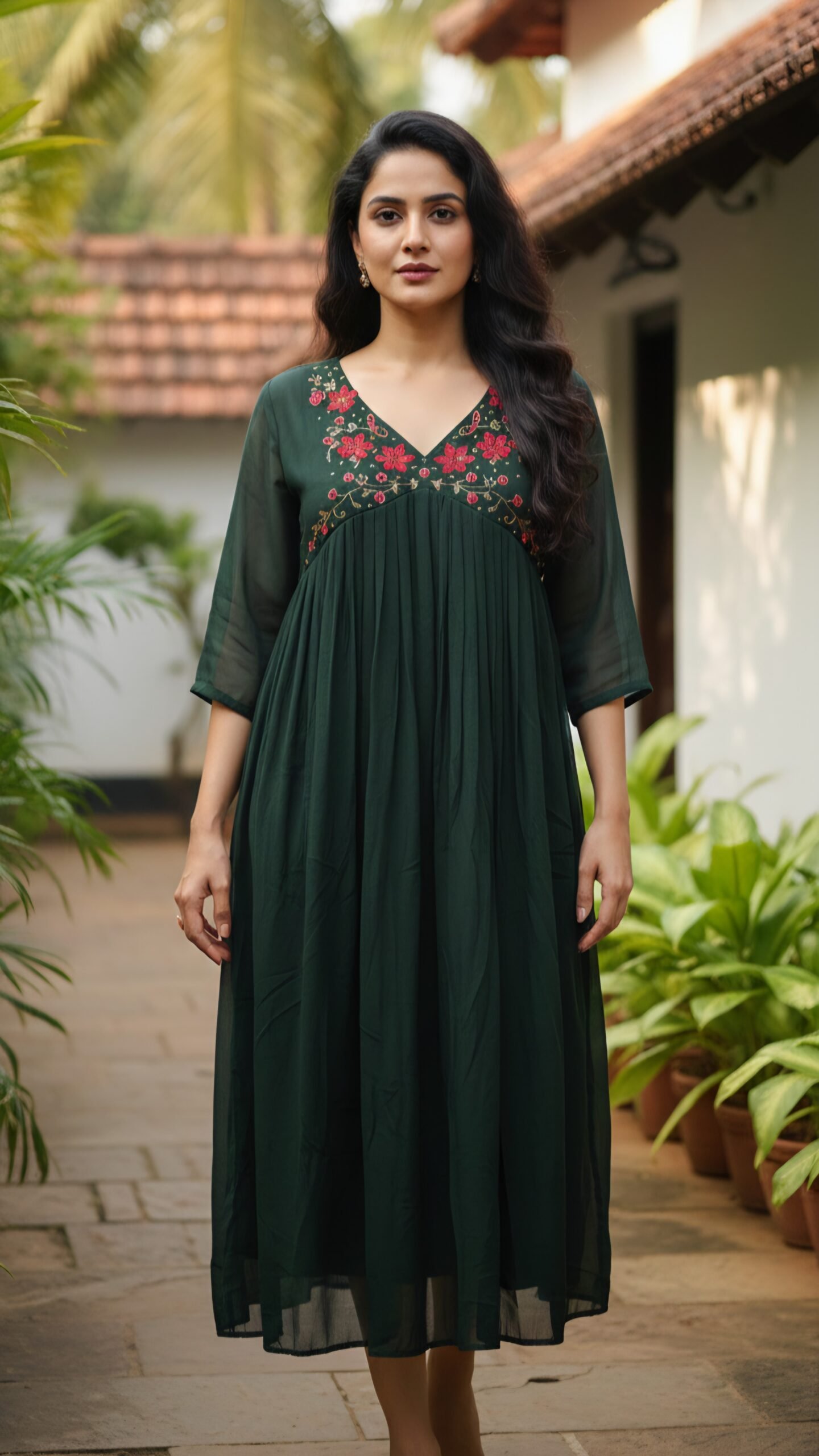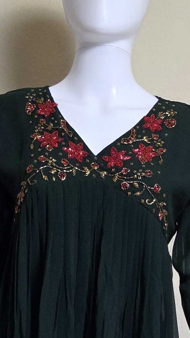 The centerpiece of this exquisite garment is the deep V-neckline, meticulously adorned with vibrant hand-embroidered floral motifs and golden threadwork that adds a touch of regal shimmer. The high-waisted pleated flare provides a flattering fit-and-flare look, while the sheer 3/4 sleeves add a layer of sophisticated charm. Available in Pristine White for a serene daytime look and Emerald Green for a bold evening statement, this kurti is the perfect blend of traditional artistry and modern grace.
