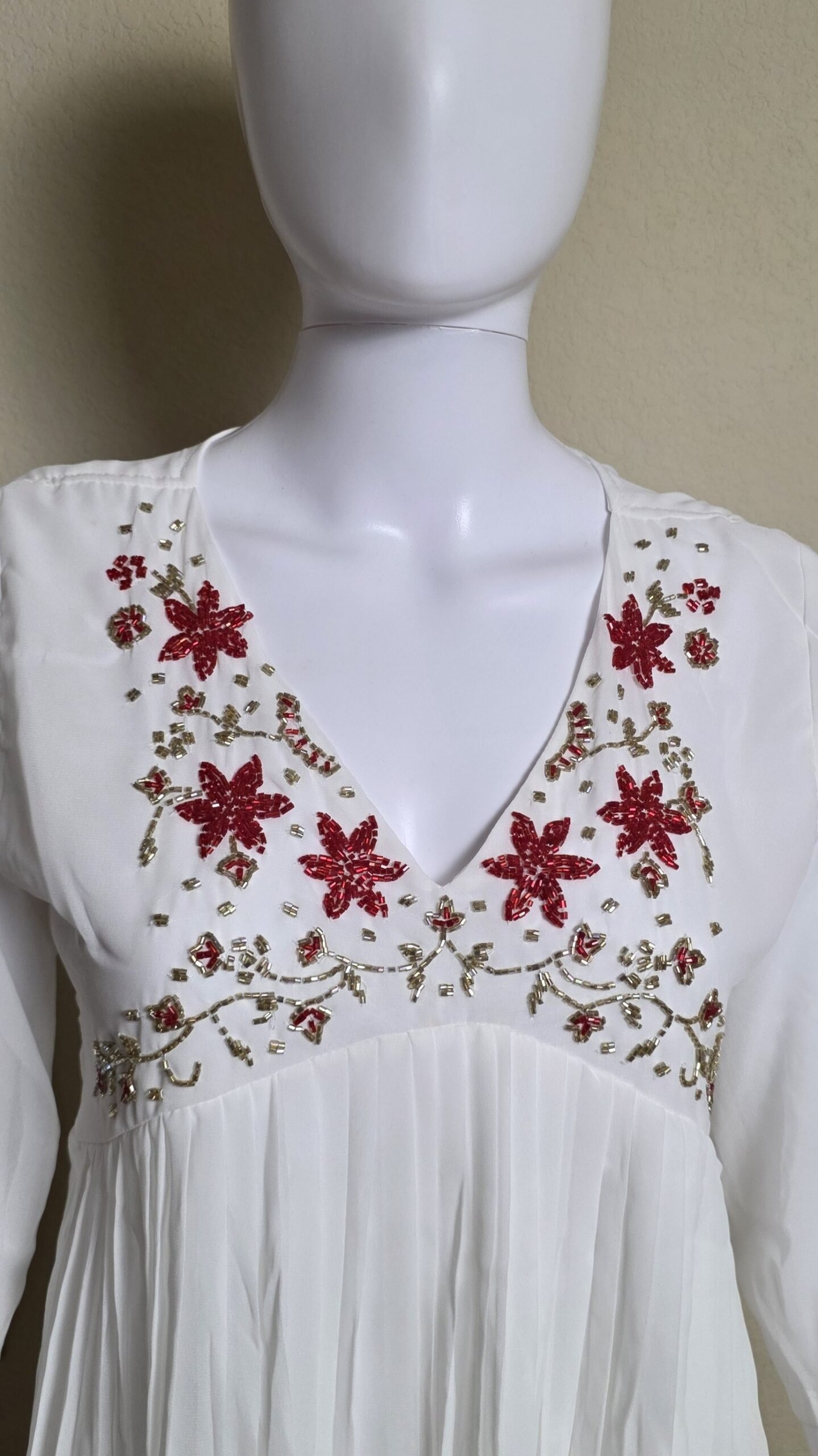 Embroidery: Intricate floral threadwork and golden bead embellishments on the yoke.