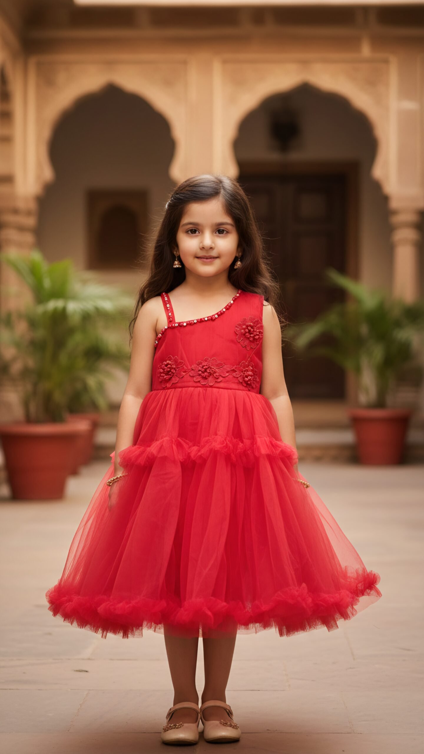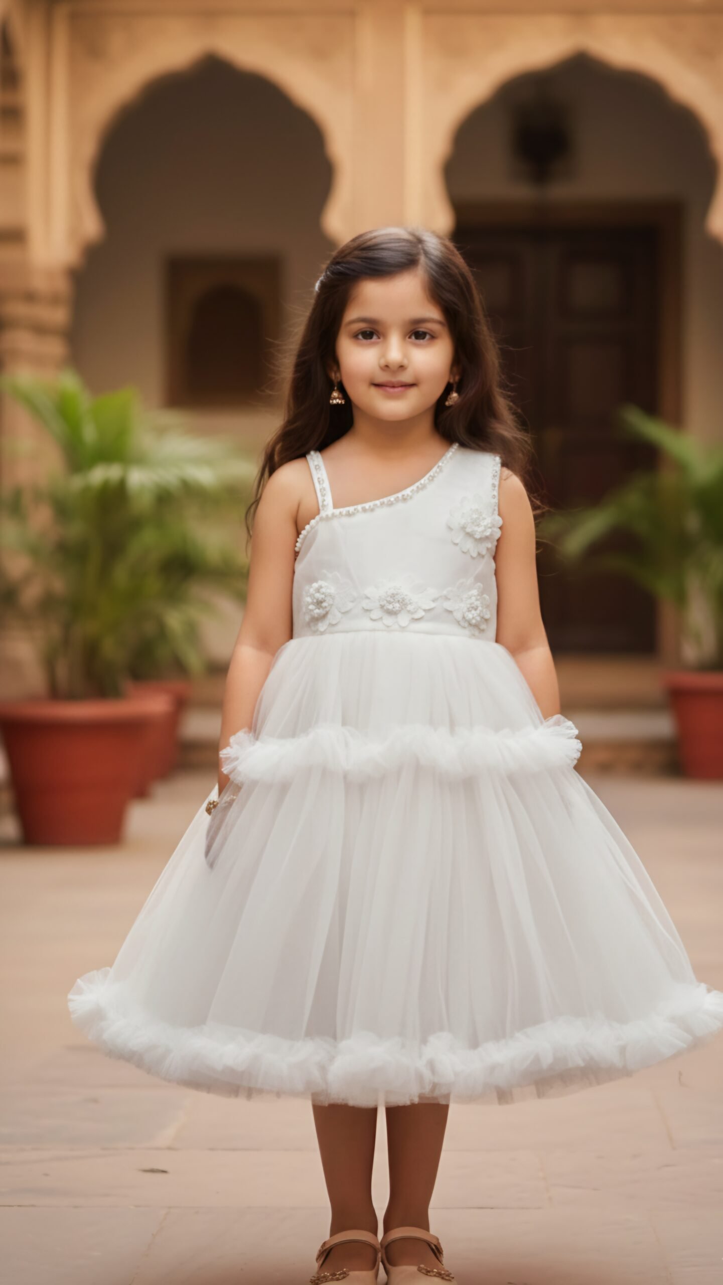 Designed to Dazzle The bodice features a unique asymmetric neckline adorned with a shimmering beaded strap that runs diagonally across the chest, adding a touch of sophisticated sparkle. Beautiful 3D floral appliqués cluster at the shoulder and waist, creating a garden-fresh look. The skirt is a masterpiece of volume, crafted from soft layers of premium net with tiered ruffles that create a beautiful bounce when she twirls.