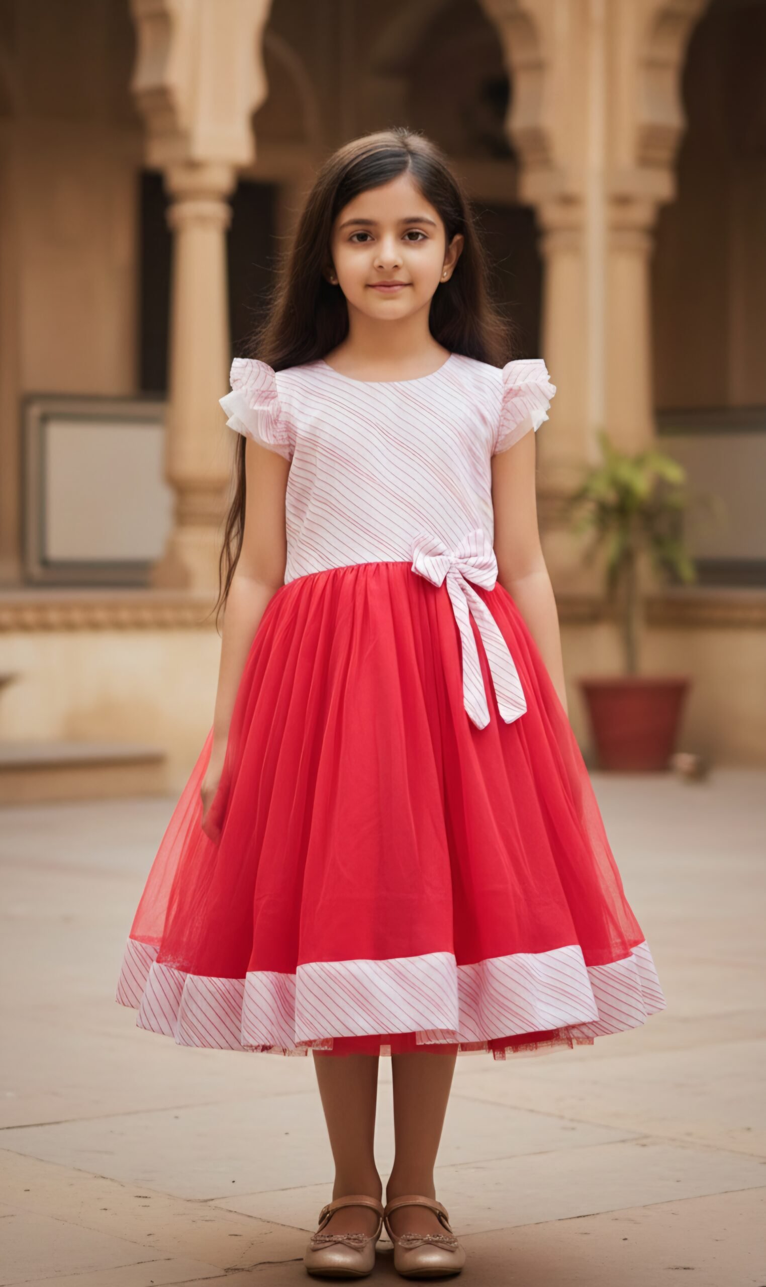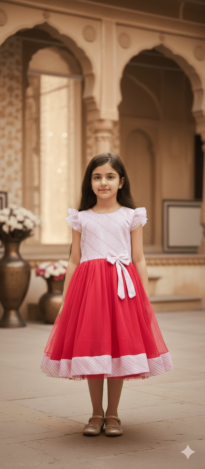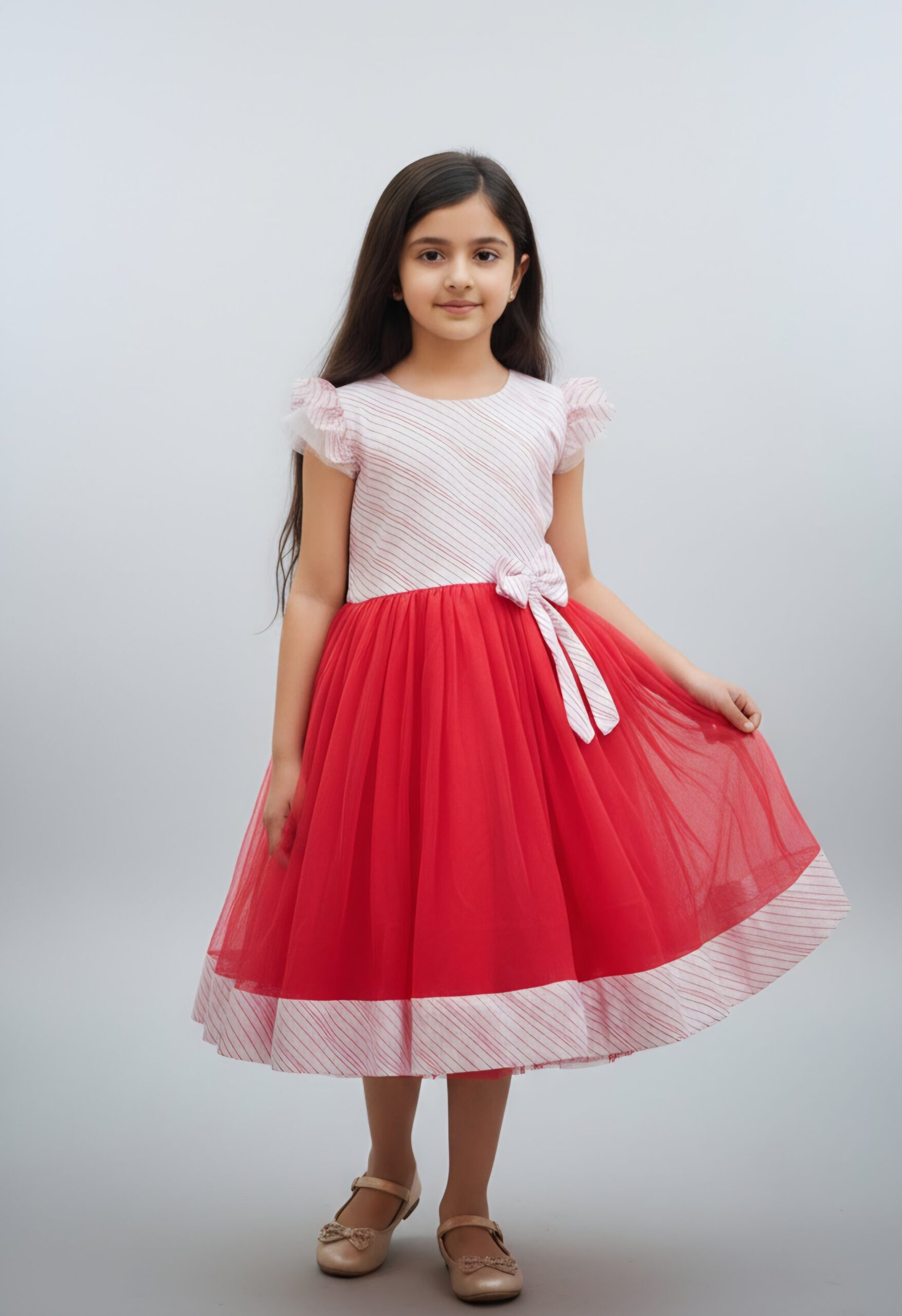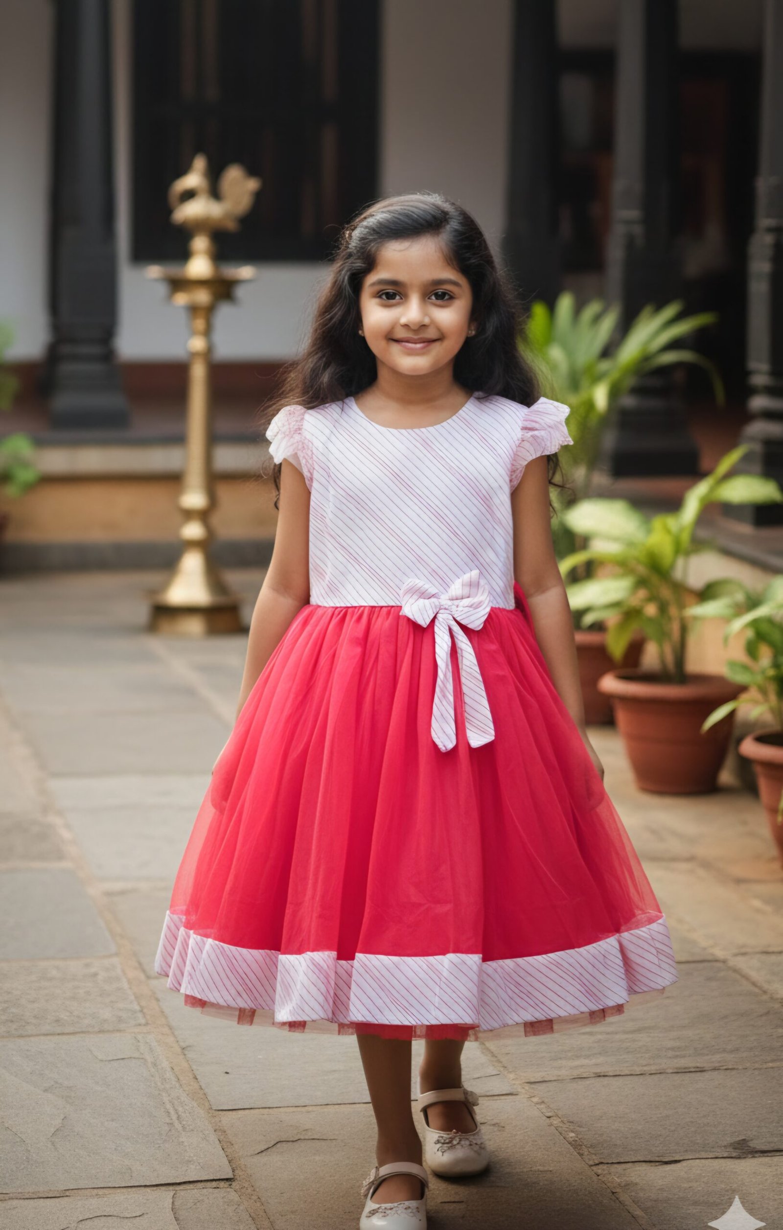 Add charm to your little girl’s wardrobe with this elegant Pink & Red Party Wear Dress for Girls, designed for special moments and celebrations. The soft pastel pink bodice with subtle stripes pairs beautifully with the vibrant red flared net skirt, creating a perfect balance of sweetness and style.