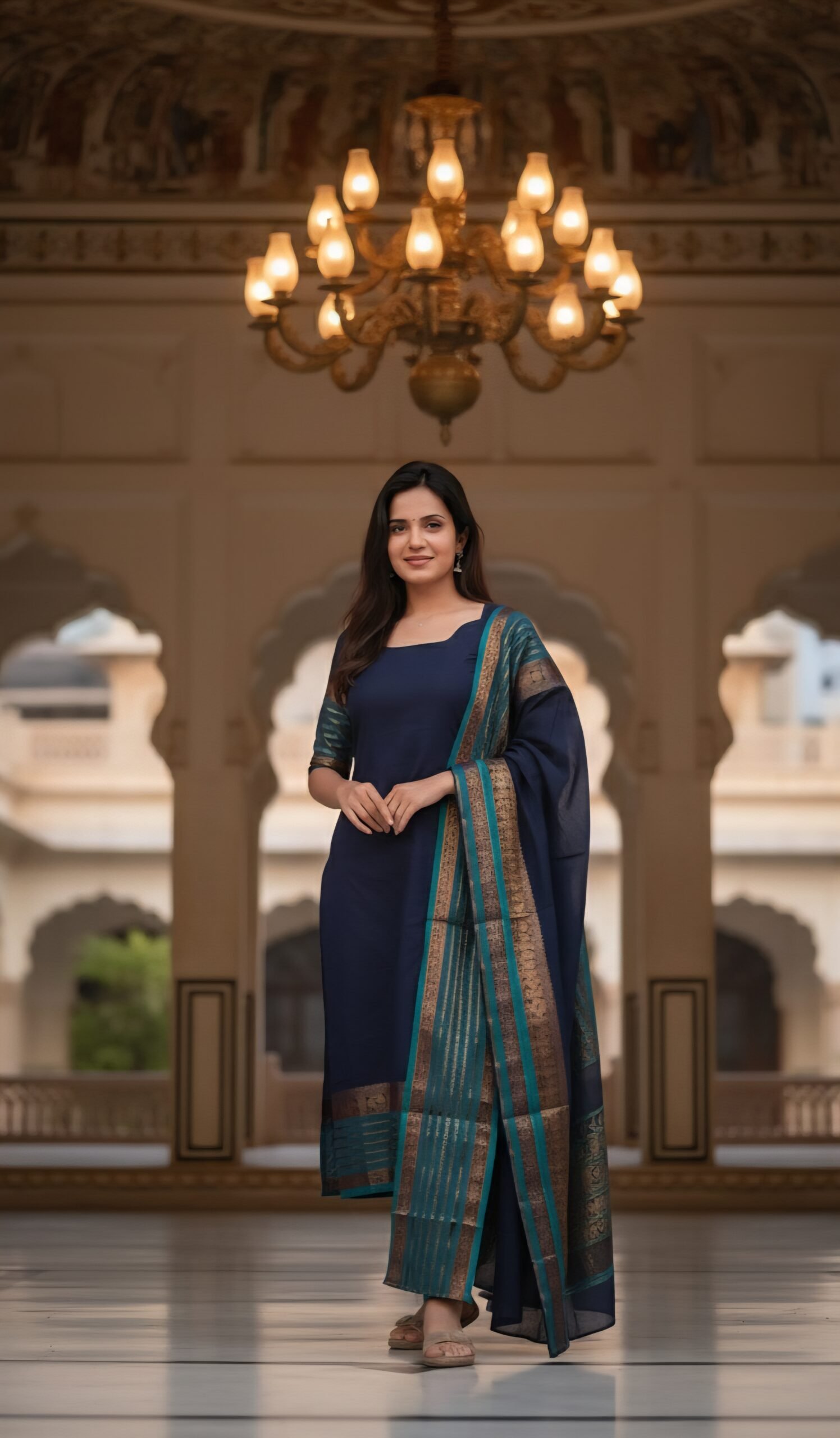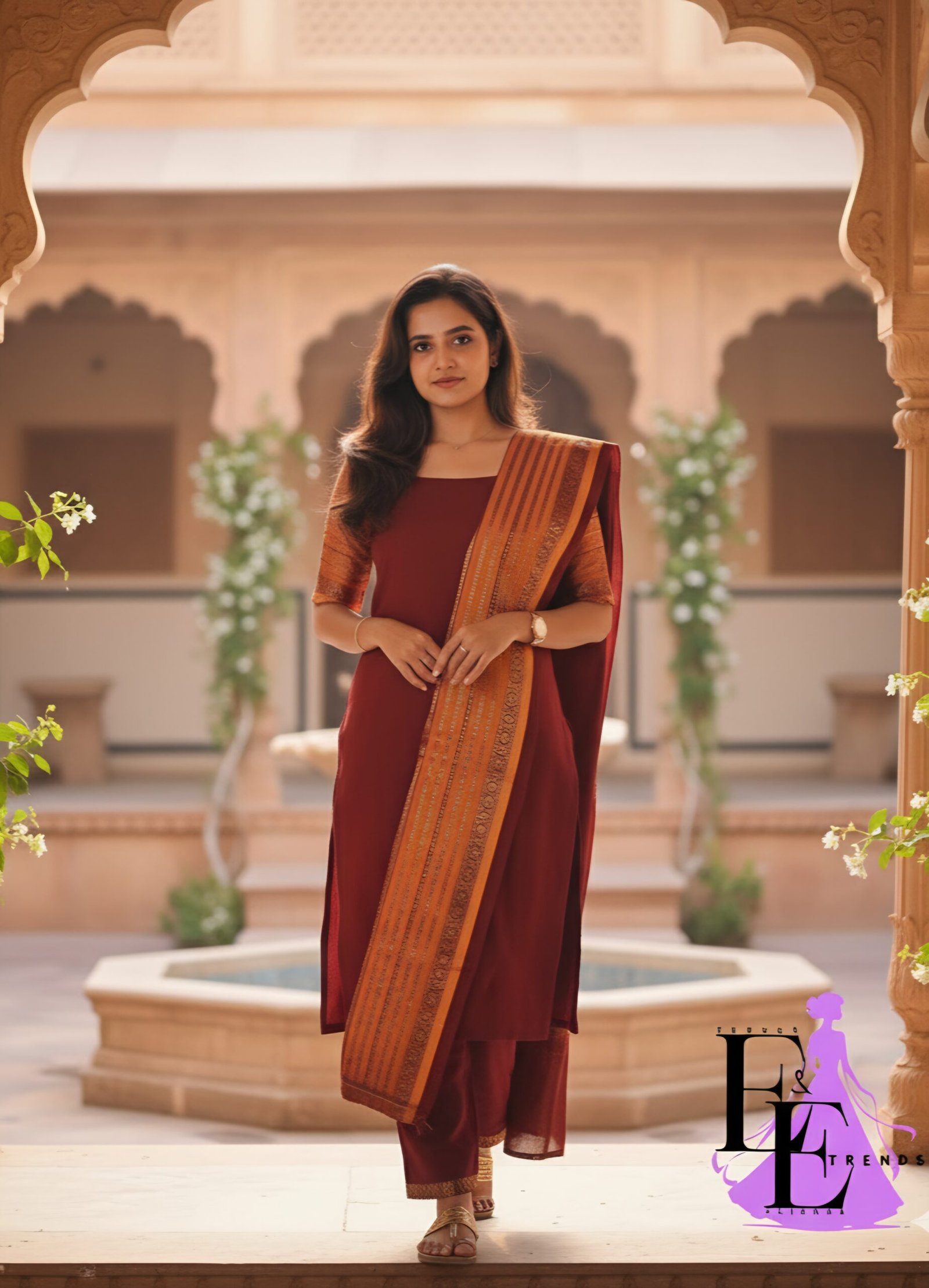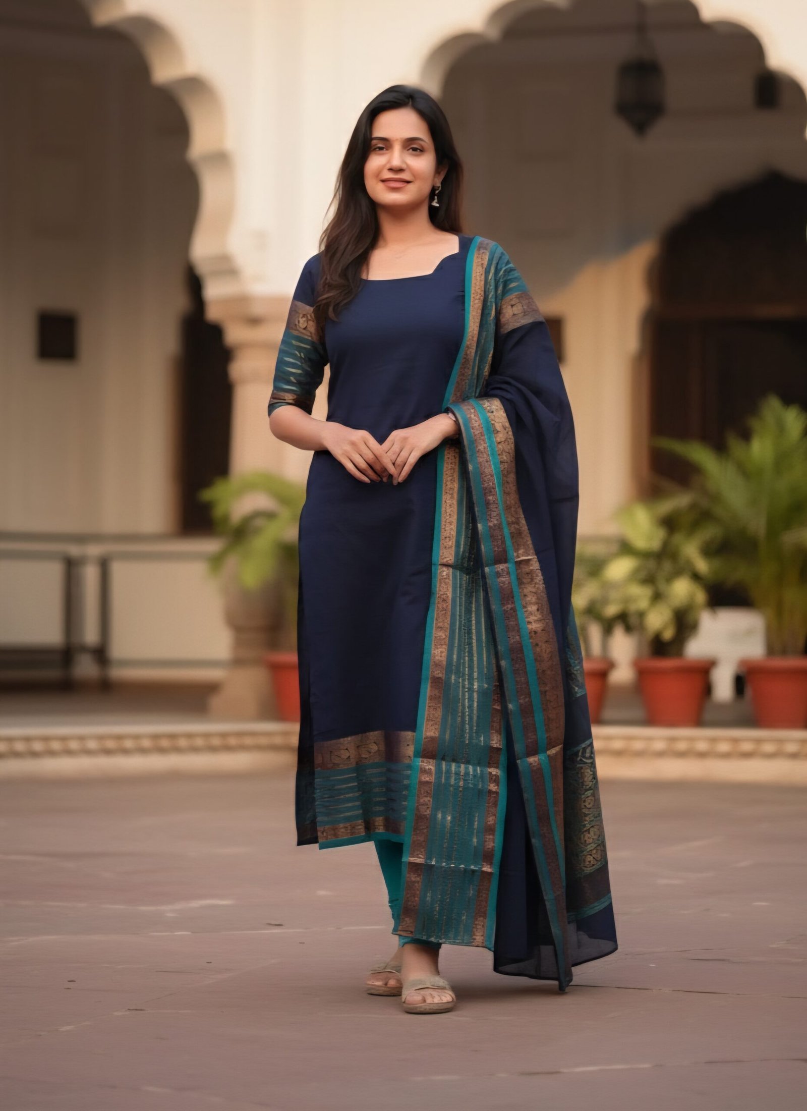 Available in two regal color palettes — deep maroon with vibrant orange borders and royal navy with teal and antique gold Zari patterns — each ensemble is designed to exude sophistication and effortless grace. The straight-cut kurta, paired with matching leggings and a beautifully woven dupatta, ensures a refined and elegant silhouette for festive gatherings, temple visits, or casual daytime occasions.
