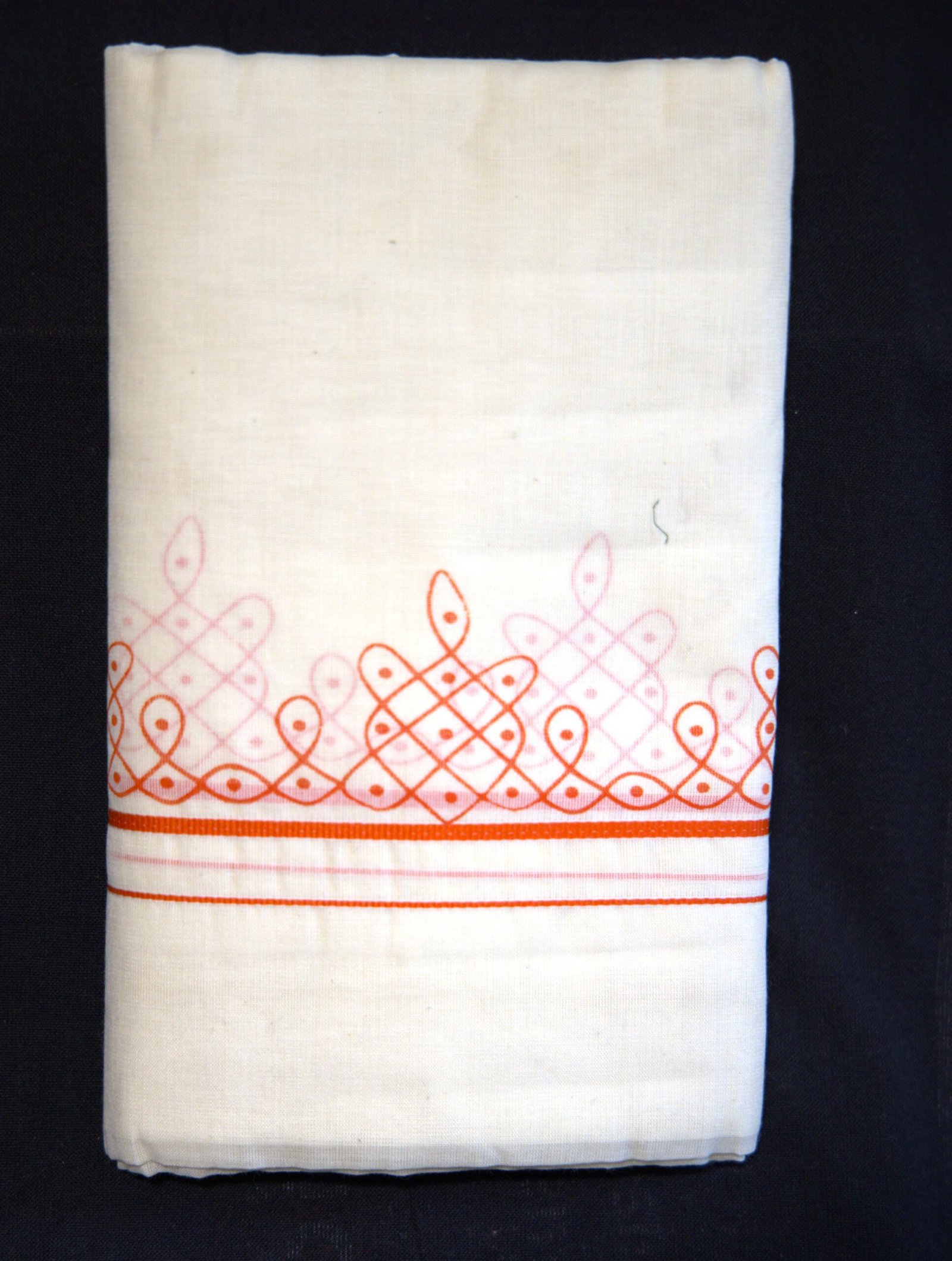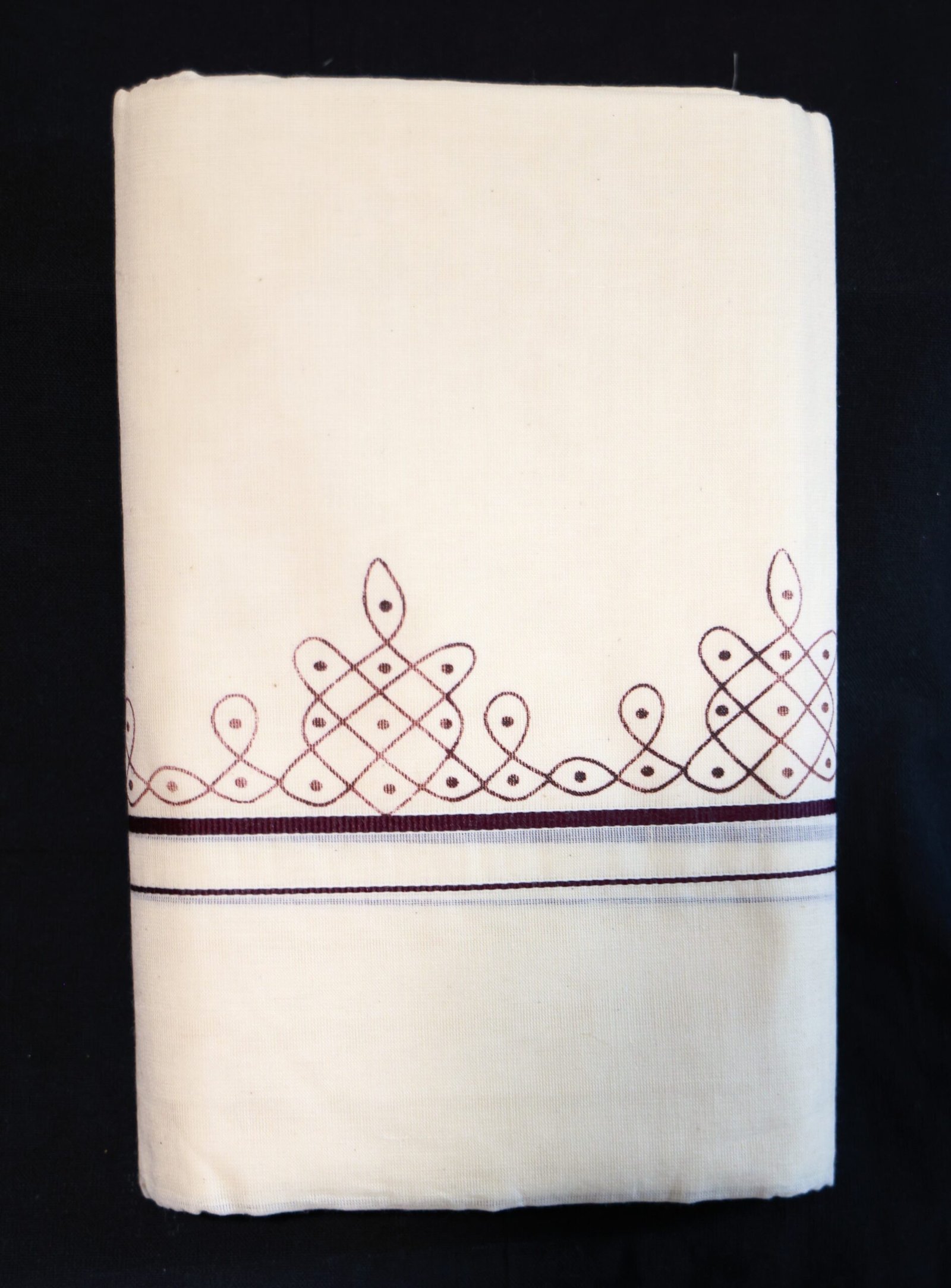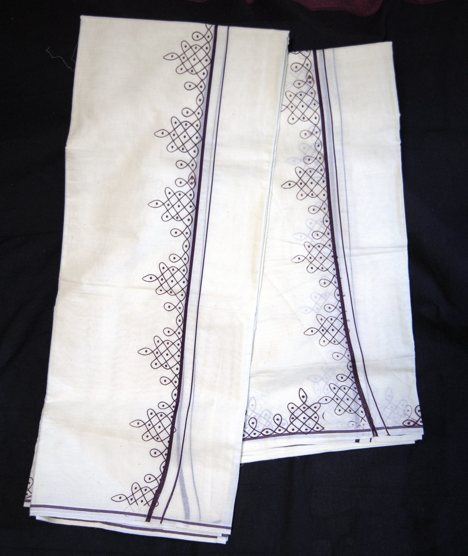Embrace tradition with this exquisite Kerala Set Mundu (Mundum Neriyathum), woven from soft pure cotton for comfort and elegance. This set mundu stands out with its intricate Kolam design woven along the borders in black, symbolizing prosperity and cultural heritage.