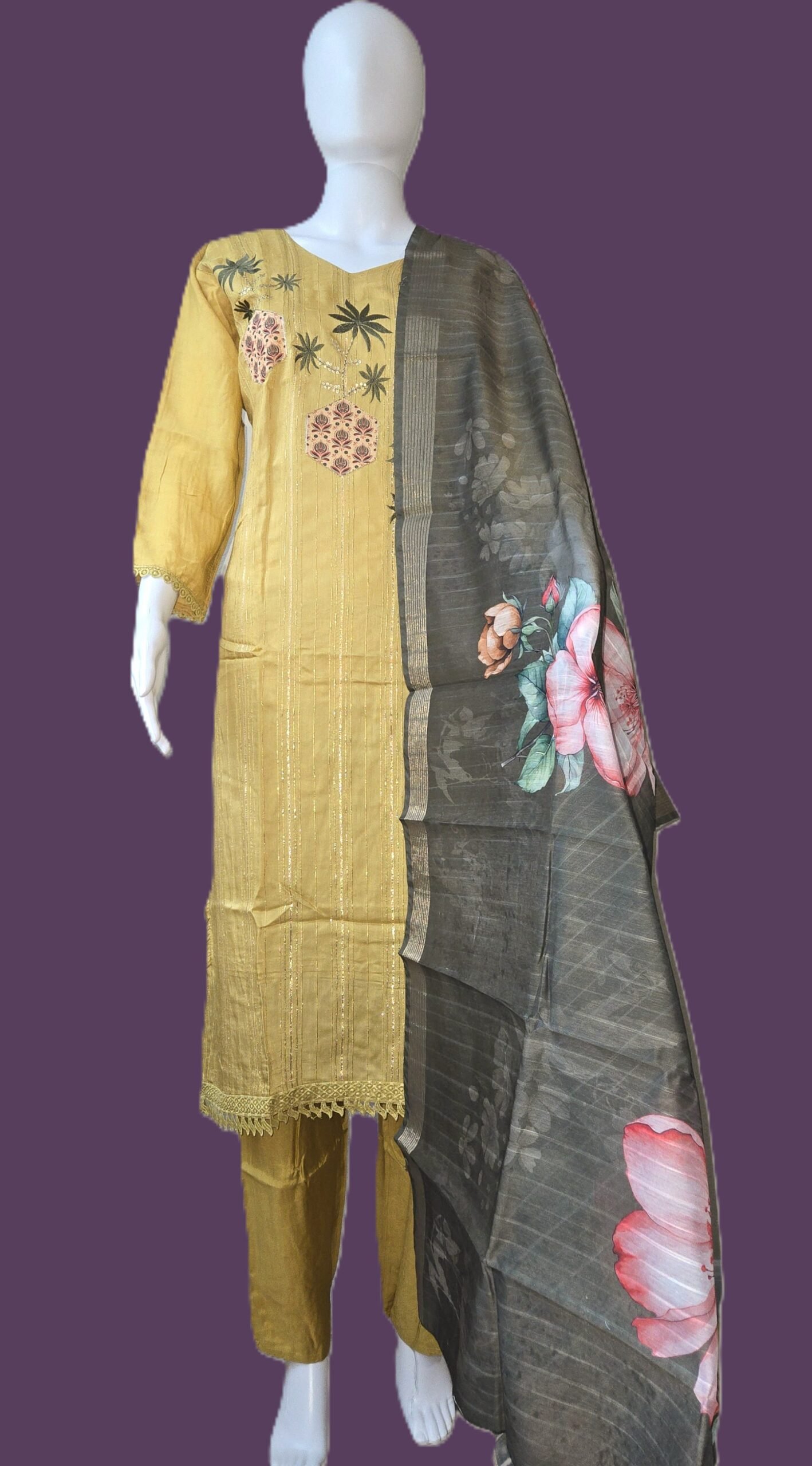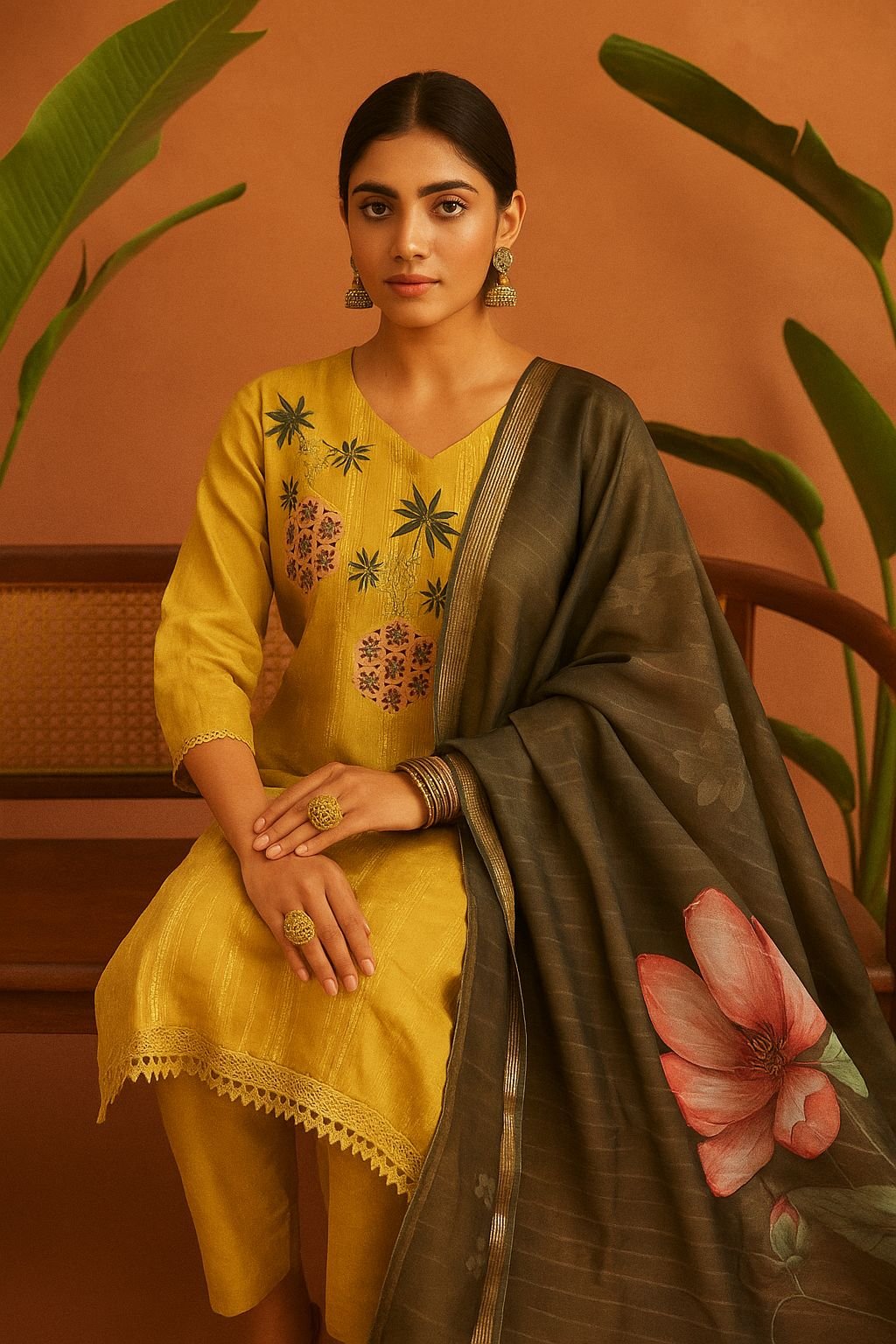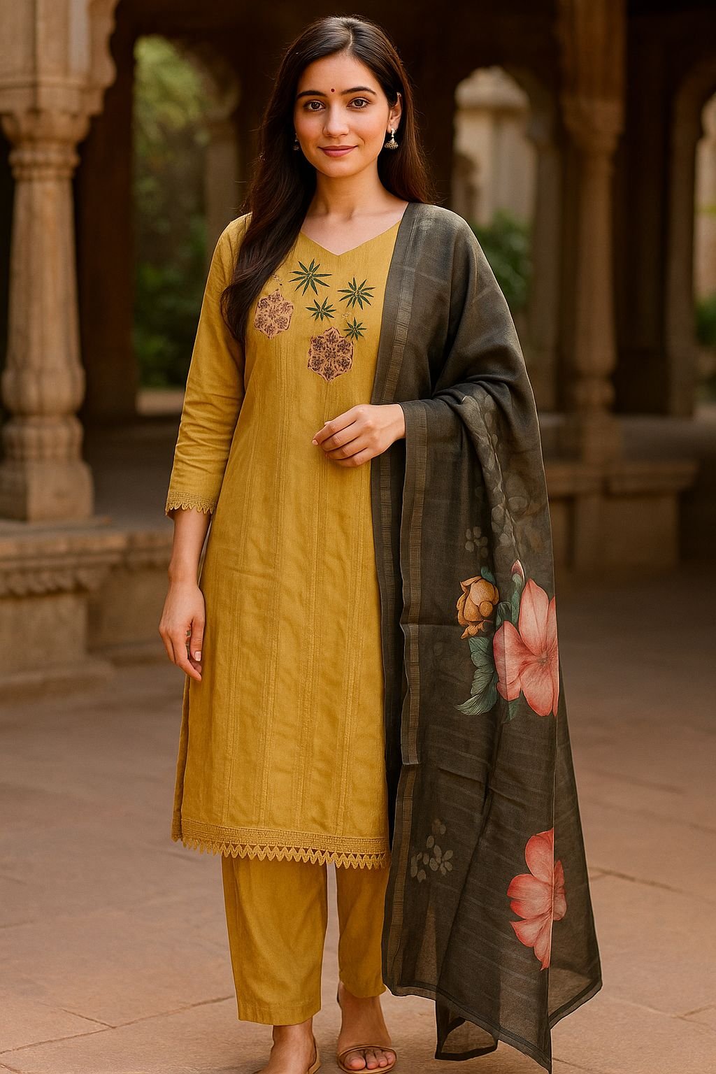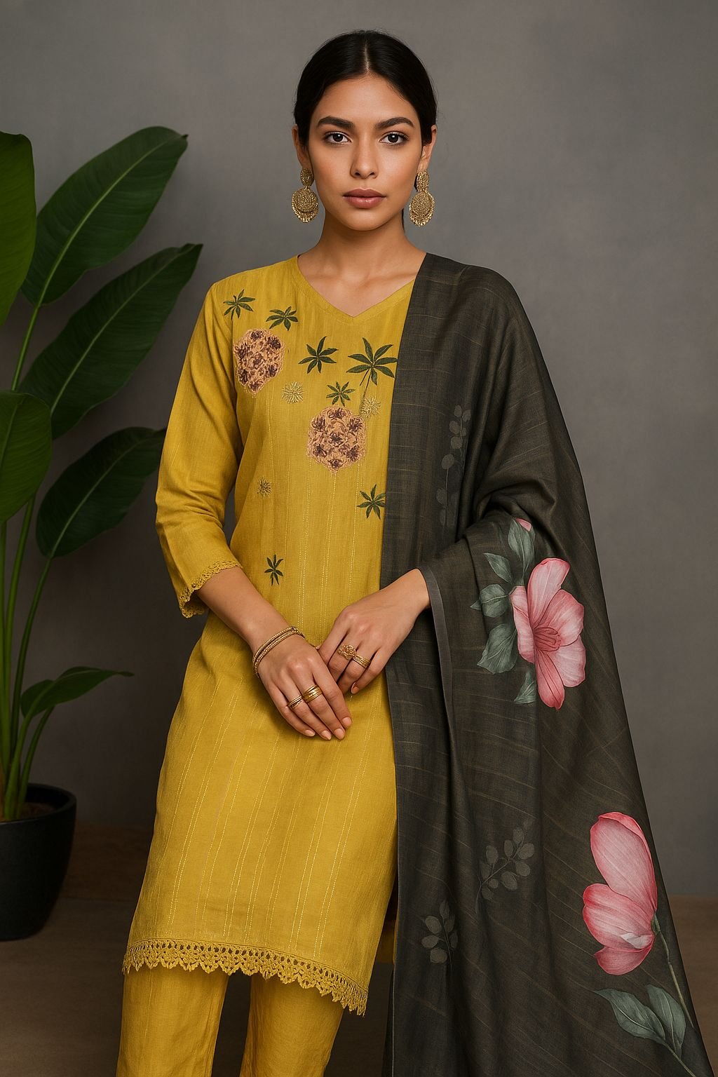 Color Palette: Mustard yellow kurta & pants with a charcoal black floral dupatta