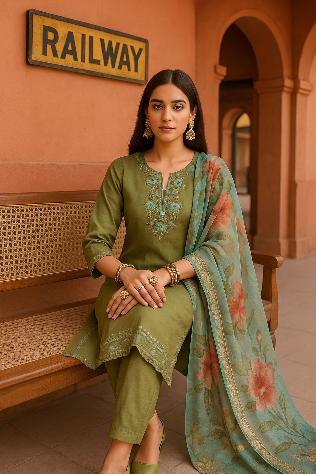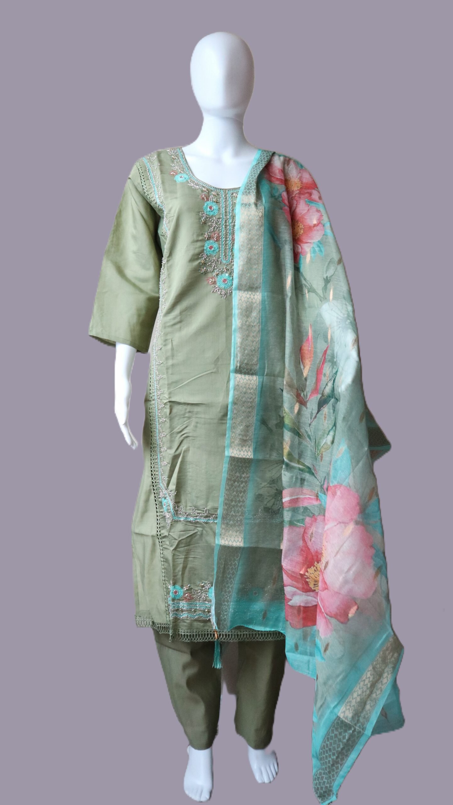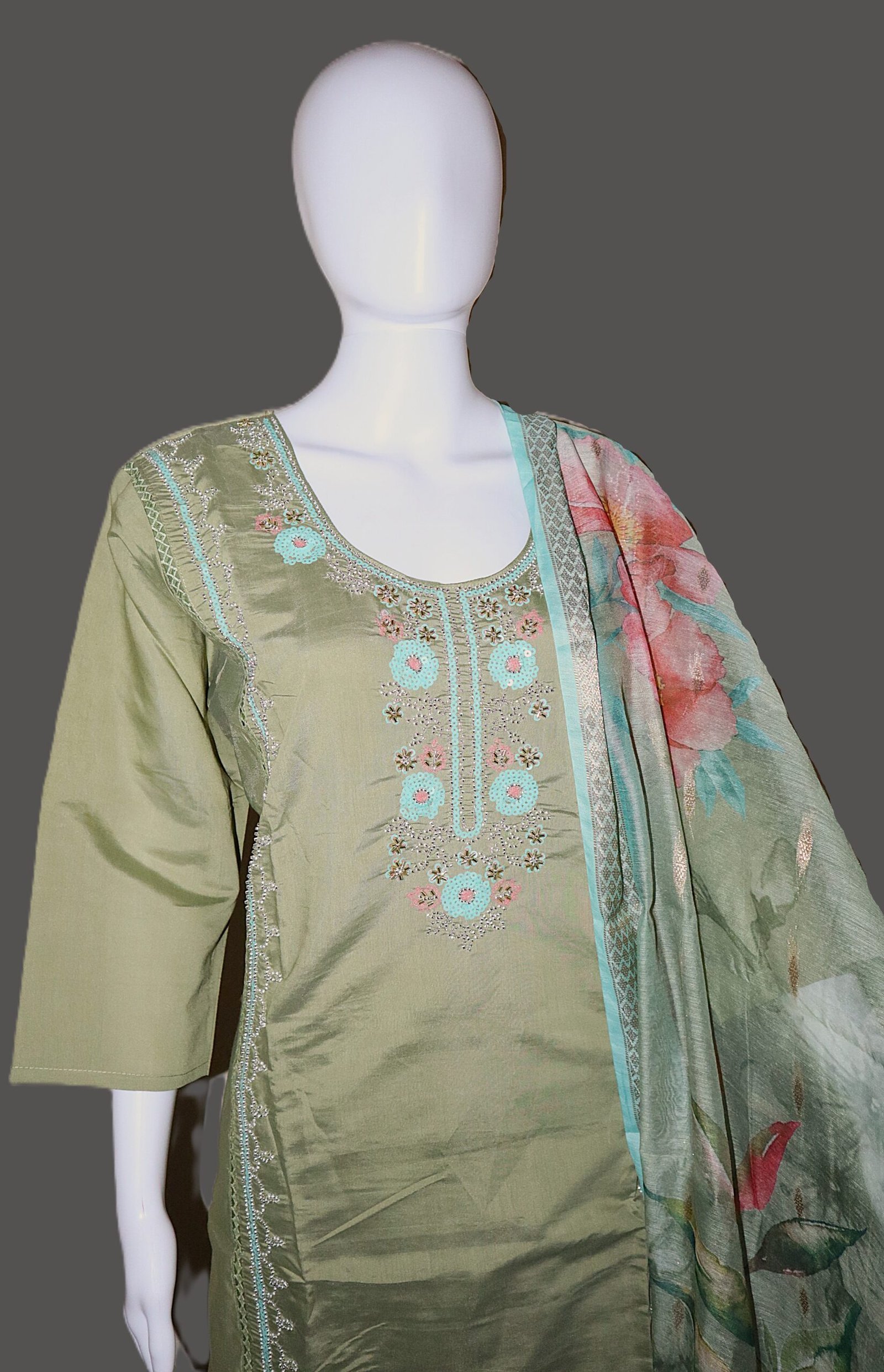 Add effortless grace to your ethnic wardrobe with this elegant olive green 3-piece suit set crafted from luxurious Roman Silk fabric. The kurta features delicate thread and sequin embroidery in soft pastel hues, beautifully enhancing the rich sheen of Roman Silk. Paired with matching pants and a stunning lightweight organza-style dupatta with digital floral prints, this ensemble brings together timeless tradition and contemporary charm.