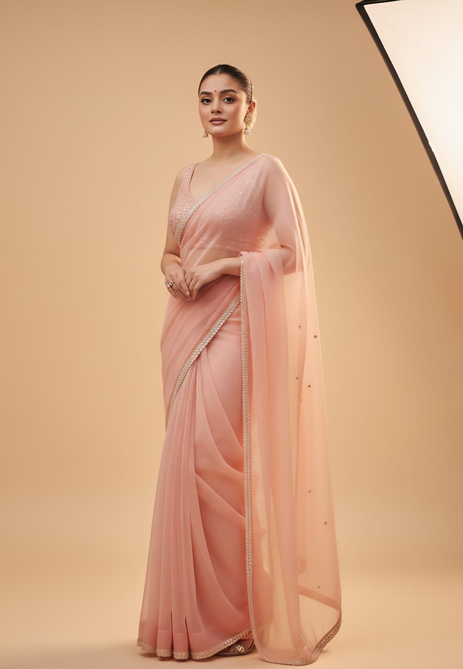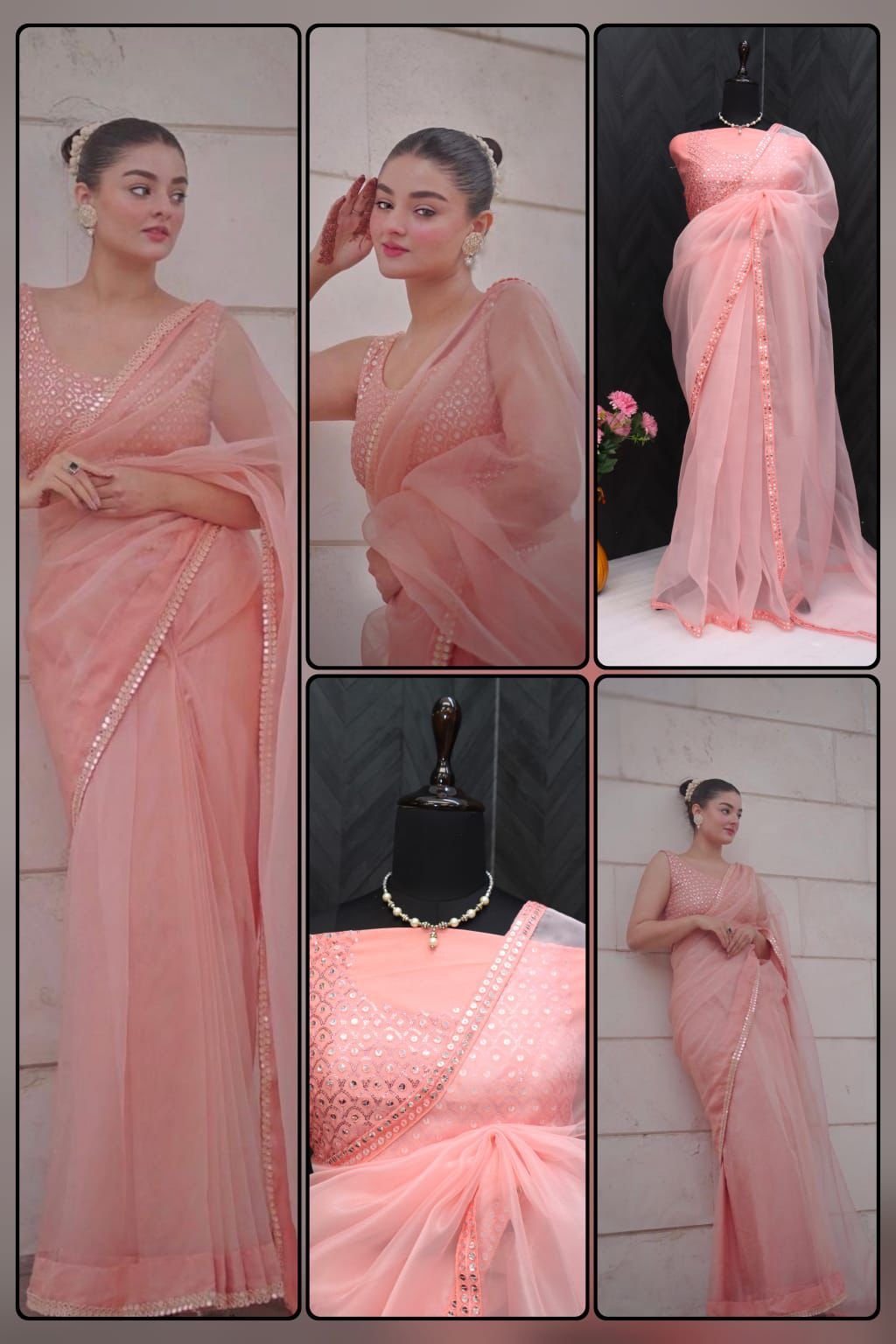 The saree is beautifully embellished with delicate sequin and mirror work along the border, paired with a matching embroidered silk blouse, creating a refined yet dazzling ensemble. The translucent flow of the organza fabric adds a romantic charm, making you look effortlessly graceful from every angle.