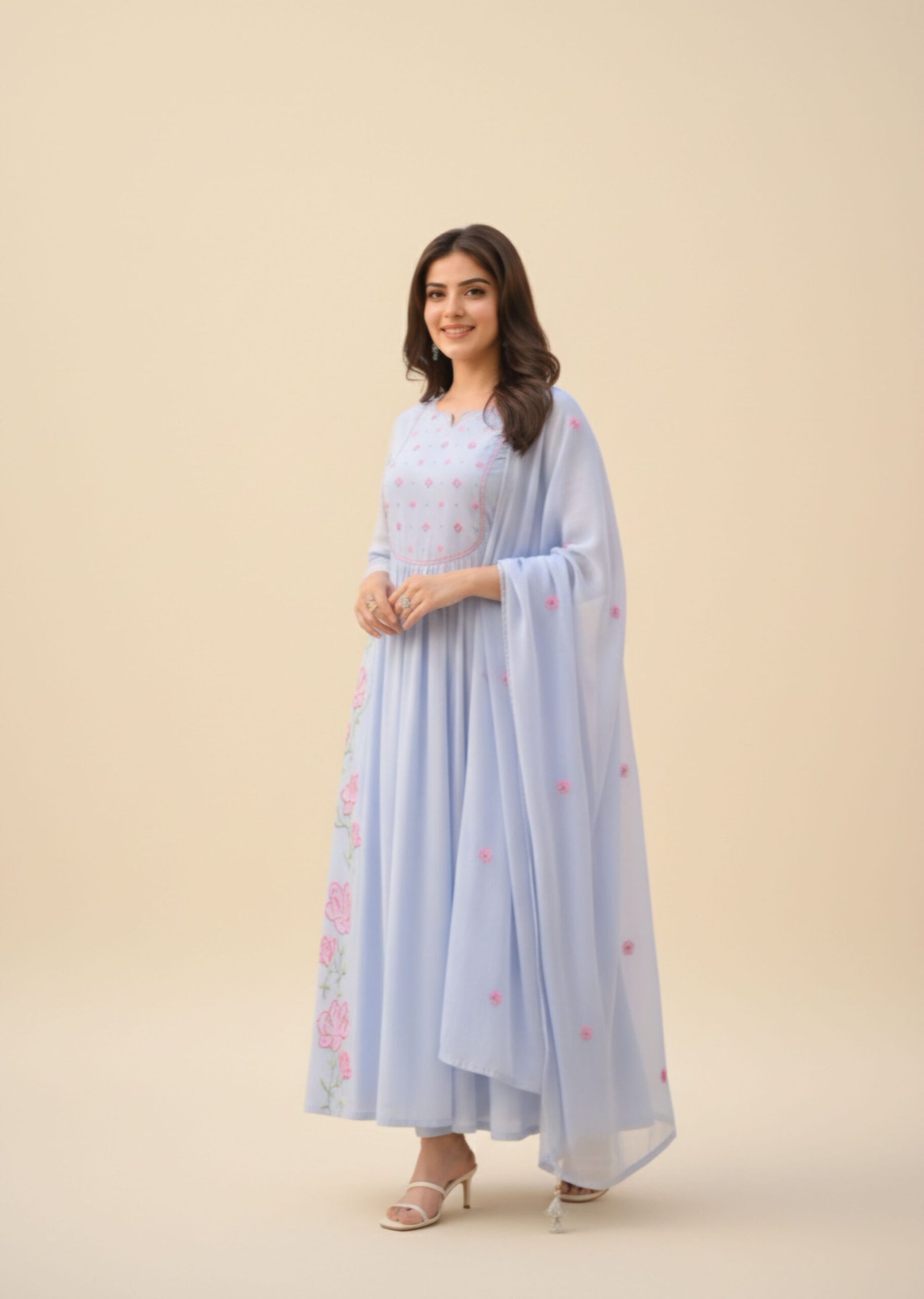 The A-line kurta features delicate pink floral embroidery on the yoke and hemline, adding a soft feminine touch to the look. The fabric drapes effortlessly, offering both comfort and luxury. Paired with matching silk-blend pants and a lightweight dupatta adorned with subtle floral motifs, this outfit creates a timeless silhouette suitable for any occasion.