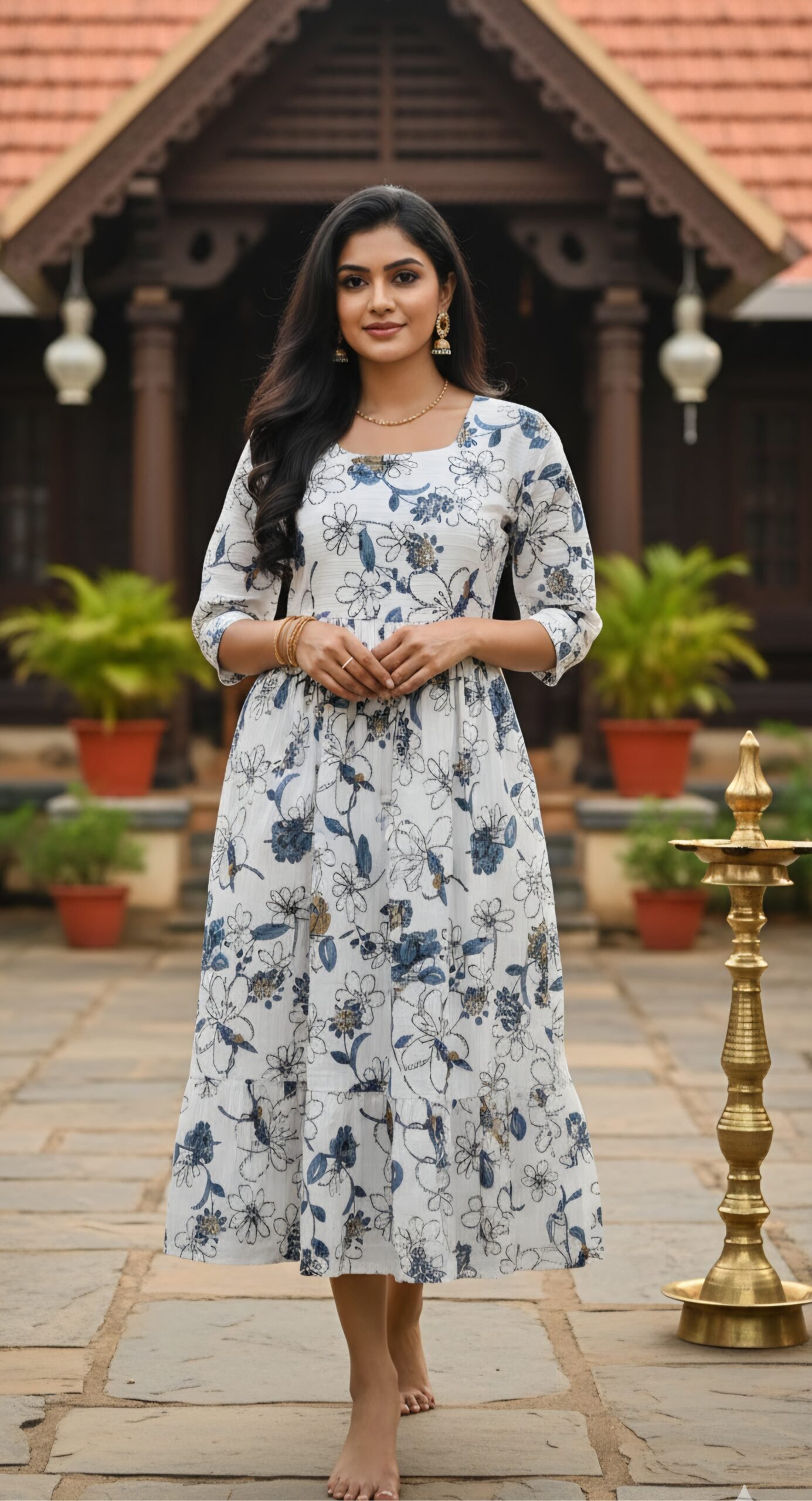 The charming hand-sketched floral print adds a refreshing and feminine touch, while the fit-and-flare silhouette enhances your shape without compromising comfort. Featuring ¾ sleeves, a flattering square neckline, and a tiered midi-length hem, this kurthi blends traditional charm with modern design.