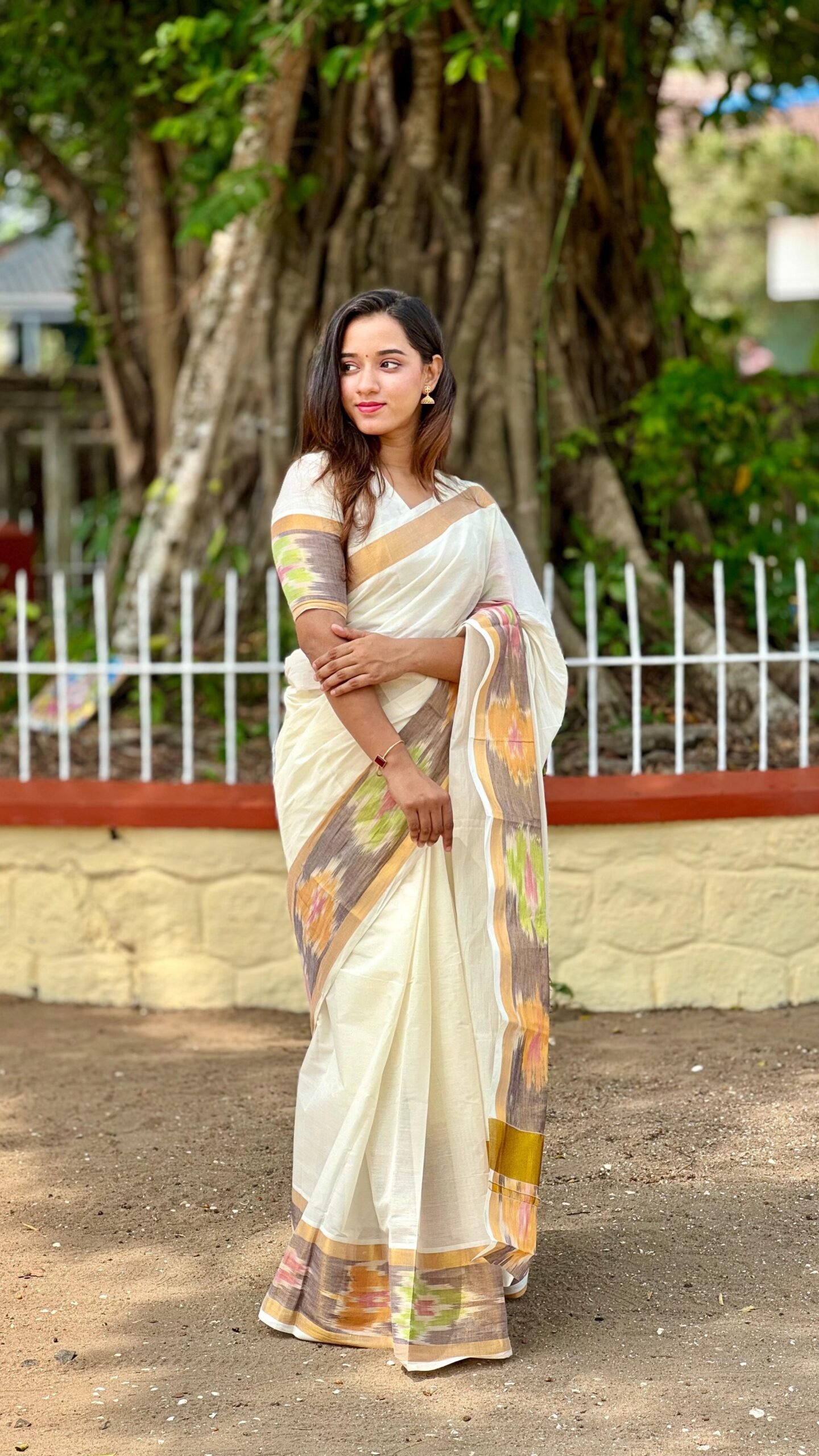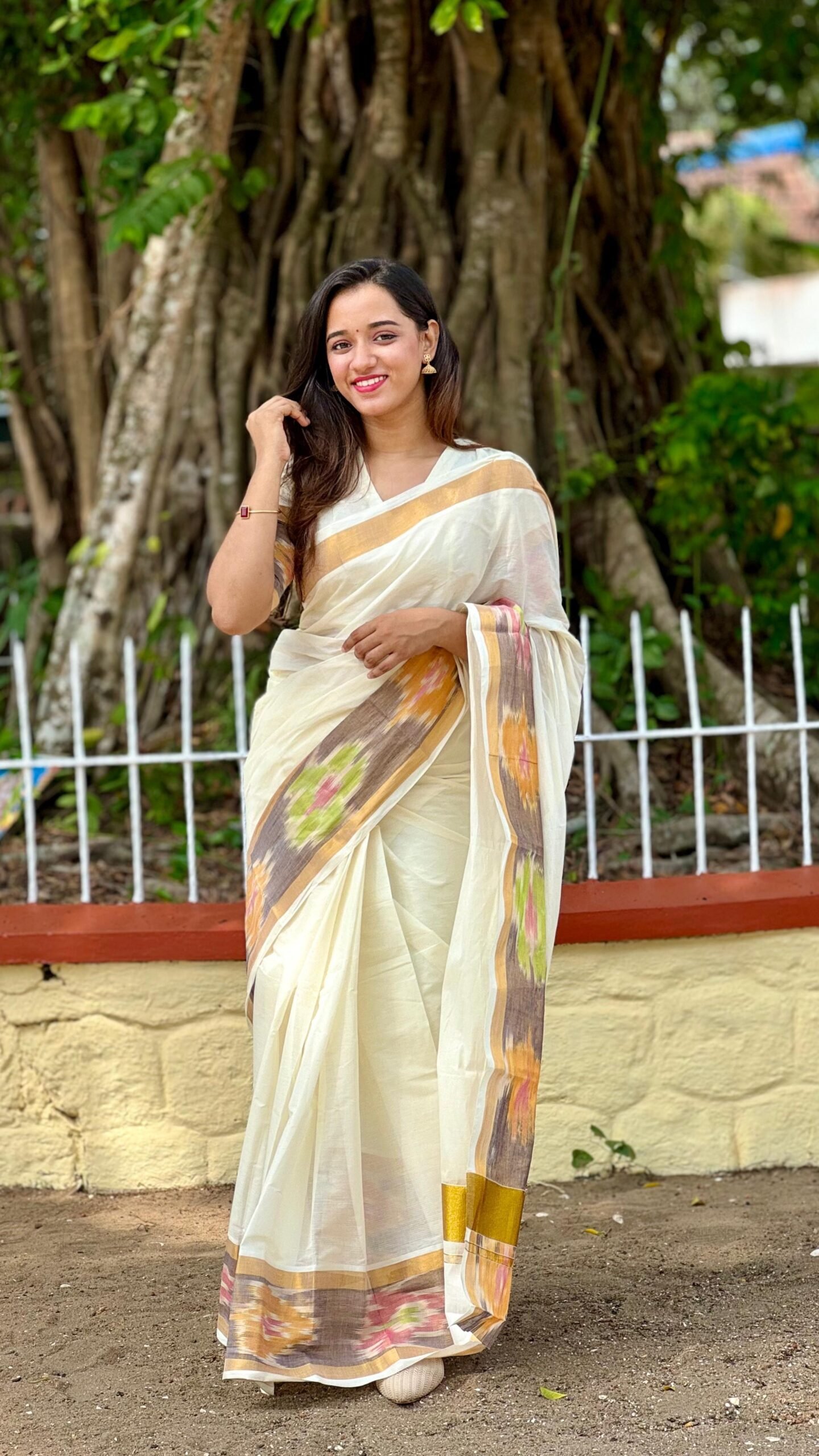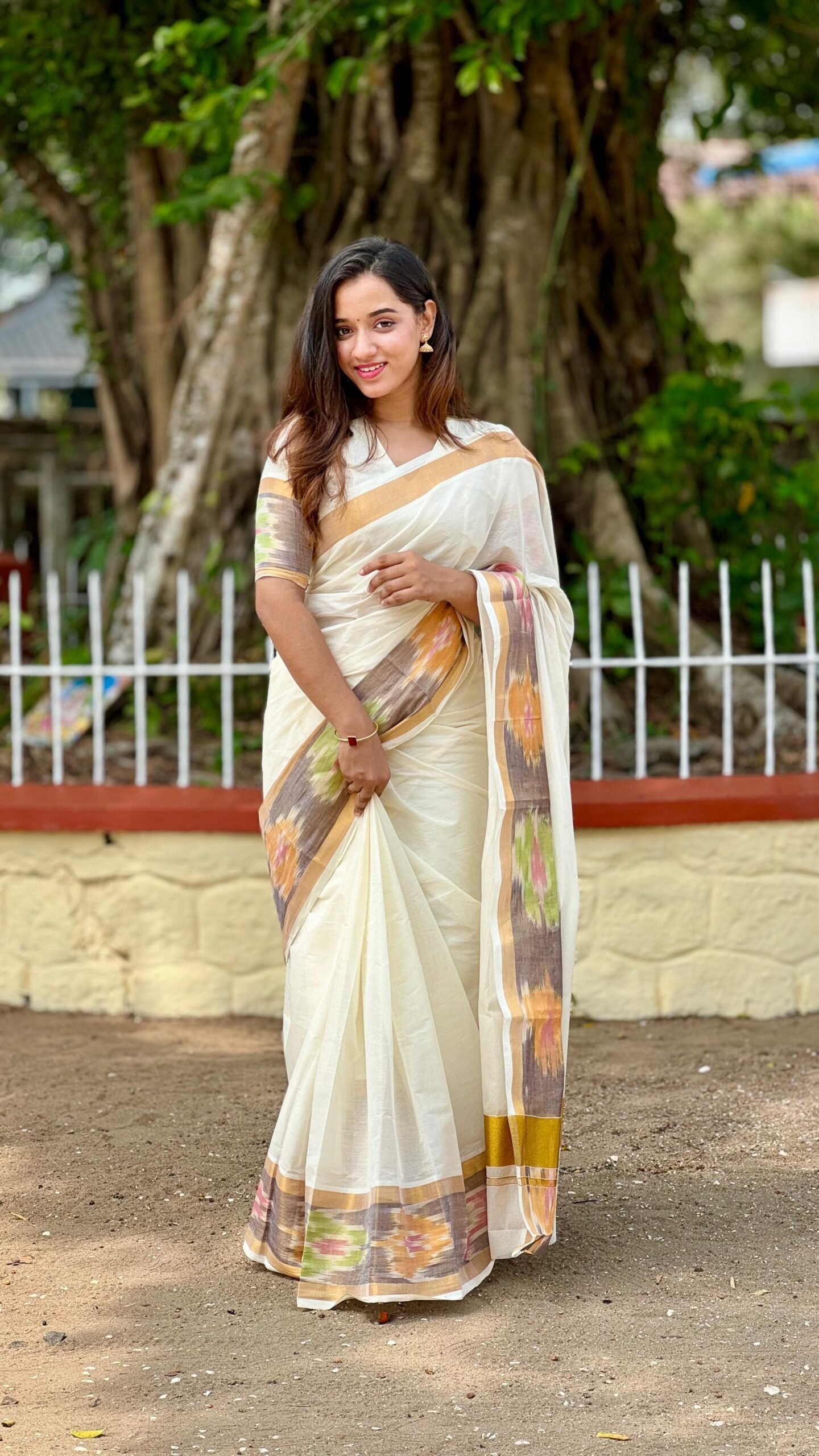 - Style: Traditional Kerala Saree with Pochampally Border