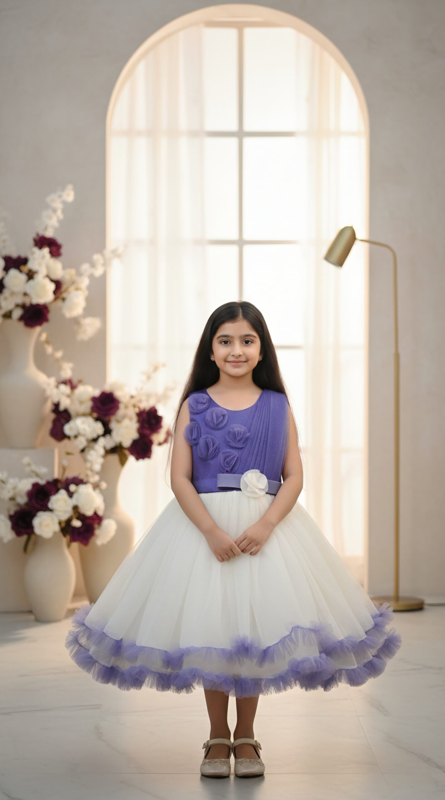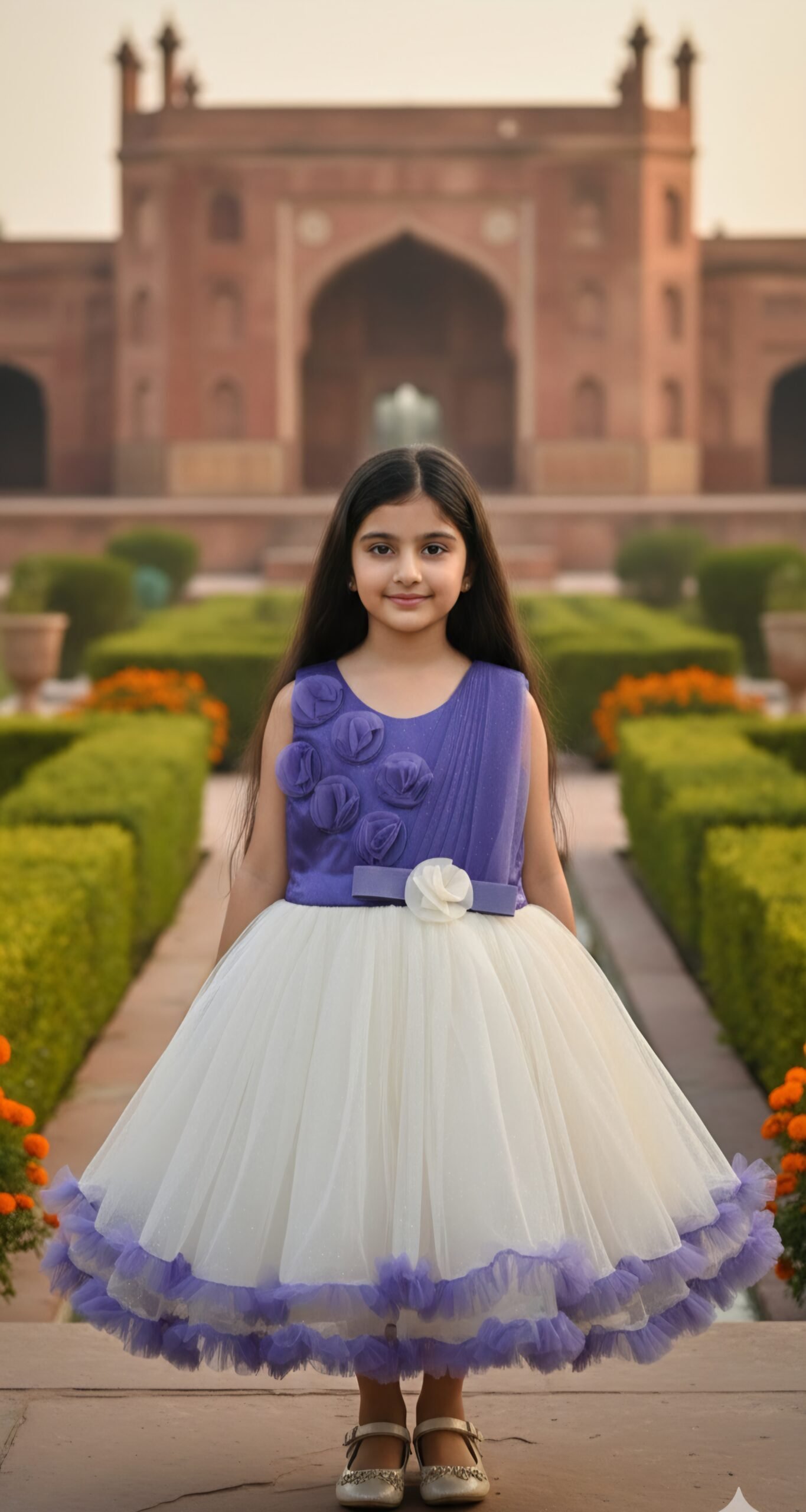 Add a touch of elegance to your little one’s wardrobe with this stunning Purple & White Party Frock — a perfect blend of grace, comfort, and festive charm. The sleeveless purple bodice features beautiful 3D floral appliqués and delicate pleated detailing, giving the dress a premium designer look.
