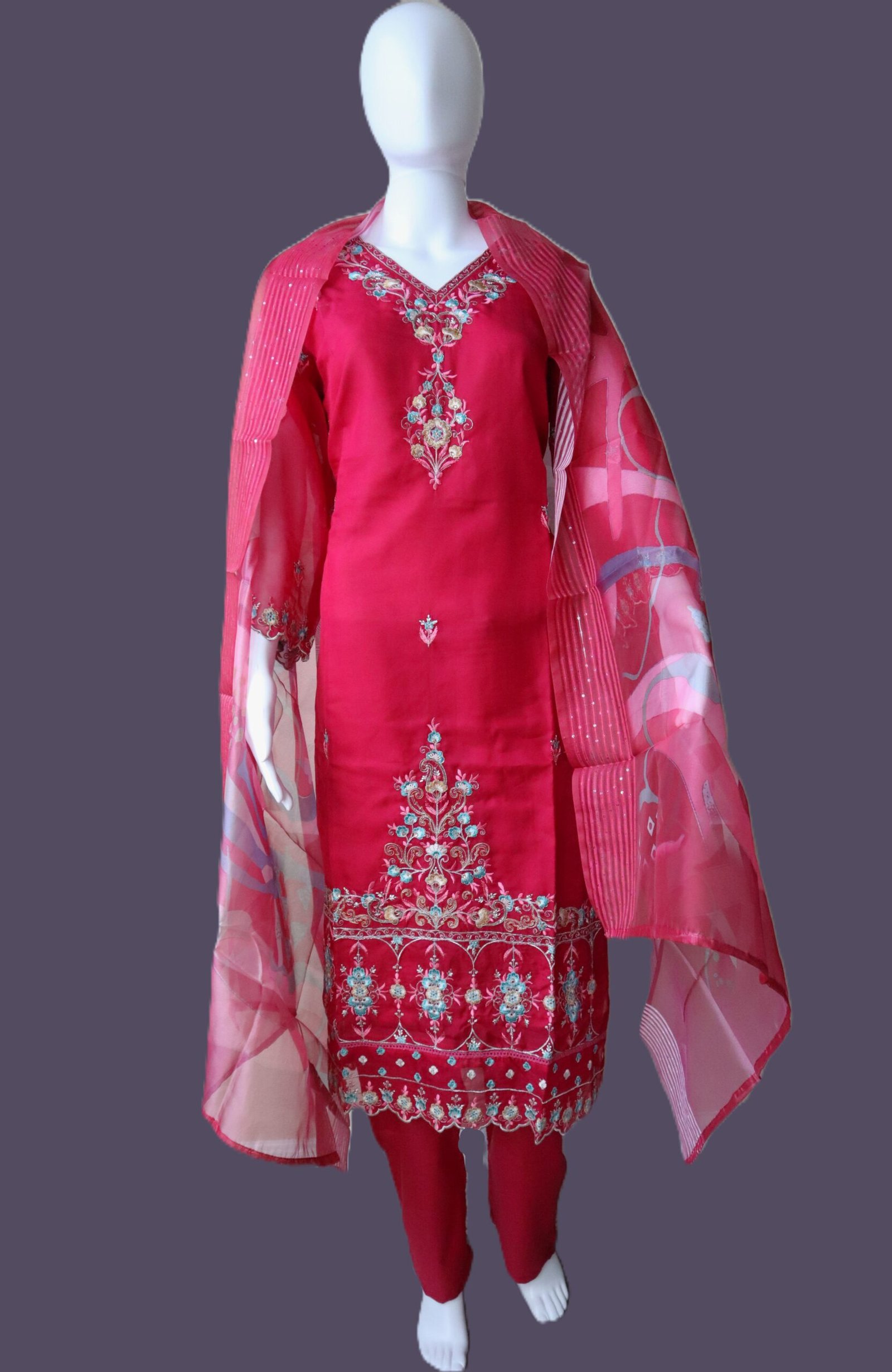 Turn heads with timeless elegance in this beautifully crafted three-piece suit, designed in premium Jimmi Choo fabric for a rich, luxurious finish. The vibrant rose pink kurta features intricate thread and sequin embroidery, meticulously placed along the neckline, hem, and sleeves, adding regal charm to your ethnic ensemble.