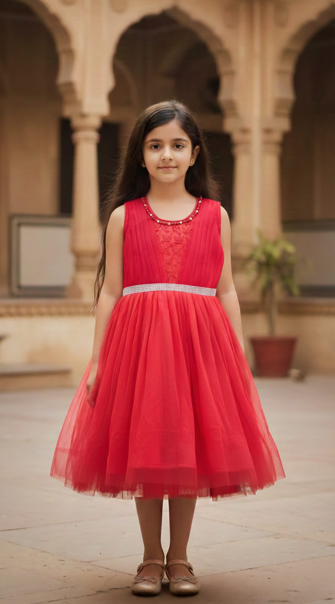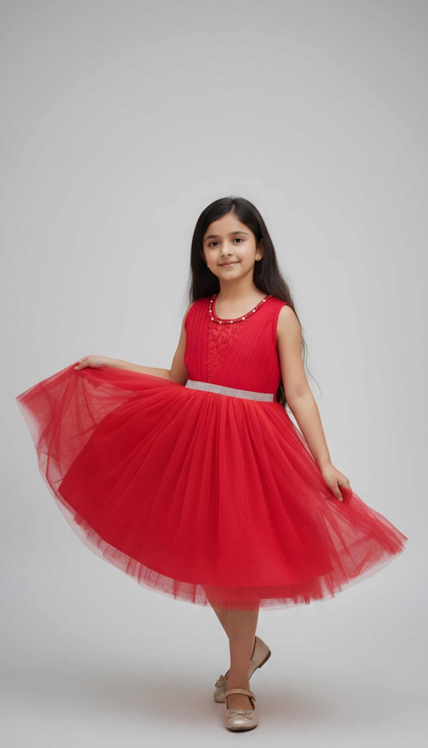 Make every celebration extra special with this beautiful Red Party Wear Dress for Girls. Designed with a stylish sleeveless bodice and delicate front lace detailing, this dress gives a perfect blend of elegance and comfort. The flared soft net skirt adds volume and charm, making your little one feel like a princess at every event.