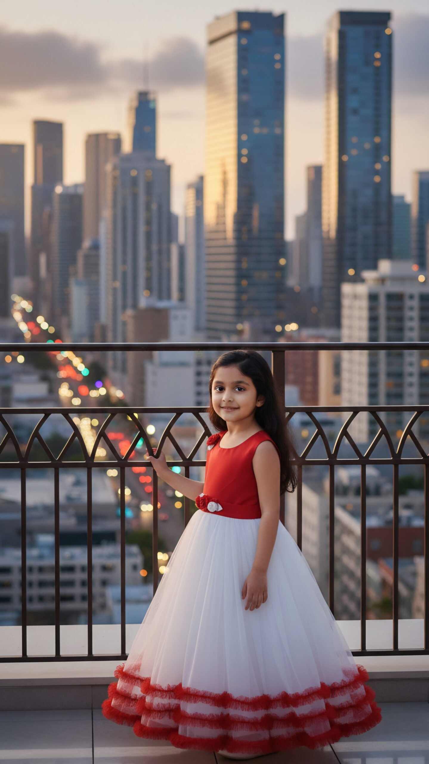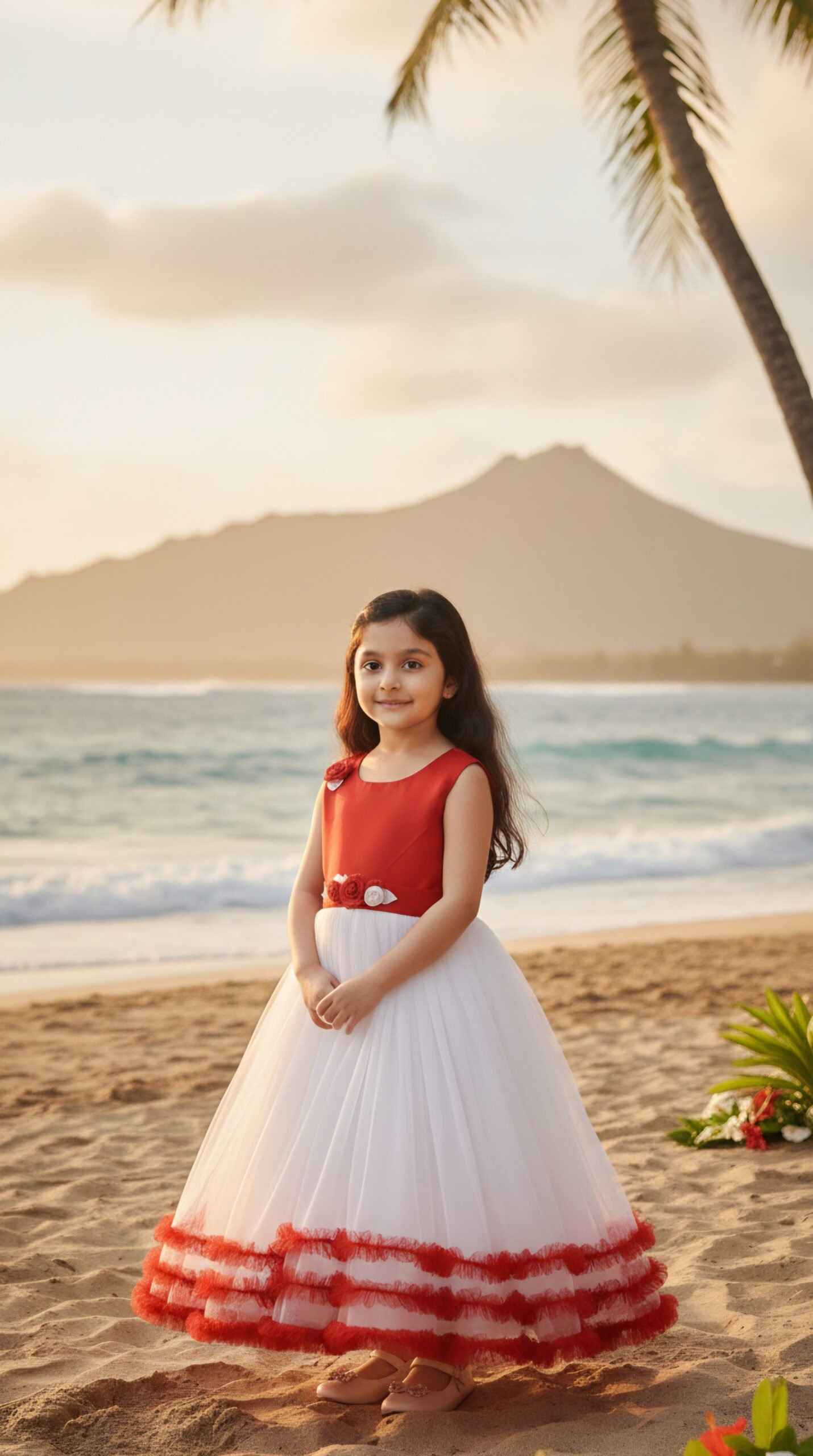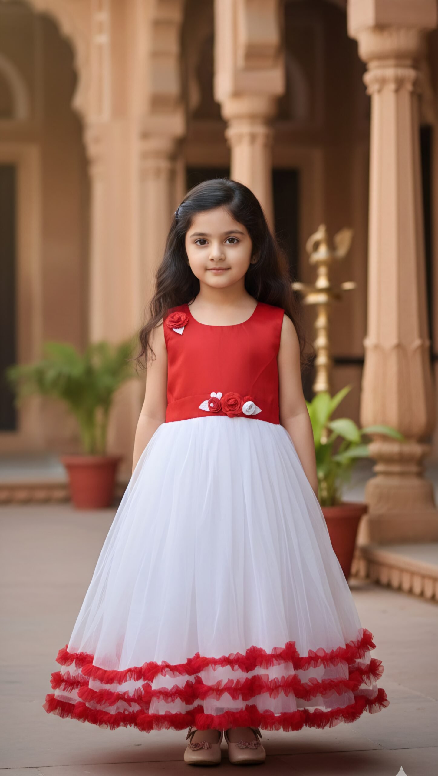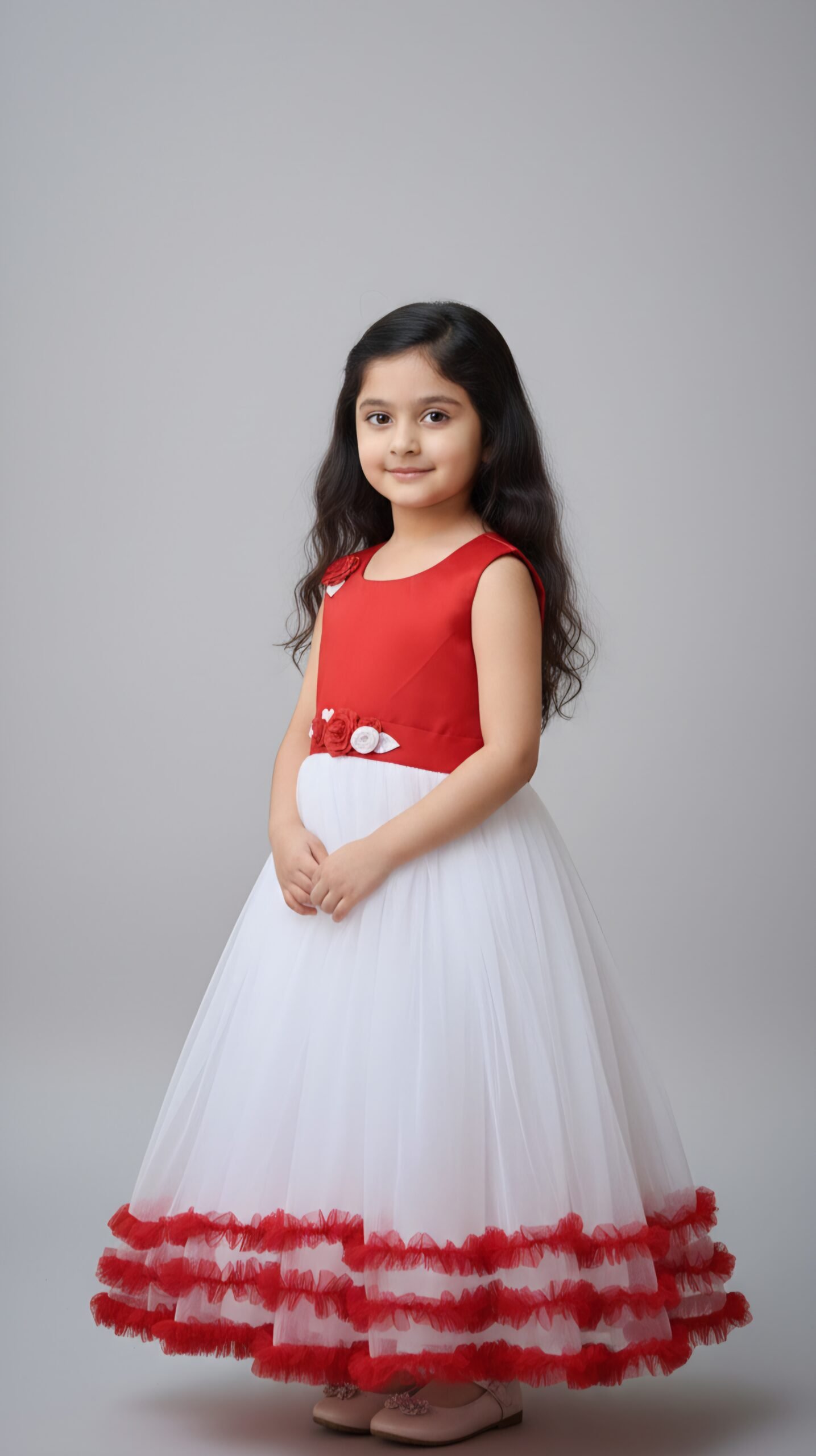 The lower half showcases a soft white tulle skirt, beautifully finished with layers of red ruffle detailing at the hem, giving the dress a graceful and eye-catching flair. Lightweight and breathable, this gown ensures all-day comfort—perfect for birthdays, weddings, photoshoots, festive celebrations, and school functions.