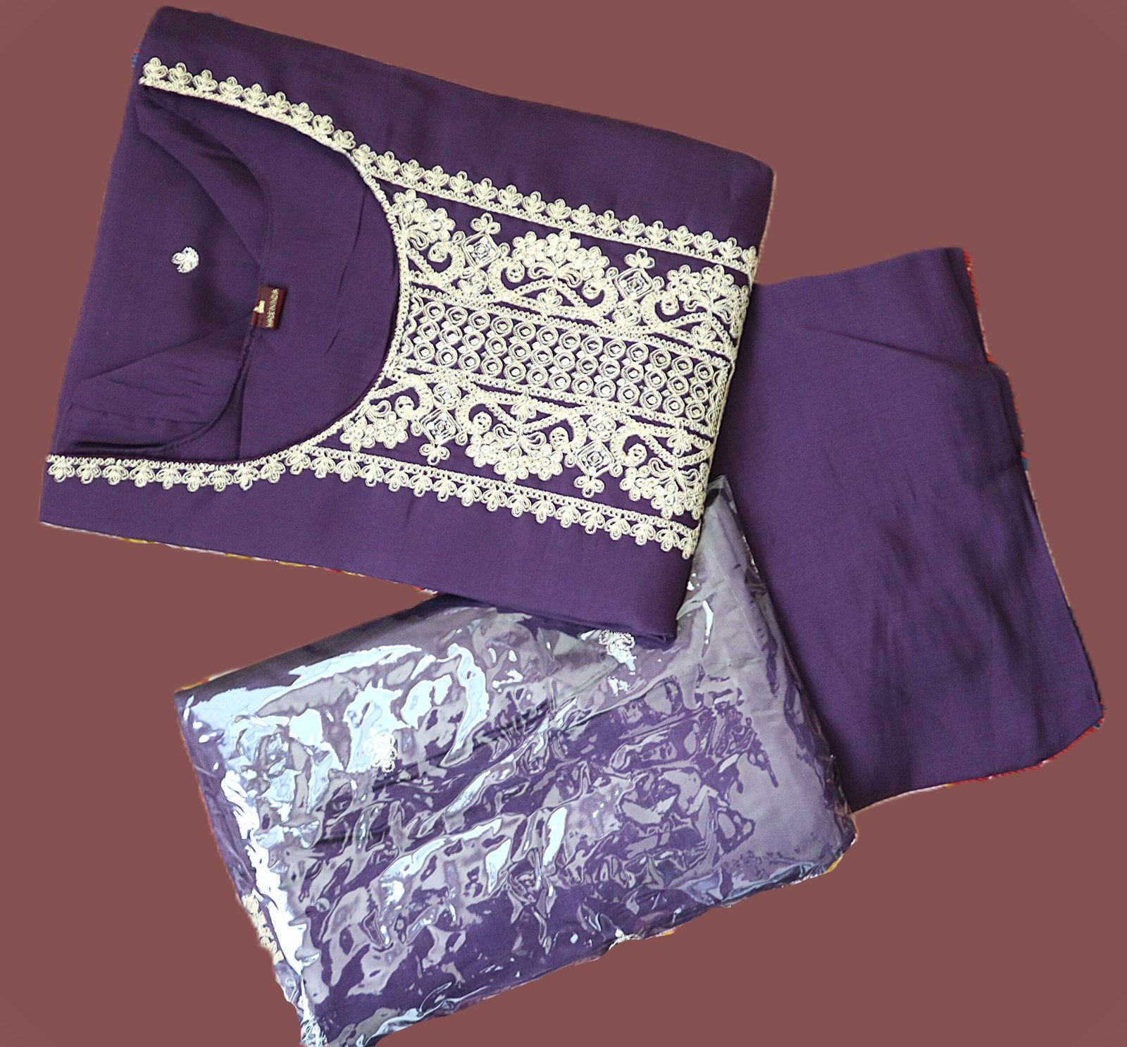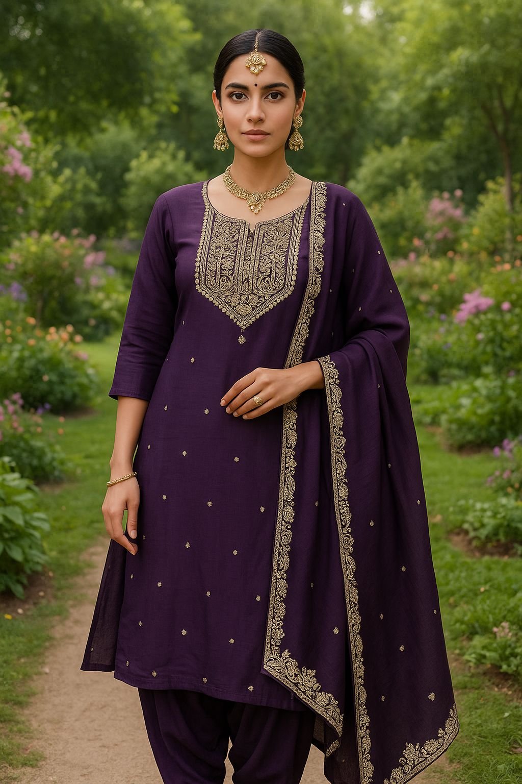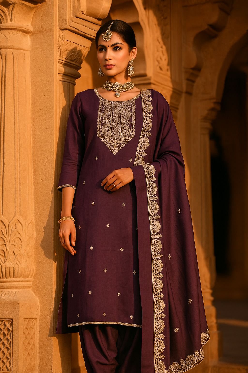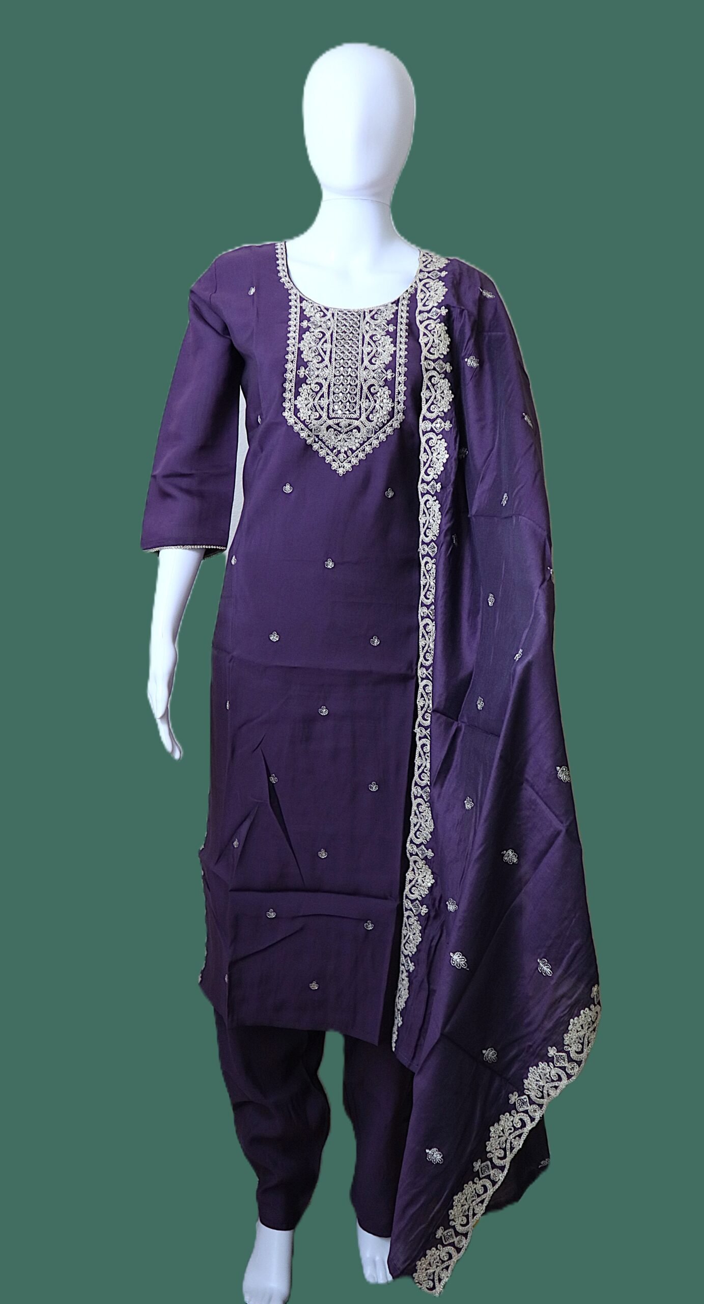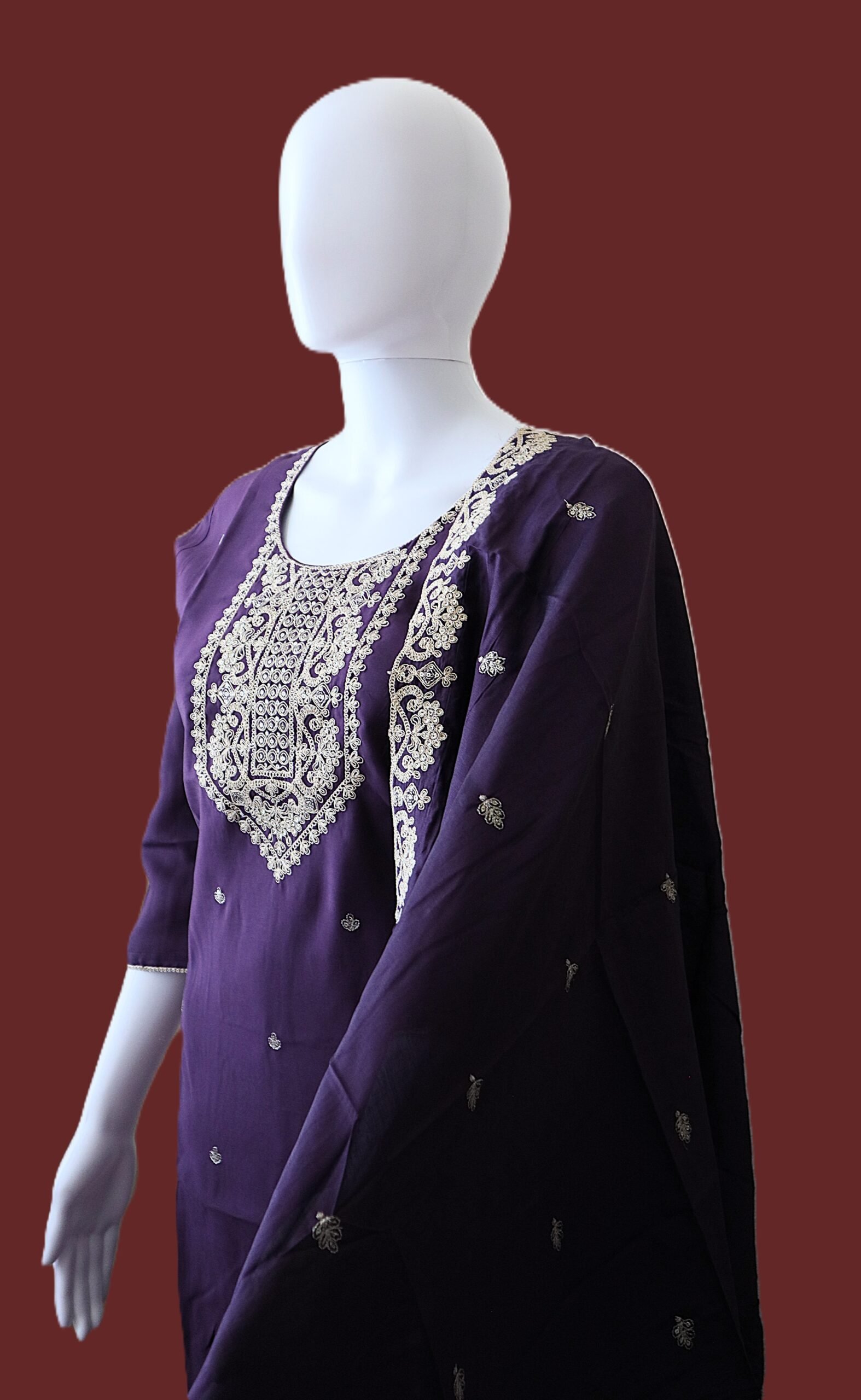 Make a stunning statement with this luxurious 3-piece Roman Silk suit set. Crafted in a rich purple shade, this ensemble features a beautifully embroidered kurta with intricate cream threadwork on the neckline and scattered delicate motifs throughout. Paired with a matching embroidered dupatta and coordinated bottom, this outfit effortlessly blends traditional elegance with modern charm.