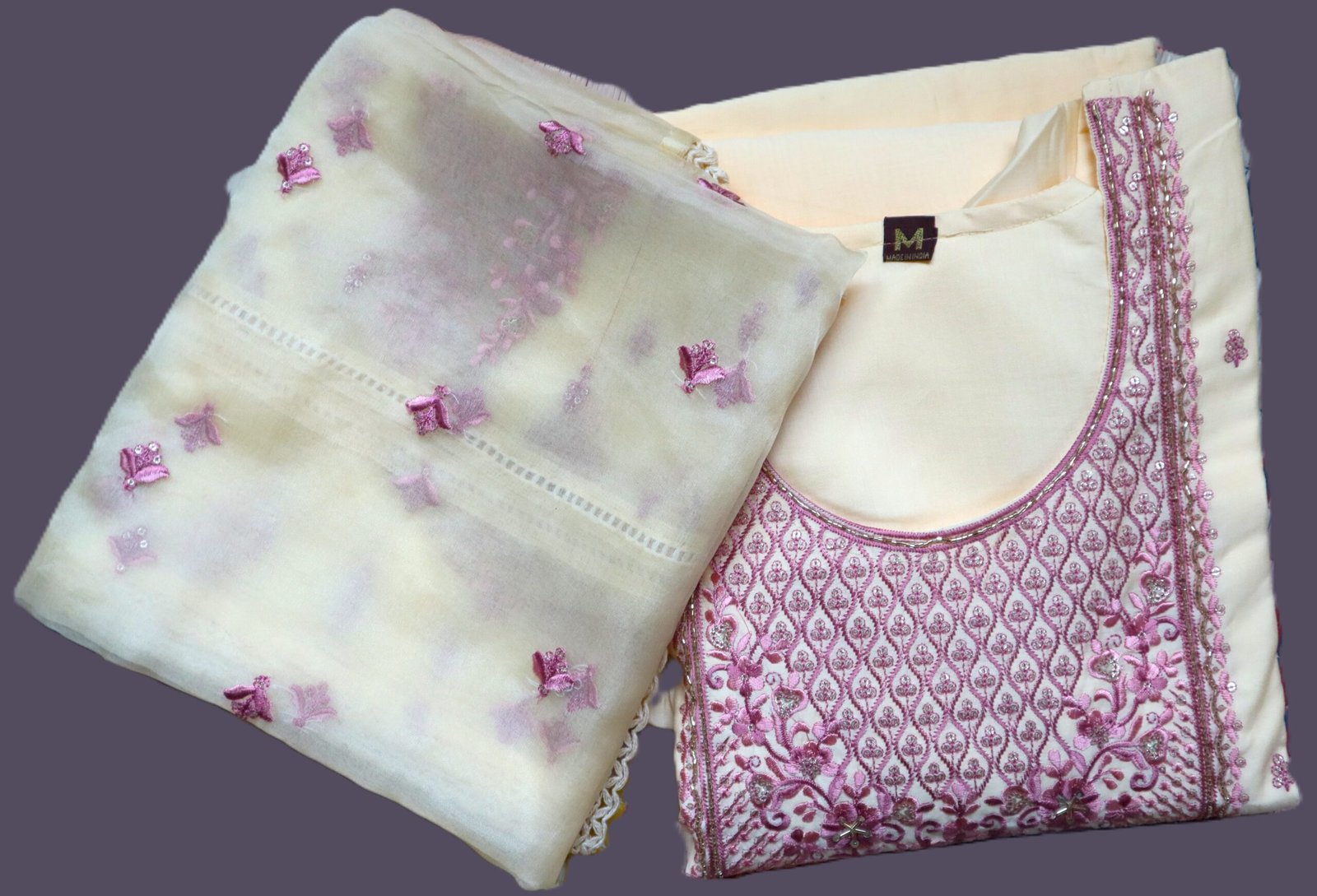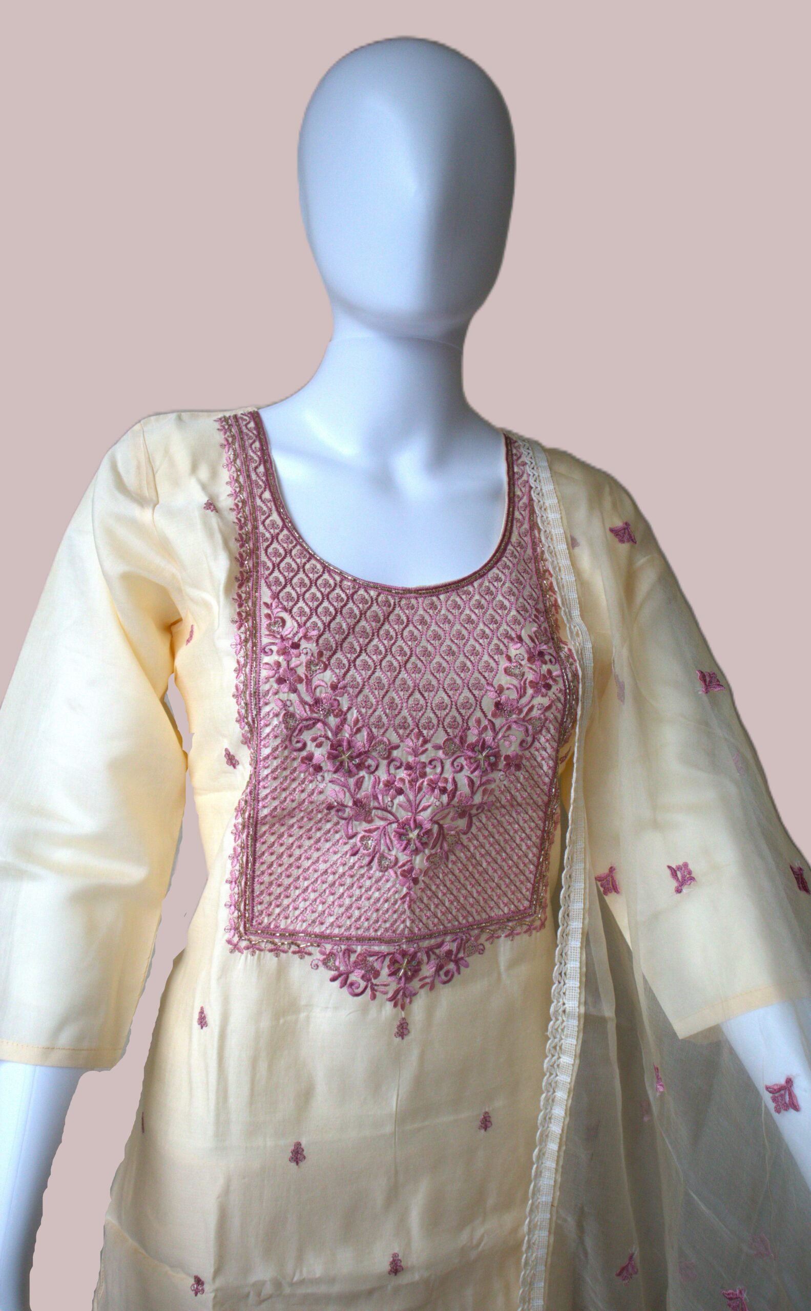 Elevate your ethnic style with this stunning Roman Silk kurta set, crafted for elegance and comfort. Featuring a soft cream base adorned with intricate pink embroidery, this ensemble exudes subtle sophistication. The kurta is beautifully paired with matching pants and a sheer, embroidered dupatta that adds a graceful touch to the outfit.