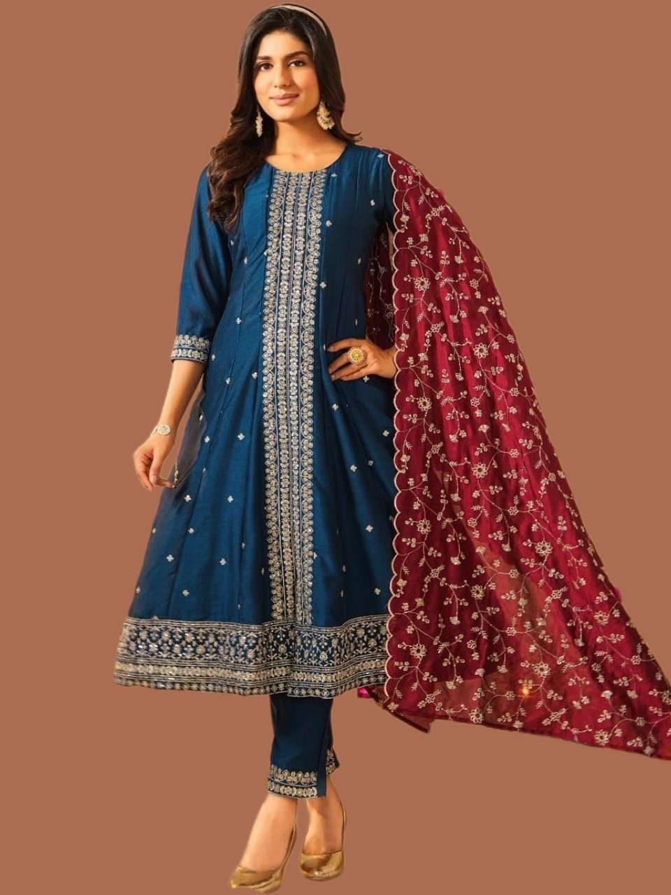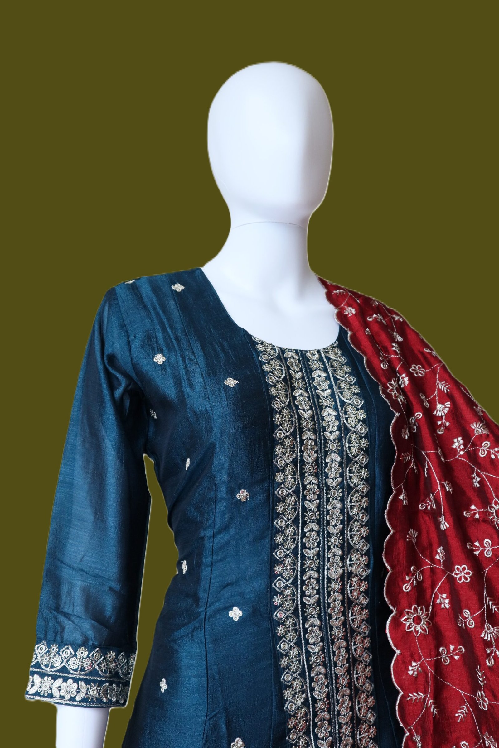 Turn heads this festive season with our stunning Vichitra Silk 3-Piece Set, a beautiful blend of elegance and ethnic charm. Featuring a rich royal blue kurta paired with a striking maroon dupatta, this set is crafted to add grace to every occasion.