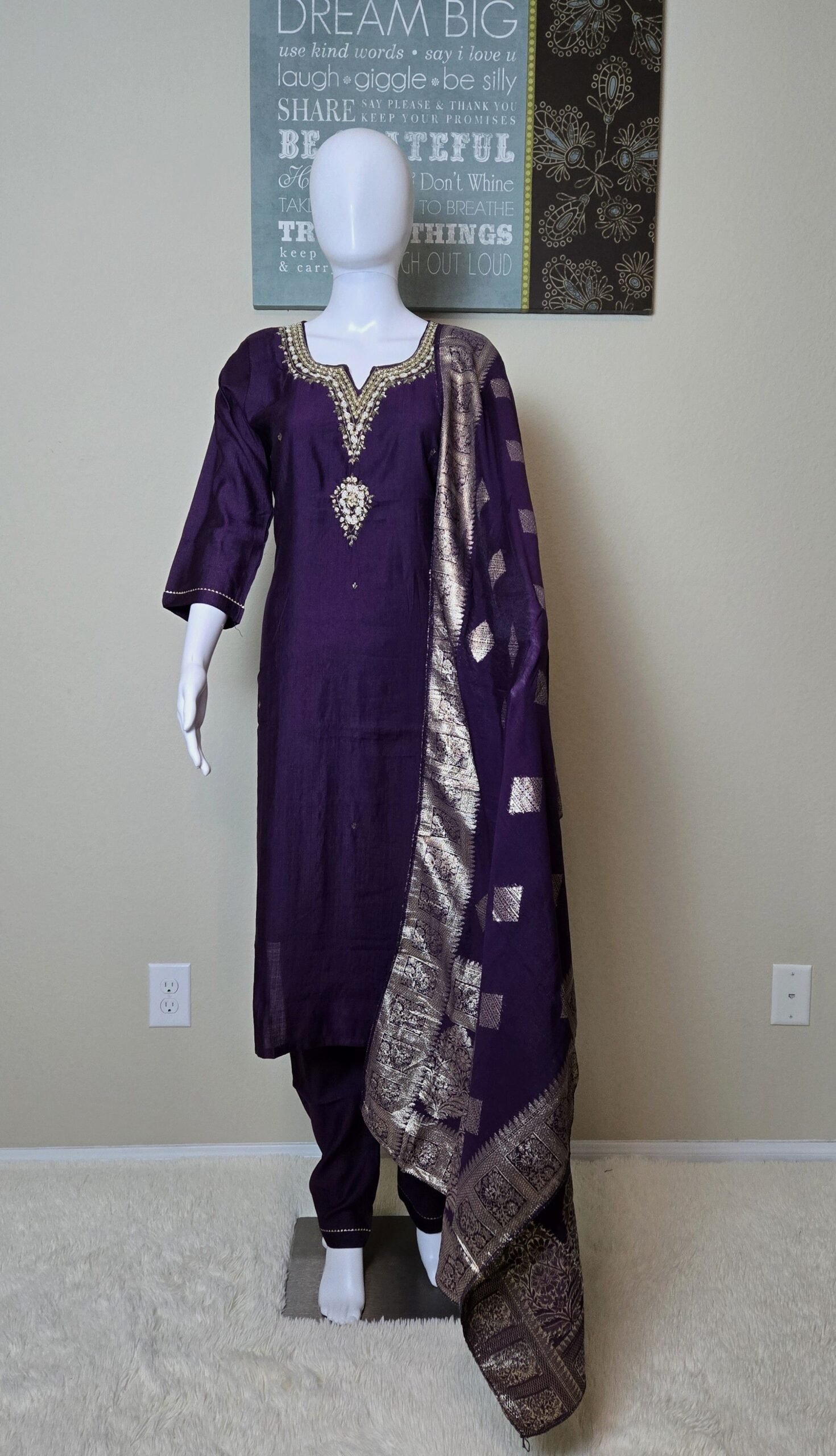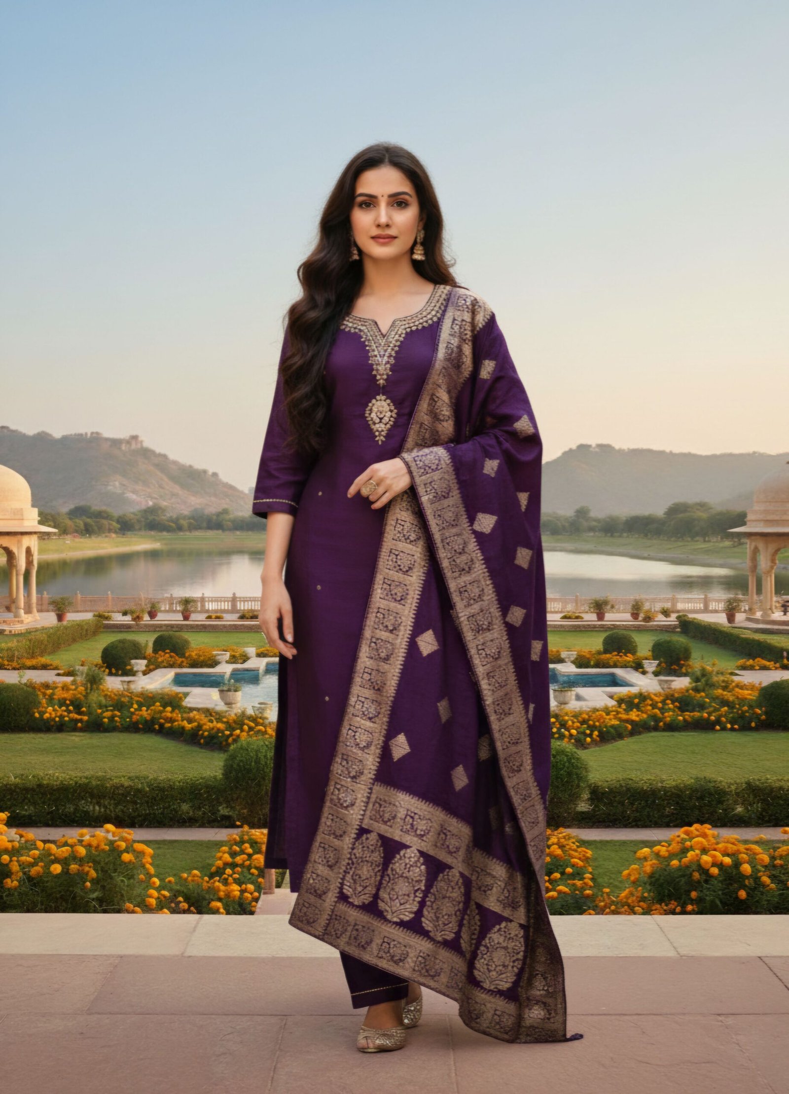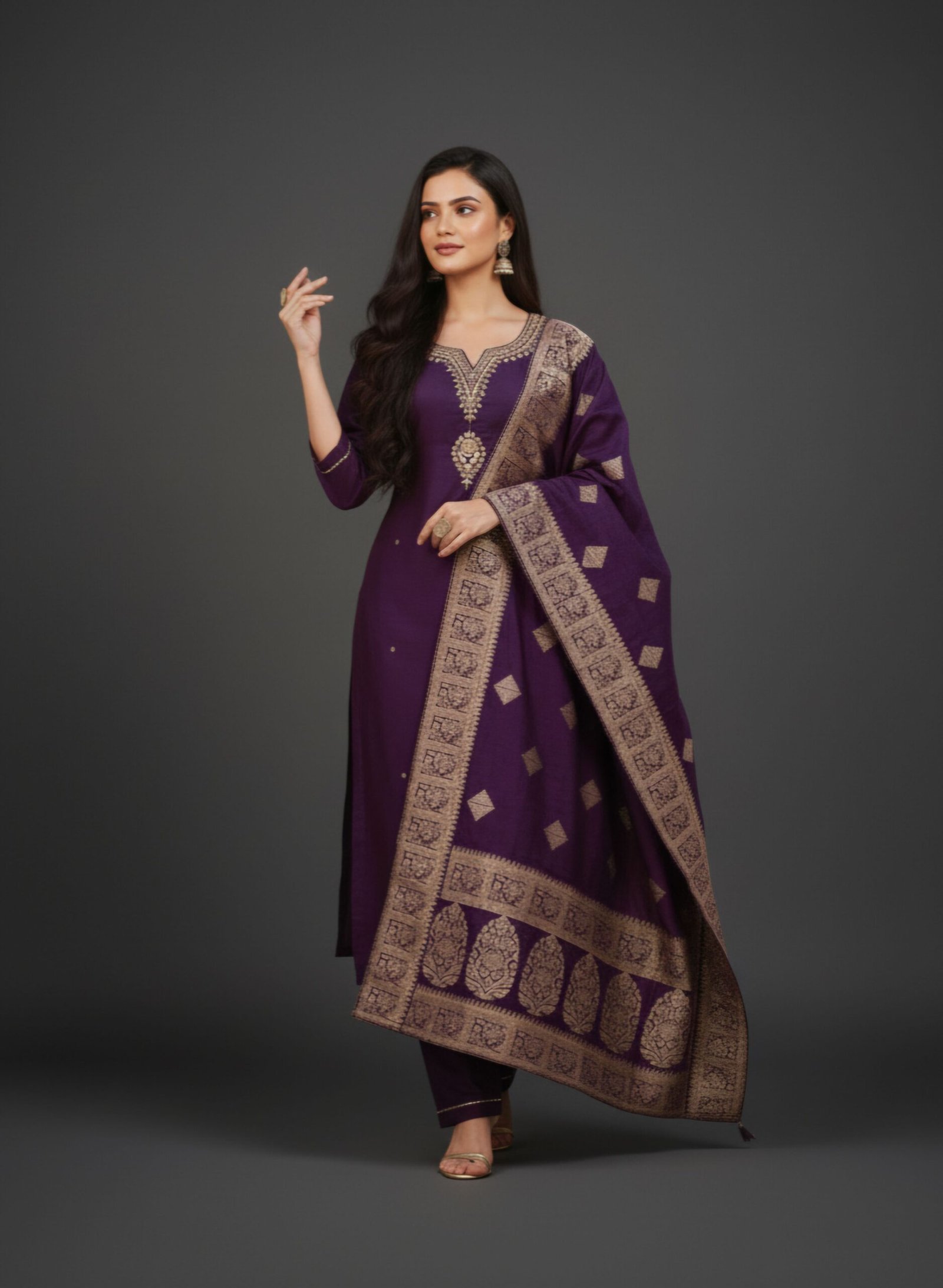 Step into timeless elegance with this exquisite Vatican Silk 3-Piece Suit Set from E&E Trends. Crafted from premium Vatican silk, this rich royal purple ensemble radiates sophistication and luxury. The straight-cut kurta features intricate zari and mirror embroidery along the neckline, adding a regal touch to your festive look.