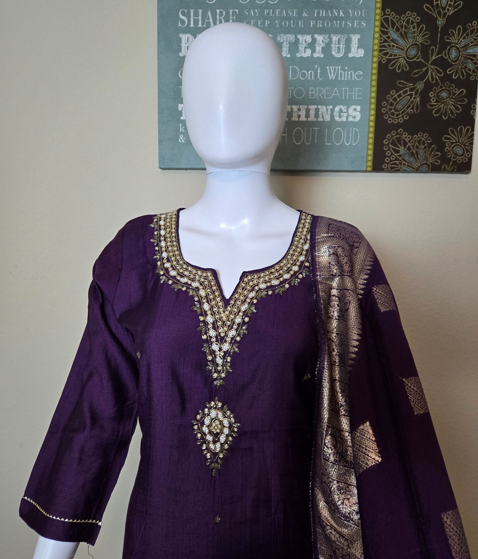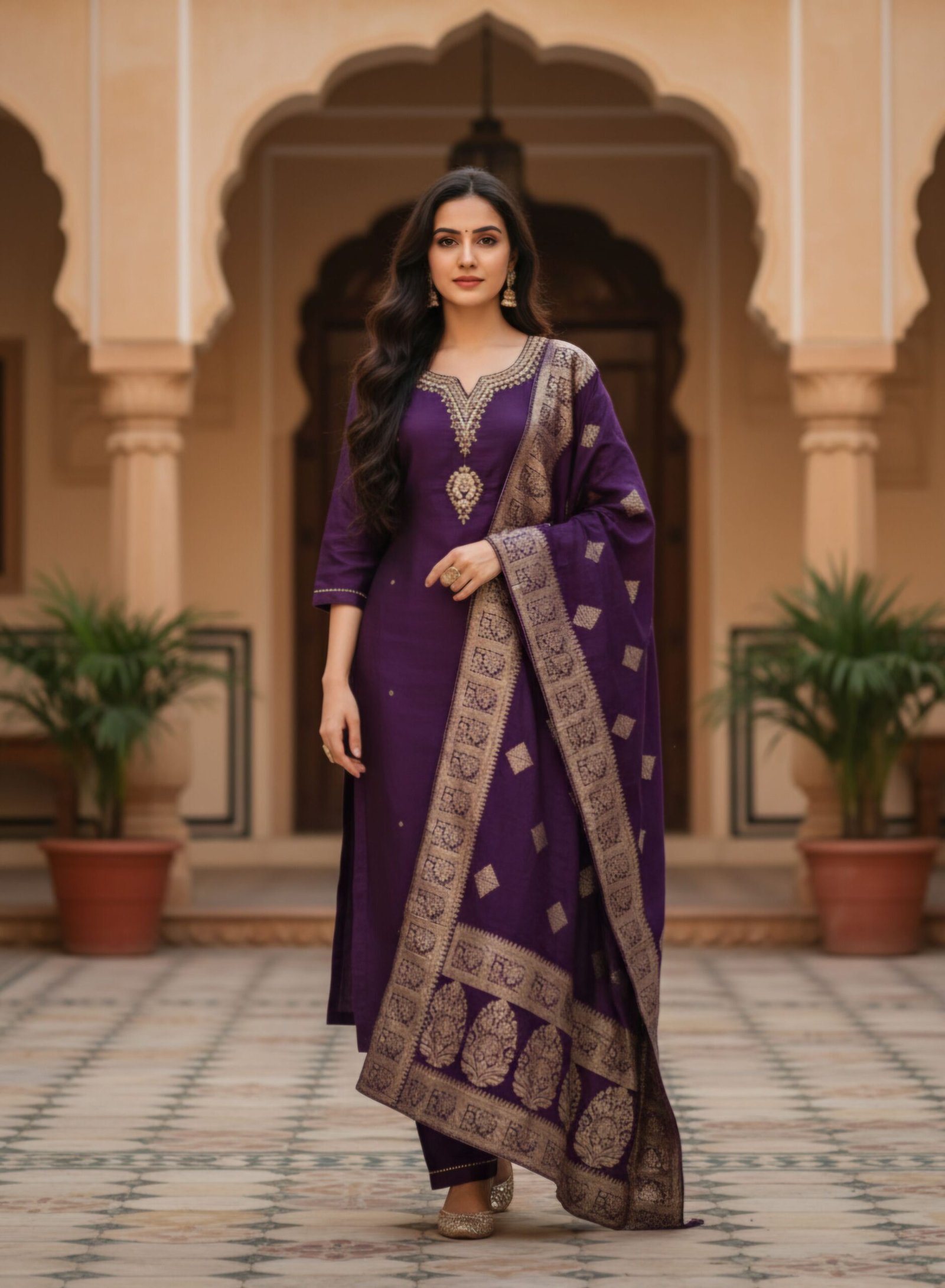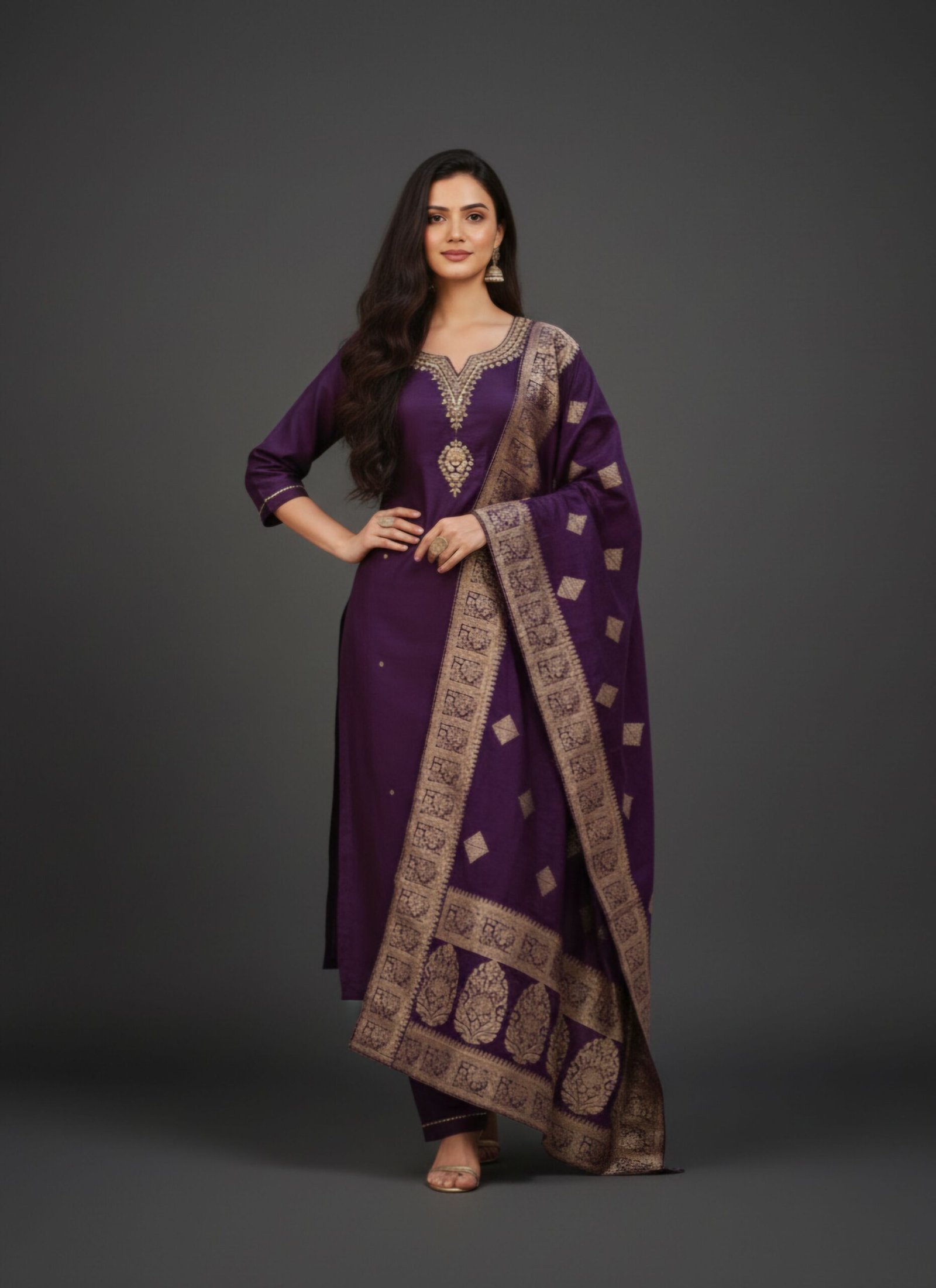 Step into timeless elegance with this exquisite Vatican Silk 3-Piece Suit Set from E&E Trends. Crafted from premium Vatican silk, this rich royal purple ensemble radiates sophistication and luxury. The straight-cut kurta features intricate zari and mirror embroidery along the neckline, adding a regal touch to your festive look.