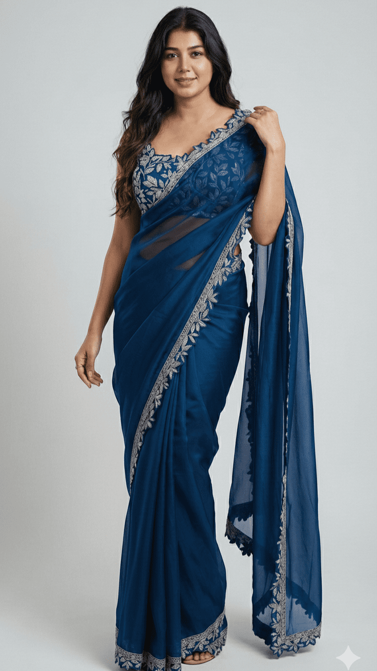 The saree is beautifully accented with intricate silver Zari floral embroidery along the border and pallu, adding a regal charm without overpowering the look. Lightweight, flowy, and comfortable, it is perfect for long celebrations while maintaining a refined silhouette.