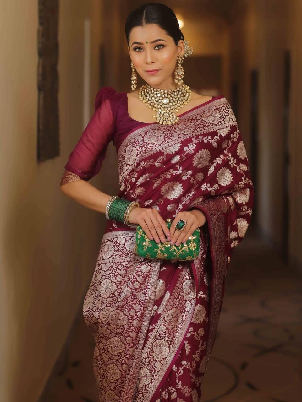 Paired with statement jewelry, as seen in the image, this saree becomes a timeless piece that speaks of heritage and sophistication.