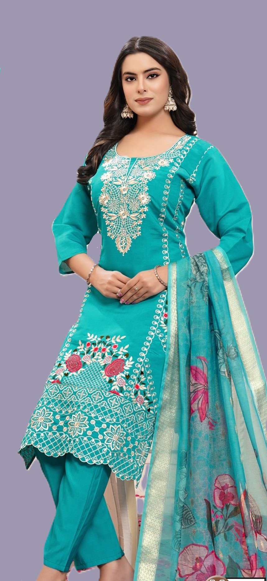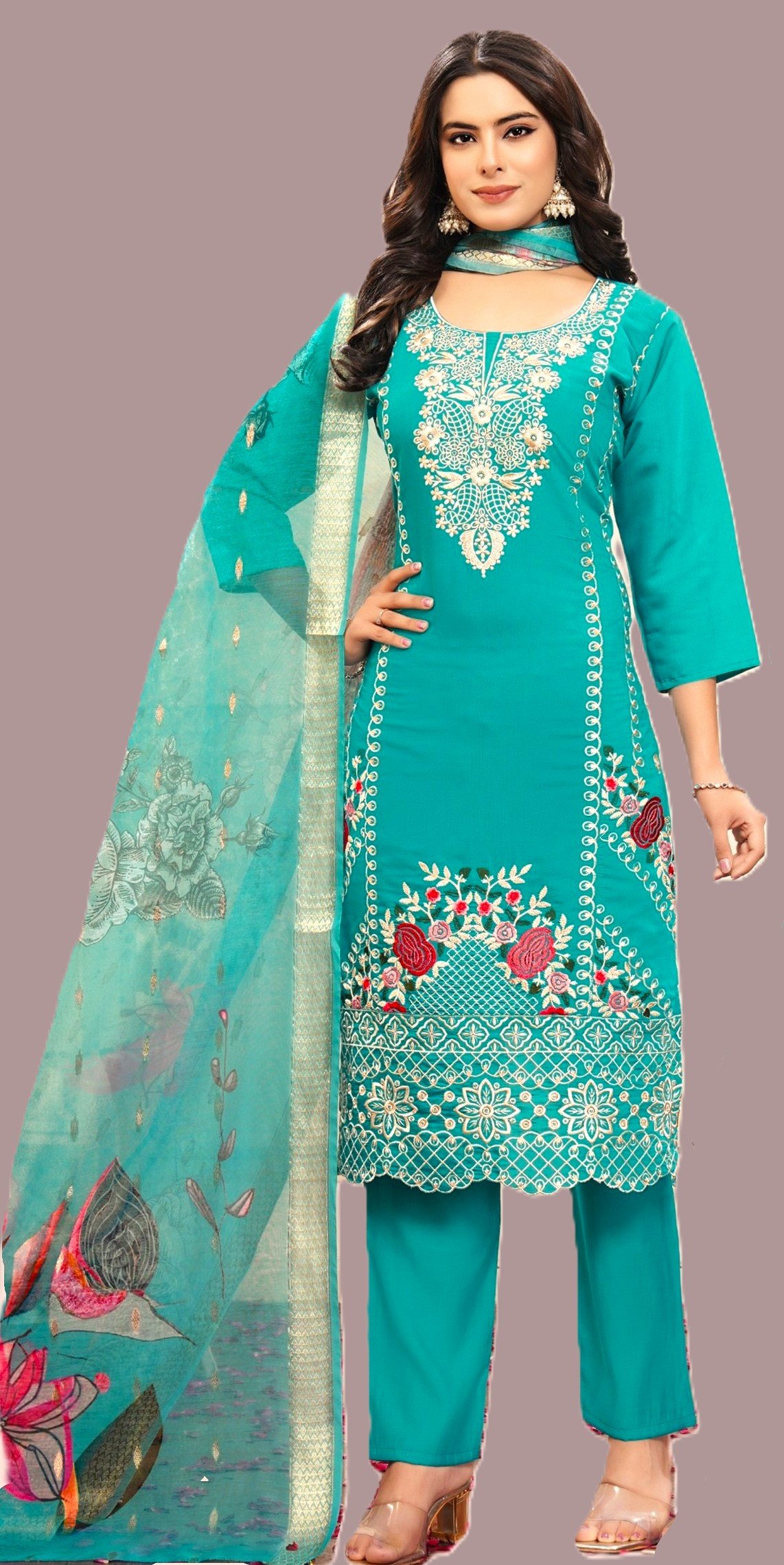 Turn heads with this stunning Teal Blue Roman Silk suit set, a perfect fusion of tradition and trend. Crafted from smooth and breathable Roman silk fabric, the kurta showcases intricate white and multicolor thread embroidery on the front panel and hemline, highlighted with elegant floral motifs and geometric detailing.