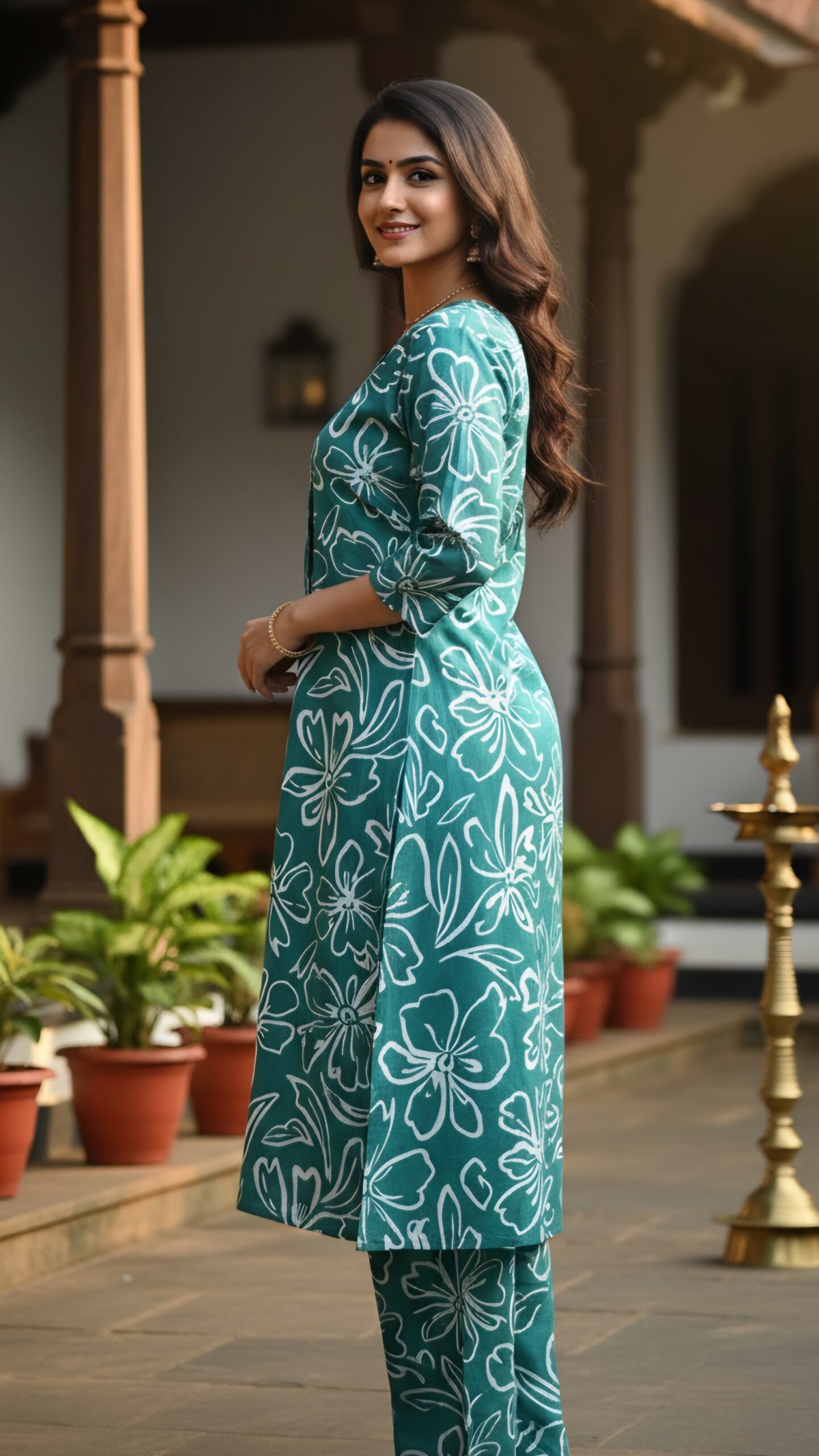 Crafted from a durable and easy-to-maintain synthetic fabric (such as poly-crepe or rayon blend—specify your actual fabric here), this set is breathable, wrinkle-resistant, and perfect for the modern woman on the move. Whether you’re heading to the office, running errands, or meeting friends for coffee, the Teal Bloom Set is your perfect stylish companion.