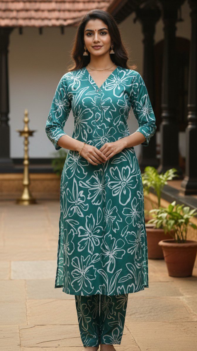 The ensemble includes a comfortable V-neck kurta (tunic) with a straight cut and modest $3/4$ sleeves, making it suitable for year-round wear. The coordinating straight-fit trousers ensure a balanced and flattering silhouette.