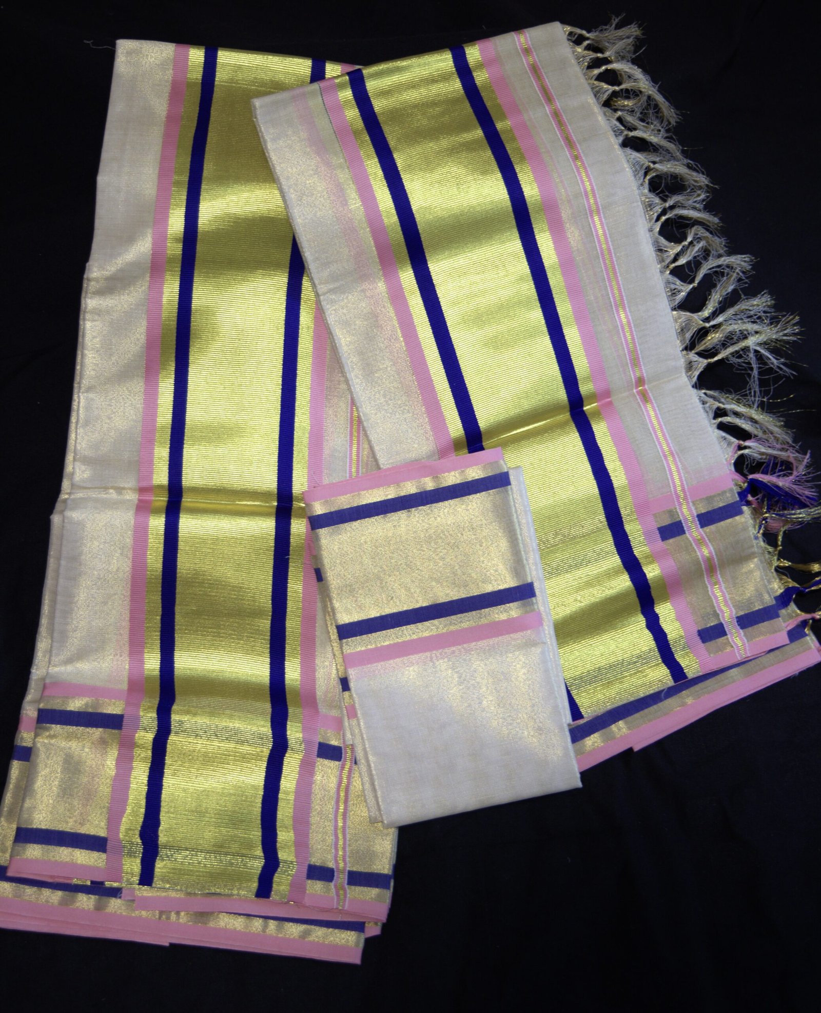 Elevate your traditional wardrobe with this elegant Tissue Set Mundu, a perfect blend of heritage and style. Crafted from premium tissue fabric, this set mundu radiates a soft golden sheen that adds a festive charm to your attire. Designed with delicate pastel pink and bold navy blue borders, highlighted with a vibrant yellow tissue stripe, it brings out a graceful and striking appeal.