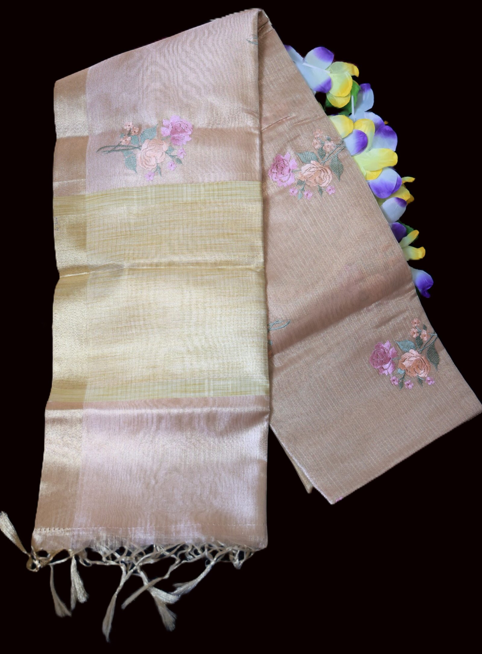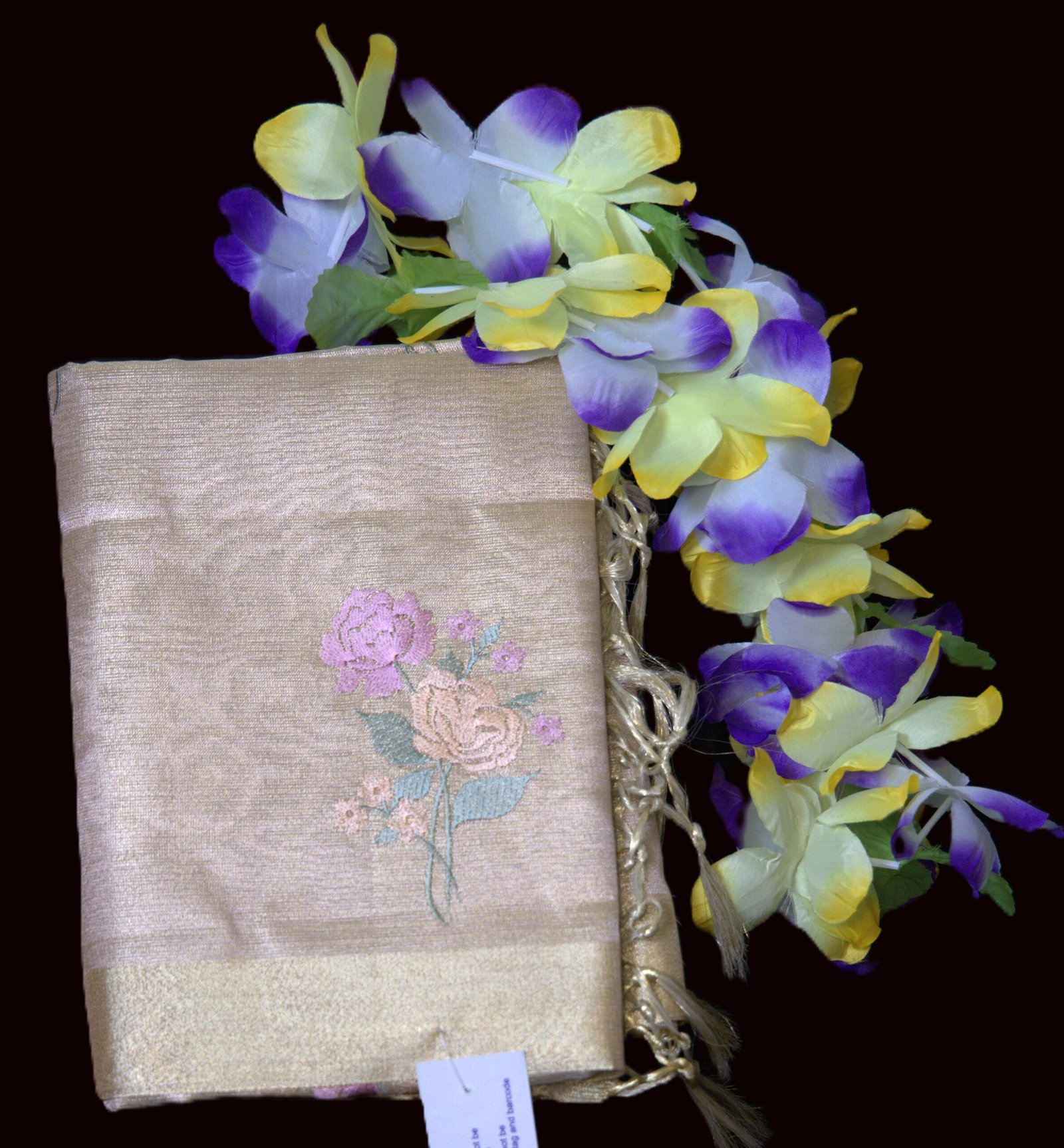 Step into graceful elegance with this stunning Tissue Silk Saree, designed for timeless sophistication. The saree showcases a delicate light golden hue with a lustrous sheer texture unique to premium tissue silk. Adorned with beautifully embroidered pastel floral motifs in soft pink and peach tones, it brings a feminine charm and refined detail to your ethnic ensemble.