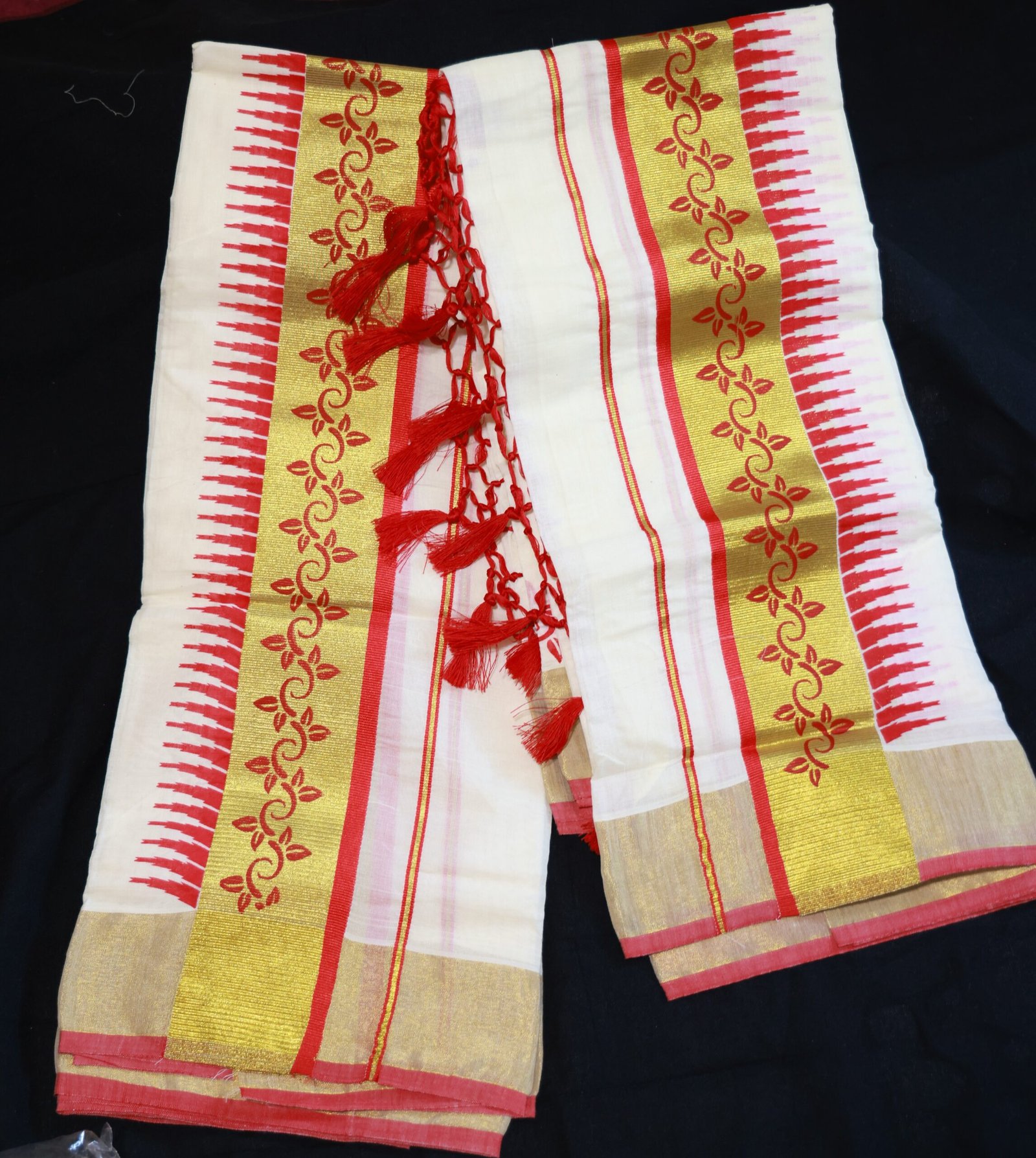 Golden kasavu Zari border with elegant red design highlights
