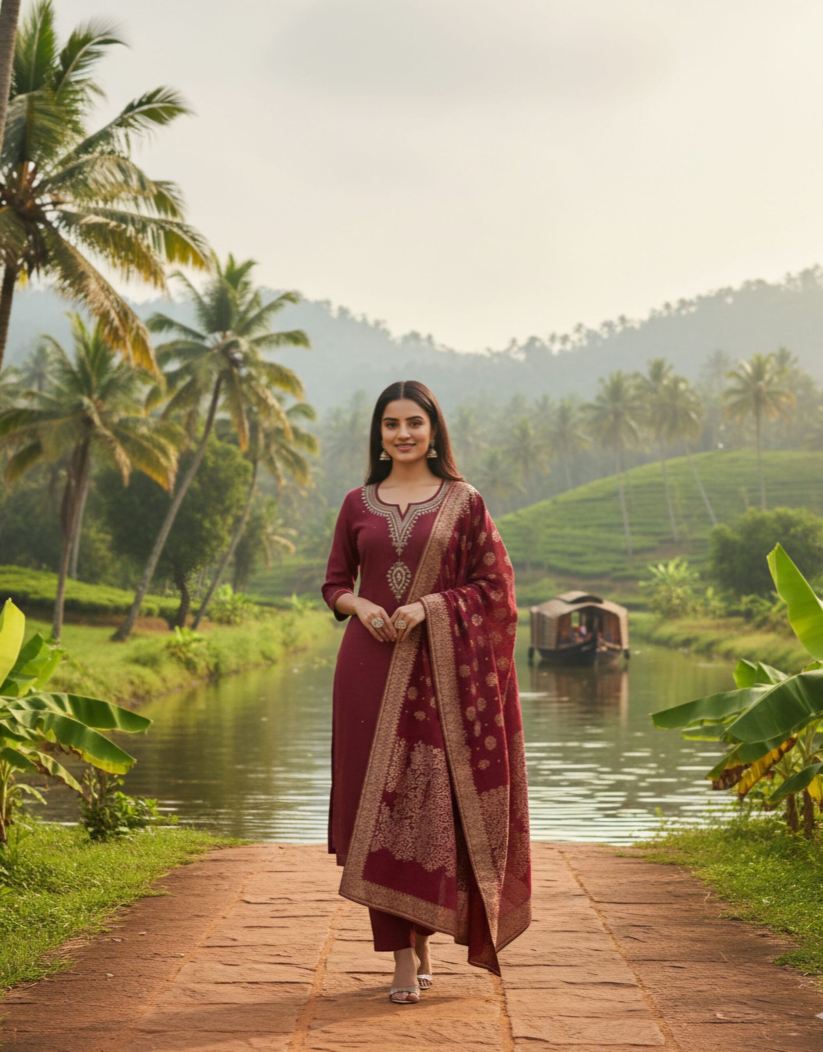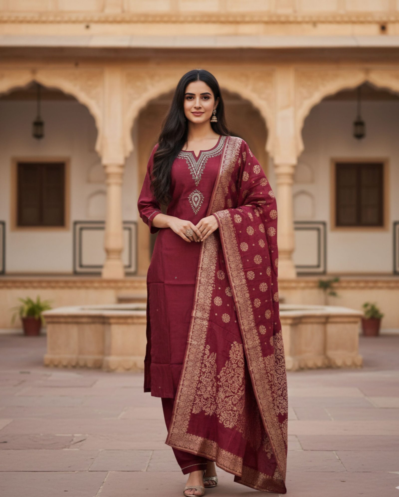This 3-piece silk suit is designed for women who love classic ethnic fashion with a modern touch — effortlessly graceful, comfortable, and luxurious.